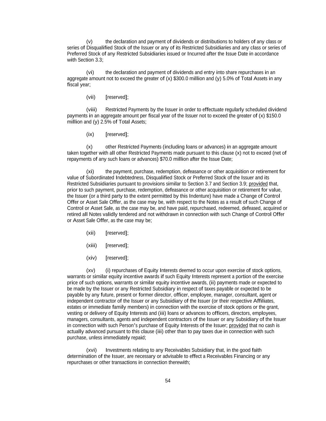 54 (v) the declaration and payment of dividends or distributions to holders of any class or series of Disqualified Stock of the Issuer or any of its Restricted Subsidiaries and any class or series of Preferred Stock of any Restricted Subsidiaries issued or Incurred after the Issue Date in accordance with Section 3.3; (vi) the declaration and payment of dividends and entry into share repurchases in an aggregate amount not to exceed the greater of (x) $300.0 million and (y) 5.0% of Total Assets in any fiscal year; (vii) [reserved]; (viii) Restricted Payments by the Issuer in order to effectuate regularly scheduled dividend payments in an aggregate amount per fiscal year of the Issuer not to exceed the greater of (x) $150.0 million and (y) 2.5% of Total Assets; (ix) [reserved]; (x) other Restricted Payments (including loans or advances) in an aggregate amount taken together with all other Restricted Payments made pursuant to this clause (x) not to exceed (net of repayments of any such loans or advances) $70.0 million after the Issue Date; (xi) the payment, purchase, redemption, defeasance or other acquisition or retirement for value of Subordinated Indebtedness, Disqualified Stock or Preferred Stock of the Issuer and its Restricted Subsidiaries pursuant to provisions similar to Section 3.7 and Section 3.9; provided that, prior to such payment, purchase, redemption, defeasance or other acquisition or retirement for value, the Issuer (or a third party to the extent permitted by this Indenture) have made a Change of Control Offer or Asset Sale Offer, as the case may be, with respect to the Notes as a result of such Change of Control or Asset Sale, as the case may be, and have paid, repurchased, redeemed, defeased, acquired or retired all Notes validly tendered and not withdrawn in connection with such Change of Control Offer or Asset Sale Offer, as the case may be; (xii) [reserved]; (xiii) [reserved]; (xiv) [reserved]; (xv) (i) repurchases of Equity Interests deemed to occur upon exercise of stock options, warrants or similar equity incentive awards if such Equity Interests represent a portion of the exercise price of such options, warrants or similar equity incentive awards, (ii) payments made or expected to be made by the Issuer or any Restricted Subsidiary in respect of taxes payable or expected to be payable by any future, present or former director, officer, employee, manager, consultant, agent or independent contractor of the Issuer or any Subsidiary of the Issuer (or their respective Affiliates, estates or immediate family members) in connection with the exercise of stock options or the grant, vesting or delivery of Equity Interests and (iii) loans or advances to officers, directors, employees, managers, consultants, agents and independent contractors of the Issuer or any Subsidiary of the Issuer in connection with such Person’s purchase of Equity Interests of the Issuer; provided that no cash is actually advanced pursuant to this clause (iii) other than to pay taxes due in connection with such purchase, unless immediately repaid; (xvi) Investments relating to any Receivables Subsidiary that, in the good faith determination of the Issuer, are necessary or advisable to effect a Receivables Financing or any repurchases or other transactions in connection therewith;