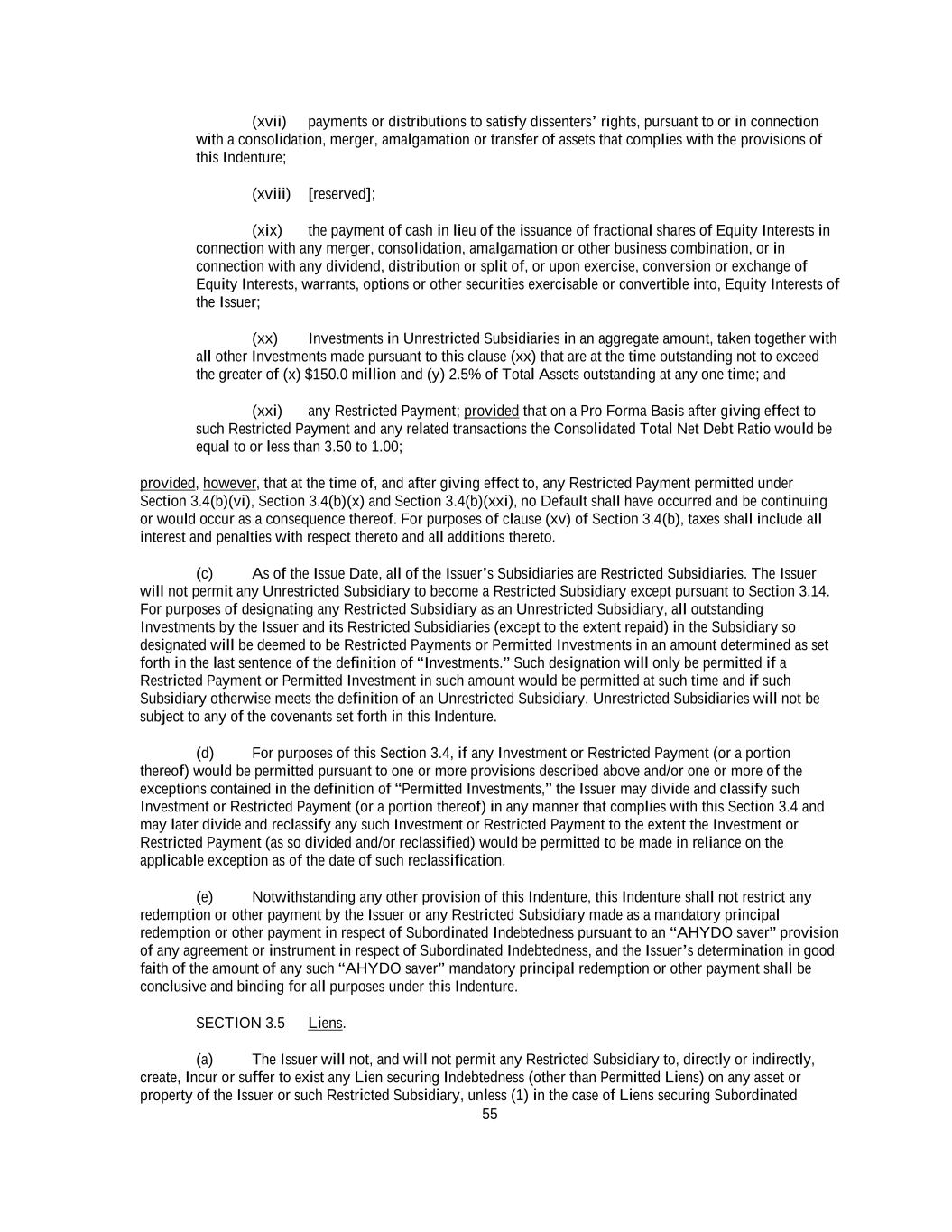 55 (xvii) payments or distributions to satisfy dissenters’ rights, pursuant to or in connection with a consolidation, merger, amalgamation or transfer of assets that complies with the provisions of this Indenture; (xviii) [reserved]; (xix) the payment of cash in lieu of the issuance of fractional shares of Equity Interests in connection with any merger, consolidation, amalgamation or other business combination, or in connection with any dividend, distribution or split of, or upon exercise, conversion or exchange of Equity Interests, warrants, options or other securities exercisable or convertible into, Equity Interests of the Issuer; (xx) Investments in Unrestricted Subsidiaries in an aggregate amount, taken together with all other Investments made pursuant to this clause (xx) that are at the time outstanding not to exceed the greater of (x) $150.0 million and (y) 2.5% of Total Assets outstanding at any one time; and (xxi) any Restricted Payment; provided that on a Pro Forma Basis after giving effect to such Restricted Payment and any related transactions the Consolidated Total Net Debt Ratio would be equal to or less than 3.50 to 1.00; provided, however, that at the time of, and after giving effect to, any Restricted Payment permitted under Section 3.4(b)(vi), Section 3.4(b)(x) and Section 3.4(b)(xxi), no Default shall have occurred and be continuing or would occur as a consequence thereof. For purposes of clause (xv) of Section 3.4(b), taxes shall include all interest and penalties with respect thereto and all additions thereto. (c) As of the Issue Date, all of the Issuer’s Subsidiaries are Restricted Subsidiaries. The Issuer will not permit any Unrestricted Subsidiary to become a Restricted Subsidiary except pursuant to Section 3.14. For purposes of designating any Restricted Subsidiary as an Unrestricted Subsidiary, all outstanding Investments by the Issuer and its Restricted Subsidiaries (except to the extent repaid) in the Subsidiary so designated will be deemed to be Restricted Payments or Permitted Investments in an amount determined as set forth in the last sentence of the definition of “Investments.” Such designation will only be permitted if a Restricted Payment or Permitted Investment in such amount would be permitted at such time and if such Subsidiary otherwise meets the definition of an Unrestricted Subsidiary. Unrestricted Subsidiaries will not be subject to any of the covenants set forth in this Indenture. (d) For purposes of this Section 3.4, if any Investment or Restricted Payment (or a portion thereof) would be permitted pursuant to one or more provisions described above and/or one or more of the exceptions contained in the definition of “Permitted Investments,” the Issuer may divide and classify such Investment or Restricted Payment (or a portion thereof) in any manner that complies with this Section 3.4 and may later divide and reclassify any such Investment or Restricted Payment to the extent the Investment or Restricted Payment (as so divided and/or reclassified) would be permitted to be made in reliance on the applicable exception as of the date of such reclassification. (e) Notwithstanding any other provision of this Indenture, this Indenture shall not restrict any redemption or other payment by the Issuer or any Restricted Subsidiary made as a mandatory principal redemption or other payment in respect of Subordinated Indebtedness pursuant to an “AHYDO saver” provision of any agreement or instrument in respect of Subordinated Indebtedness, and the Issuer’s determination in good faith of the amount of any such “AHYDO saver” mandatory principal redemption or other payment shall be conclusive and binding for all purposes under this Indenture. SECTION 3.5 Liens. (a) The Issuer will not, and will not permit any Restricted Subsidiary to, directly or indirectly, create, Incur or suffer to exist any Lien securing Indebtedness (other than Permitted Liens) on any asset or property of the Issuer or such Restricted Subsidiary, unless (1) in the case of Liens securing Subordinated