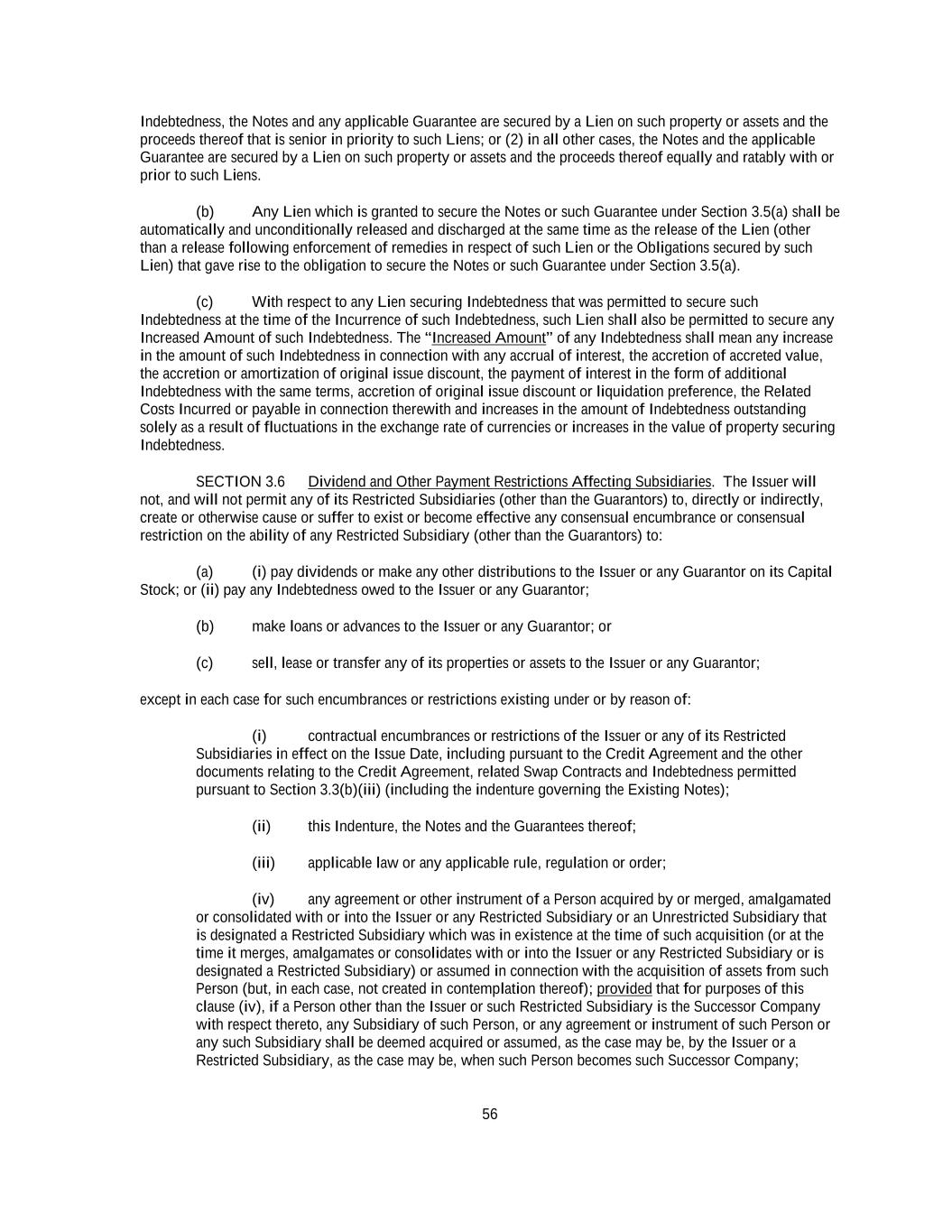 56 Indebtedness, the Notes and any applicable Guarantee are secured by a Lien on such property or assets and the proceeds thereof that is senior in priority to such Liens; or (2) in all other cases, the Notes and the applicable Guarantee are secured by a Lien on such property or assets and the proceeds thereof equally and ratably with or prior to such Liens. (b) Any Lien which is granted to secure the Notes or such Guarantee under Section 3.5(a) shall be automatically and unconditionally released and discharged at the same time as the release of the Lien (other than a release following enforcement of remedies in respect of such Lien or the Obligations secured by such Lien) that gave rise to the obligation to secure the Notes or such Guarantee under Section 3.5(a). (c) With respect to any Lien securing Indebtedness that was permitted to secure such Indebtedness at the time of the Incurrence of such Indebtedness, such Lien shall also be permitted to secure any Increased Amount of such Indebtedness. The “Increased Amount” of any Indebtedness shall mean any increase in the amount of such Indebtedness in connection with any accrual of interest, the accretion of accreted value, the accretion or amortization of original issue discount, the payment of interest in the form of additional Indebtedness with the same terms, accretion of original issue discount or liquidation preference, the Related Costs Incurred or payable in connection therewith and increases in the amount of Indebtedness outstanding solely as a result of fluctuations in the exchange rate of currencies or increases in the value of property securing Indebtedness. SECTION 3.6 Dividend and Other Payment Restrictions Affecting Subsidiaries. The Issuer will not, and will not permit any of its Restricted Subsidiaries (other than the Guarantors) to, directly or indirectly, create or otherwise cause or suffer to exist or become effective any consensual encumbrance or consensual restriction on the ability of any Restricted Subsidiary (other than the Guarantors) to: (a) (i) pay dividends or make any other distributions to the Issuer or any Guarantor on its Capital Stock; or (ii) pay any Indebtedness owed to the Issuer or any Guarantor; (b) make loans or advances to the Issuer or any Guarantor; or (c) sell, lease or transfer any of its properties or assets to the Issuer or any Guarantor; except in each case for such encumbrances or restrictions existing under or by reason of: (i) contractual encumbrances or restrictions of the Issuer or any of its Restricted Subsidiaries in effect on the Issue Date, including pursuant to the Credit Agreement and the other documents relating to the Credit Agreement, related Swap Contracts and Indebtedness permitted pursuant to Section 3.3(b)(iii) (including the indenture governing the Existing Notes); (ii) this Indenture, the Notes and the Guarantees thereof; (iii) applicable law or any applicable rule, regulation or order; (iv) any agreement or other instrument of a Person acquired by or merged, amalgamated or consolidated with or into the Issuer or any Restricted Subsidiary or an Unrestricted Subsidiary that is designated a Restricted Subsidiary which was in existence at the time of such acquisition (or at the time it merges, amalgamates or consolidates with or into the Issuer or any Restricted Subsidiary or is designated a Restricted Subsidiary) or assumed in connection with the acquisition of assets from such Person (but, in each case, not created in contemplation thereof); provided that for purposes of this clause (iv), if a Person other than the Issuer or such Restricted Subsidiary is the Successor Company with respect thereto, any Subsidiary of such Person, or any agreement or instrument of such Person or any such Subsidiary shall be deemed acquired or assumed, as the case may be, by the Issuer or a Restricted Subsidiary, as the case may be, when such Person becomes such Successor Company;