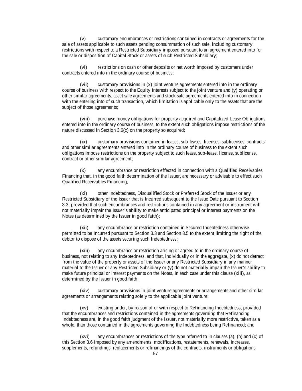 57 (v) customary encumbrances or restrictions contained in contracts or agreements for the sale of assets applicable to such assets pending consummation of such sale, including customary restrictions with respect to a Restricted Subsidiary imposed pursuant to an agreement entered into for the sale or disposition of Capital Stock or assets of such Restricted Subsidiary; (vi) restrictions on cash or other deposits or net worth imposed by customers under contracts entered into in the ordinary course of business; (vii) customary provisions in (x) joint venture agreements entered into in the ordinary course of business with respect to the Equity Interests subject to the joint venture and (y) operating or other similar agreements, asset sale agreements and stock sale agreements entered into in connection with the entering into of such transaction, which limitation is applicable only to the assets that are the subject of those agreements; (viii) purchase money obligations for property acquired and Capitalized Lease Obligations entered into in the ordinary course of business, to the extent such obligations impose restrictions of the nature discussed in Section 3.6(c) on the property so acquired; (ix) customary provisions contained in leases, sub-leases, licenses, sublicenses, contracts and other similar agreements entered into in the ordinary course of business to the extent such obligations impose restrictions on the property subject to such lease, sub-lease, license, sublicense, contract or other similar agreement; (x) any encumbrance or restriction effected in connection with a Qualified Receivables Financing that, in the good faith determination of the Issuer, are necessary or advisable to effect such Qualified Receivables Financing; (xi) other Indebtedness, Disqualified Stock or Preferred Stock of the Issuer or any Restricted Subsidiary of the Issuer that is Incurred subsequent to the Issue Date pursuant to Section 3.3; provided that such encumbrances and restrictions contained in any agreement or instrument will not materially impair the Issuer’s ability to make anticipated principal or interest payments on the Notes (as determined by the Issuer in good faith); (xii) any encumbrance or restriction contained in Secured Indebtedness otherwise permitted to be Incurred pursuant to Section 3.3 and Section 3.5 to the extent limiting the right of the debtor to dispose of the assets securing such Indebtedness; (xiii) any encumbrance or restriction arising or agreed to in the ordinary course of business, not relating to any Indebtedness, and that, individually or in the aggregate, (x) do not detract from the value of the property or assets of the Issuer or any Restricted Subsidiary in any manner material to the Issuer or any Restricted Subsidiary or (y) do not materially impair the Issuer’s ability to make future principal or interest payments on the Notes, in each case under this clause (xiii), as determined by the Issuer in good faith; (xiv) customary provisions in joint venture agreements or arrangements and other similar agreements or arrangements relating solely to the applicable joint venture; (xv) existing under, by reason of or with respect to Refinancing Indebtedness; provided that the encumbrances and restrictions contained in the agreements governing that Refinancing Indebtedness are, in the good faith judgment of the Issuer, not materially more restrictive, taken as a whole, than those contained in the agreements governing the Indebtedness being Refinanced; and (xvi) any encumbrances or restrictions of the type referred to in clauses (a), (b) and (c) of this Section 3.6 imposed by any amendments, modifications, restatements, renewals, increases, supplements, refundings, replacements or refinancings of the contracts, instruments or obligations