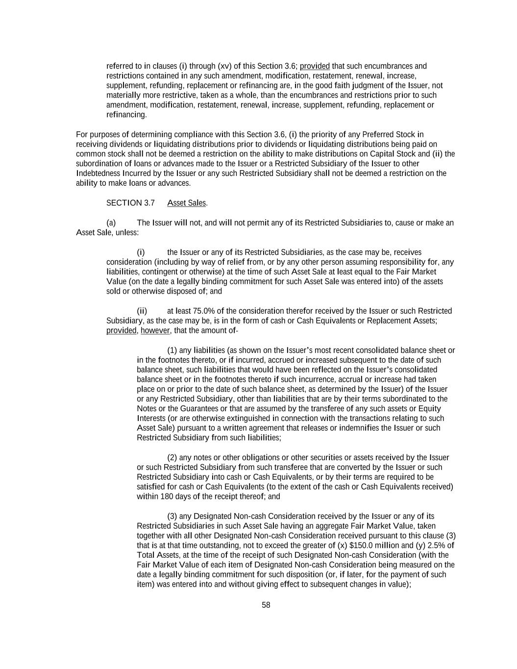 58 referred to in clauses (i) through (xv) of this Section 3.6; provided that such encumbrances and restrictions contained in any such amendment, modification, restatement, renewal, increase, supplement, refunding, replacement or refinancing are, in the good faith judgment of the Issuer, not materially more restrictive, taken as a whole, than the encumbrances and restrictions prior to such amendment, modification, restatement, renewal, increase, supplement, refunding, replacement or refinancing. For purposes of determining compliance with this Section 3.6, (i) the priority of any Preferred Stock in receiving dividends or liquidating distributions prior to dividends or liquidating distributions being paid on common stock shall not be deemed a restriction on the ability to make distributions on Capital Stock and (ii) the subordination of loans or advances made to the Issuer or a Restricted Subsidiary of the Issuer to other Indebtedness Incurred by the Issuer or any such Restricted Subsidiary shall not be deemed a restriction on the ability to make loans or advances. SECTION 3.7 Asset Sales. (a) The Issuer will not, and will not permit any of its Restricted Subsidiaries to, cause or make an Asset Sale, unless: (i) the Issuer or any of its Restricted Subsidiaries, as the case may be, receives consideration (including by way of relief from, or by any other person assuming responsibility for, any liabilities, contingent or otherwise) at the time of such Asset Sale at least equal to the Fair Market Value (on the date a legally binding commitment for such Asset Sale was entered into) of the assets sold or otherwise disposed of; and (ii) at least 75.0% of the consideration therefor received by the Issuer or such Restricted Subsidiary, as the case may be, is in the form of cash or Cash Equivalents or Replacement Assets; provided, however, that the amount of- (1) any liabilities (as shown on the Issuer’s most recent consolidated balance sheet or in the footnotes thereto, or if incurred, accrued or increased subsequent to the date of such balance sheet, such liabilities that would have been reflected on the Issuer’s consolidated balance sheet or in the footnotes thereto if such incurrence, accrual or increase had taken place on or prior to the date of such balance sheet, as determined by the Issuer) of the Issuer or any Restricted Subsidiary, other than liabilities that are by their terms subordinated to the Notes or the Guarantees or that are assumed by the transferee of any such assets or Equity Interests (or are otherwise extinguished in connection with the transactions relating to such Asset Sale) pursuant to a written agreement that releases or indemnifies the Issuer or such Restricted Subsidiary from such liabilities; (2) any notes or other obligations or other securities or assets received by the Issuer or such Restricted Subsidiary from such transferee that are converted by the Issuer or such Restricted Subsidiary into cash or Cash Equivalents, or by their terms are required to be satisfied for cash or Cash Equivalents (to the extent of the cash or Cash Equivalents received) within 180 days of the receipt thereof; and (3) any Designated Non-cash Consideration received by the Issuer or any of its Restricted Subsidiaries in such Asset Sale having an aggregate Fair Market Value, taken together with all other Designated Non-cash Consideration received pursuant to this clause (3) that is at that time outstanding, not to exceed the greater of (x) $150.0 million and (y) 2.5% of Total Assets, at the time of the receipt of such Designated Non-cash Consideration (with the Fair Market Value of each item of Designated Non-cash Consideration being measured on the date a legally binding commitment for such disposition (or, if later, for the payment of such item) was entered into and without giving effect to subsequent changes in value);