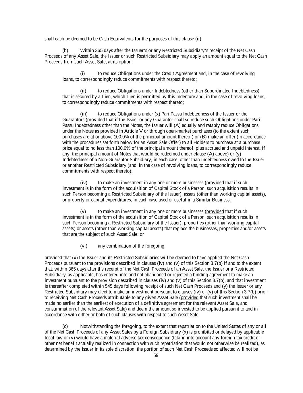 59 shall each be deemed to be Cash Equivalents for the purposes of this clause (ii). (b) Within 365 days after the Issuer’s or any Restricted Subsidiary’s receipt of the Net Cash Proceeds of any Asset Sale, the Issuer or such Restricted Subsidiary may apply an amount equal to the Net Cash Proceeds from such Asset Sale, at its option: (i) to reduce Obligations under the Credit Agreement and, in the case of revolving loans, to correspondingly reduce commitments with respect thereto; (ii) to reduce Obligations under Indebtedness (other than Subordinated Indebtedness) that is secured by a Lien, which Lien is permitted by this Indenture and, in the case of revolving loans, to correspondingly reduce commitments with respect thereto; (iii) to reduce Obligations under (x) Pari Passu Indebtedness of the Issuer or the Guarantors (provided that if the Issuer or any Guarantor shall so reduce such Obligations under Pari Passu Indebtedness other than the Notes, the Issuer will (A) equally and ratably reduce Obligations under the Notes as provided in Article V or through open-market purchases (to the extent such purchases are at or above 100.0% of the principal amount thereof) or (B) make an offer (in accordance with the procedures set forth below for an Asset Sale Offer) to all Holders to purchase at a purchase price equal to no less than 100.0% of the principal amount thereof, plus accrued and unpaid interest, if any, the principal amount of Notes that would be redeemed under clause (A) above) or (y) Indebtedness of a Non-Guarantor Subsidiary, in each case, other than Indebtedness owed to the Issuer or another Restricted Subsidiary (and, in the case of revolving loans, to correspondingly reduce commitments with respect thereto); (iv) to make an investment in any one or more businesses (provided that if such investment is in the form of the acquisition of Capital Stock of a Person, such acquisition results in such Person becoming a Restricted Subsidiary of the Issuer), assets (other than working capital assets), or property or capital expenditures, in each case used or useful in a Similar Business; (v) to make an investment in any one or more businesses (provided that if such investment is in the form of the acquisition of Capital Stock of a Person, such acquisition results in such Person becoming a Restricted Subsidiary of the Issuer), properties (other than working capital assets) or assets (other than working capital assets) that replace the businesses, properties and/or assets that are the subject of such Asset Sale; or (vi) any combination of the foregoing; provided that (x) the Issuer and its Restricted Subsidiaries will be deemed to have applied the Net Cash Proceeds pursuant to the provisions described in clauses (iv) and (v) of this Section 3.7(b) if and to the extent that, within 365 days after the receipt of the Net Cash Proceeds of an Asset Sale, the Issuer or a Restricted Subsidiary, as applicable, has entered into and not abandoned or rejected a binding agreement to make an investment pursuant to the provision described in clauses (iv) and (v) of this Section 3.7(b), and that investment is thereafter completed within 545 days following receipt of such Net Cash Proceeds and (y) the Issuer or any Restricted Subsidiary may elect to make an investment pursuant to clauses (iv) or (v) of this Section 3.7(b) prior to receiving Net Cash Proceeds attributable to any given Asset Sale (provided that such investment shall be made no earlier than the earliest of execution of a definitive agreement for the relevant Asset Sale, and consummation of the relevant Asset Sale) and deem the amount so invested to be applied pursuant to and in accordance with either or both of such clauses with respect to such Asset Sale. (c) Notwithstanding the foregoing, to the extent that repatriation to the United States of any or all of the Net Cash Proceeds of any Asset Sales by a Foreign Subsidiary (x) is prohibited or delayed by applicable local law or (y) would have a material adverse tax consequence (taking into account any foreign tax credit or other net benefit actually realized in connection with such repatriation that would not otherwise be realized), as determined by the Issuer in its sole discretion, the portion of such Net Cash Proceeds so affected will not be