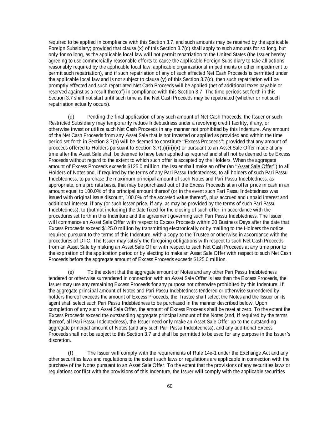 60 required to be applied in compliance with this Section 3.7, and such amounts may be retained by the applicable Foreign Subsidiary; provided that clause (x) of this Section 3.7(c) shall apply to such amounts for so long, but only for so long, as the applicable local law will not permit repatriation to the United States (the Issuer hereby agreeing to use commercially reasonable efforts to cause the applicable Foreign Subsidiary to take all actions reasonably required by the applicable local law, applicable organizational impediments or other impediment to permit such repatriation), and if such repatriation of any of such affected Net Cash Proceeds is permitted under the applicable local law and is not subject to clause (y) of this Section 3.7(c), then such repatriation will be promptly effected and such repatriated Net Cash Proceeds will be applied (net of additional taxes payable or reserved against as a result thereof) in compliance with this Section 3.7. The time periods set forth in this Section 3.7 shall not start until such time as the Net Cash Proceeds may be repatriated (whether or not such repatriation actually occurs). (d) Pending the final application of any such amount of Net Cash Proceeds, the Issuer or such Restricted Subsidiary may temporarily reduce Indebtedness under a revolving credit facility, if any, or otherwise invest or utilize such Net Cash Proceeds in any manner not prohibited by this Indenture. Any amount of the Net Cash Proceeds from any Asset Sale that is not invested or applied as provided and within the time period set forth in Section 3.7(b) will be deemed to constitute “Excess Proceeds”; provided that any amount of proceeds offered to Holders pursuant to Section 3.7(b)(iii)(x) or pursuant to an Asset Sale Offer made at any time after the Asset Sale shall be deemed to have been applied as required and shall not be deemed to be Excess Proceeds without regard to the extent to which such offer is accepted by the Holders. When the aggregate amount of Excess Proceeds exceeds $125.0 million, the Issuer shall make an offer (an “Asset Sale Offer”) to all Holders of Notes and, if required by the terms of any Pari Passu Indebtedness, to all holders of such Pari Passu Indebtedness, to purchase the maximum principal amount of such Notes and Pari Passu Indebtedness, as appropriate, on a pro rata basis, that may be purchased out of the Excess Proceeds at an offer price in cash in an amount equal to 100.0% of the principal amount thereof (or in the event such Pari Passu Indebtedness was issued with original issue discount, 100.0% of the accreted value thereof), plus accrued and unpaid interest and additional interest, if any (or such lesser price, if any, as may be provided by the terms of such Pari Passu Indebtedness), to (but not including) the date fixed for the closing of such offer, in accordance with the procedures set forth in this Indenture and the agreement governing such Pari Passu Indebtedness. The Issuer will commence an Asset Sale Offer with respect to Excess Proceeds within 30 Business Days after the date that Excess Proceeds exceed $125.0 million by transmitting electronically or by mailing to the Holders the notice required pursuant to the terms of this Indenture, with a copy to the Trustee or otherwise in accordance with the procedures of DTC. The Issuer may satisfy the foregoing obligations with respect to such Net Cash Proceeds from an Asset Sale by making an Asset Sale Offer with respect to such Net Cash Proceeds at any time prior to the expiration of the application period or by electing to make an Asset Sale Offer with respect to such Net Cash Proceeds before the aggregate amount of Excess Proceeds exceeds $125.0 million. (e) To the extent that the aggregate amount of Notes and any other Pari Passu Indebtedness tendered or otherwise surrendered in connection with an Asset Sale Offer is less than the Excess Proceeds, the Issuer may use any remaining Excess Proceeds for any purpose not otherwise prohibited by this Indenture. If the aggregate principal amount of Notes and Pari Passu Indebtedness tendered or otherwise surrendered by holders thereof exceeds the amount of Excess Proceeds, the Trustee shall select the Notes and the Issuer or its agent shall select such Pari Passu Indebtedness to be purchased in the manner described below. Upon completion of any such Asset Sale Offer, the amount of Excess Proceeds shall be reset at zero. To the extent the Excess Proceeds exceed the outstanding aggregate principal amount of the Notes (and, if required by the terms thereof, all Pari Passu Indebtedness), the Issuer need only make an Asset Sale Offer up to the outstanding aggregate principal amount of Notes (and any such Pari Passu Indebtedness), and any additional Excess Proceeds shall not be subject to this Section 3.7 and shall be permitted to be used for any purpose in the Issuer’s discretion. (f) The Issuer will comply with the requirements of Rule 14e-1 under the Exchange Act and any other securities laws and regulations to the extent such laws or regulations are applicable in connection with the purchase of the Notes pursuant to an Asset Sale Offer. To the extent that the provisions of any securities laws or regulations conflict with the provisions of this Indenture, the Issuer will comply with the applicable securities
