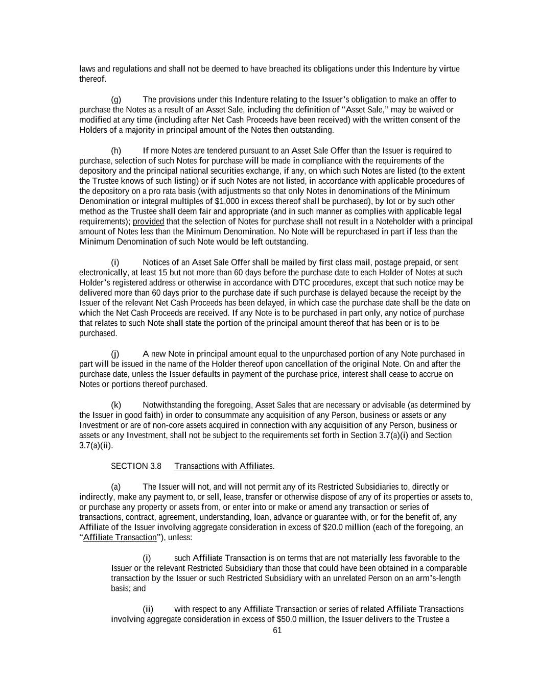 61 laws and regulations and shall not be deemed to have breached its obligations under this Indenture by virtue thereof. (g) The provisions under this Indenture relating to the Issuer’s obligation to make an offer to purchase the Notes as a result of an Asset Sale, including the definition of “Asset Sale,” may be waived or modified at any time (including after Net Cash Proceeds have been received) with the written consent of the Holders of a majority in principal amount of the Notes then outstanding. (h) If more Notes are tendered pursuant to an Asset Sale Offer than the Issuer is required to purchase, selection of such Notes for purchase will be made in compliance with the requirements of the depository and the principal national securities exchange, if any, on which such Notes are listed (to the extent the Trustee knows of such listing) or if such Notes are not listed, in accordance with applicable procedures of the depository on a pro rata basis (with adjustments so that only Notes in denominations of the Minimum Denomination or integral multiples of $1,000 in excess thereof shall be purchased), by lot or by such other method as the Trustee shall deem fair and appropriate (and in such manner as complies with applicable legal requirements); provided that the selection of Notes for purchase shall not result in a Noteholder with a principal amount of Notes less than the Minimum Denomination. No Note will be repurchased in part if less than the Minimum Denomination of such Note would be left outstanding. (i) Notices of an Asset Sale Offer shall be mailed by first class mail, postage prepaid, or sent electronically, at least 15 but not more than 60 days before the purchase date to each Holder of Notes at such Holder’s registered address or otherwise in accordance with DTC procedures, except that such notice may be delivered more than 60 days prior to the purchase date if such purchase is delayed because the receipt by the Issuer of the relevant Net Cash Proceeds has been delayed, in which case the purchase date shall be the date on which the Net Cash Proceeds are received. If any Note is to be purchased in part only, any notice of purchase that relates to such Note shall state the portion of the principal amount thereof that has been or is to be purchased. (j) A new Note in principal amount equal to the unpurchased portion of any Note purchased in part will be issued in the name of the Holder thereof upon cancellation of the original Note. On and after the purchase date, unless the Issuer defaults in payment of the purchase price, interest shall cease to accrue on Notes or portions thereof purchased. (k) Notwithstanding the foregoing, Asset Sales that are necessary or advisable (as determined by the Issuer in good faith) in order to consummate any acquisition of any Person, business or assets or any Investment or are of non-core assets acquired in connection with any acquisition of any Person, business or assets or any Investment, shall not be subject to the requirements set forth in Section 3.7(a)(i) and Section 3.7(a)(ii). SECTION 3.8 Transactions with Affiliates. (a) The Issuer will not, and will not permit any of its Restricted Subsidiaries to, directly or indirectly, make any payment to, or sell, lease, transfer or otherwise dispose of any of its properties or assets to, or purchase any property or assets from, or enter into or make or amend any transaction or series of transactions, contract, agreement, understanding, loan, advance or guarantee with, or for the benefit of, any Affiliate of the Issuer involving aggregate consideration in excess of $20.0 million (each of the foregoing, an “Affiliate Transaction”), unless: (i) such Affiliate Transaction is on terms that are not materially less favorable to the Issuer or the relevant Restricted Subsidiary than those that could have been obtained in a comparable transaction by the Issuer or such Restricted Subsidiary with an unrelated Person on an arm’s-length basis; and (ii) with respect to any Affiliate Transaction or series of related Affiliate Transactions involving aggregate consideration in excess of $50.0 million, the Issuer delivers to the Trustee a