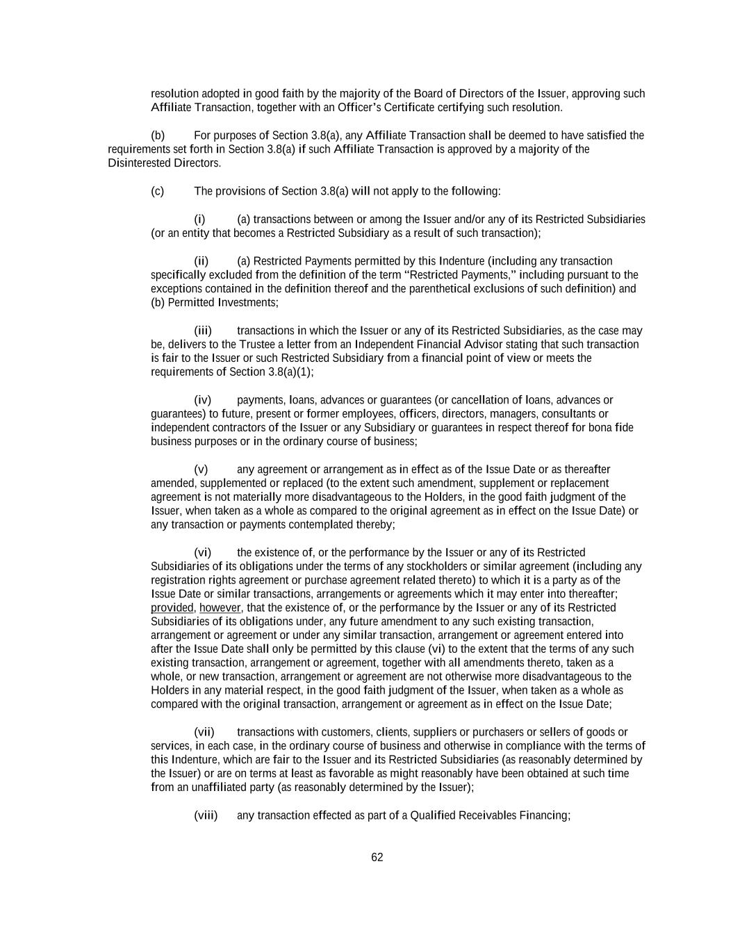 62 resolution adopted in good faith by the majority of the Board of Directors of the Issuer, approving such Affiliate Transaction, together with an Officer’s Certificate certifying such resolution. (b) For purposes of Section 3.8(a), any Affiliate Transaction shall be deemed to have satisfied the requirements set forth in Section 3.8(a) if such Affiliate Transaction is approved by a majority of the Disinterested Directors. (c) The provisions of Section 3.8(a) will not apply to the following: (i) (a) transactions between or among the Issuer and/or any of its Restricted Subsidiaries (or an entity that becomes a Restricted Subsidiary as a result of such transaction); (ii) (a) Restricted Payments permitted by this Indenture (including any transaction specifically excluded from the definition of the term “Restricted Payments,” including pursuant to the exceptions contained in the definition thereof and the parenthetical exclusions of such definition) and (b) Permitted Investments; (iii) transactions in which the Issuer or any of its Restricted Subsidiaries, as the case may be, delivers to the Trustee a letter from an Independent Financial Advisor stating that such transaction is fair to the Issuer or such Restricted Subsidiary from a financial point of view or meets the requirements of Section 3.8(a)(1); (iv) payments, loans, advances or guarantees (or cancellation of loans, advances or guarantees) to future, present or former employees, officers, directors, managers, consultants or independent contractors of the Issuer or any Subsidiary or guarantees in respect thereof for bona fide business purposes or in the ordinary course of business; (v) any agreement or arrangement as in effect as of the Issue Date or as thereafter amended, supplemented or replaced (to the extent such amendment, supplement or replacement agreement is not materially more disadvantageous to the Holders, in the good faith judgment of the Issuer, when taken as a whole as compared to the original agreement as in effect on the Issue Date) or any transaction or payments contemplated thereby; (vi) the existence of, or the performance by the Issuer or any of its Restricted Subsidiaries of its obligations under the terms of any stockholders or similar agreement (including any registration rights agreement or purchase agreement related thereto) to which it is a party as of the Issue Date or similar transactions, arrangements or agreements which it may enter into thereafter; provided, however, that the existence of, or the performance by the Issuer or any of its Restricted Subsidiaries of its obligations under, any future amendment to any such existing transaction, arrangement or agreement or under any similar transaction, arrangement or agreement entered into after the Issue Date shall only be permitted by this clause (vi) to the extent that the terms of any such existing transaction, arrangement or agreement, together with all amendments thereto, taken as a whole, or new transaction, arrangement or agreement are not otherwise more disadvantageous to the Holders in any material respect, in the good faith judgment of the Issuer, when taken as a whole as compared with the original transaction, arrangement or agreement as in effect on the Issue Date; (vii) transactions with customers, clients, suppliers or purchasers or sellers of goods or services, in each case, in the ordinary course of business and otherwise in compliance with the terms of this Indenture, which are fair to the Issuer and its Restricted Subsidiaries (as reasonably determined by the Issuer) or are on terms at least as favorable as might reasonably have been obtained at such time from an unaffiliated party (as reasonably determined by the Issuer); (viii) any transaction effected as part of a Qualified Receivables Financing;