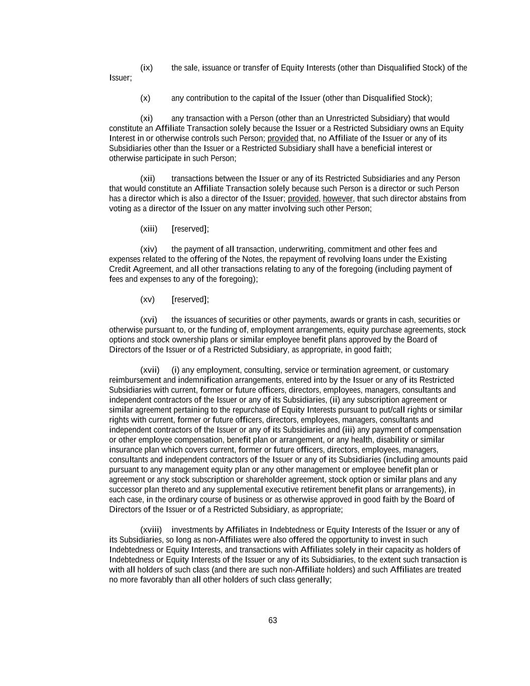 63 (ix) the sale, issuance or transfer of Equity Interests (other than Disqualified Stock) of the Issuer; (x) any contribution to the capital of the Issuer (other than Disqualified Stock); (xi) any transaction with a Person (other than an Unrestricted Subsidiary) that would constitute an Affiliate Transaction solely because the Issuer or a Restricted Subsidiary owns an Equity Interest in or otherwise controls such Person; provided that, no Affiliate of the Issuer or any of its Subsidiaries other than the Issuer or a Restricted Subsidiary shall have a beneficial interest or otherwise participate in such Person; (xii) transactions between the Issuer or any of its Restricted Subsidiaries and any Person that would constitute an Affiliate Transaction solely because such Person is a director or such Person has a director which is also a director of the Issuer; provided, however, that such director abstains from voting as a director of the Issuer on any matter involving such other Person; (xiii) [reserved]; (xiv) the payment of all transaction, underwriting, commitment and other fees and expenses related to the offering of the Notes, the repayment of revolving loans under the Existing Credit Agreement, and all other transactions relating to any of the foregoing (including payment of fees and expenses to any of the foregoing); (xv) [reserved]; (xvi) the issuances of securities or other payments, awards or grants in cash, securities or otherwise pursuant to, or the funding of, employment arrangements, equity purchase agreements, stock options and stock ownership plans or similar employee benefit plans approved by the Board of Directors of the Issuer or of a Restricted Subsidiary, as appropriate, in good faith; (xvii) (i) any employment, consulting, service or termination agreement, or customary reimbursement and indemnification arrangements, entered into by the Issuer or any of its Restricted Subsidiaries with current, former or future officers, directors, employees, managers, consultants and independent contractors of the Issuer or any of its Subsidiaries, (ii) any subscription agreement or similar agreement pertaining to the repurchase of Equity Interests pursuant to put/call rights or similar rights with current, former or future officers, directors, employees, managers, consultants and independent contractors of the Issuer or any of its Subsidiaries and (iii) any payment of compensation or other employee compensation, benefit plan or arrangement, or any health, disability or similar insurance plan which covers current, former or future officers, directors, employees, managers, consultants and independent contractors of the Issuer or any of its Subsidiaries (including amounts paid pursuant to any management equity plan or any other management or employee benefit plan or agreement or any stock subscription or shareholder agreement, stock option or similar plans and any successor plan thereto and any supplemental executive retirement benefit plans or arrangements), in each case, in the ordinary course of business or as otherwise approved in good faith by the Board of Directors of the Issuer or of a Restricted Subsidiary, as appropriate; (xviii) investments by Affiliates in Indebtedness or Equity Interests of the Issuer or any of its Subsidiaries, so long as non-Affiliates were also offered the opportunity to invest in such Indebtedness or Equity Interests, and transactions with Affiliates solely in their capacity as holders of Indebtedness or Equity Interests of the Issuer or any of its Subsidiaries, to the extent such transaction is with all holders of such class (and there are such non-Affiliate holders) and such Affiliates are treated no more favorably than all other holders of such class generally;