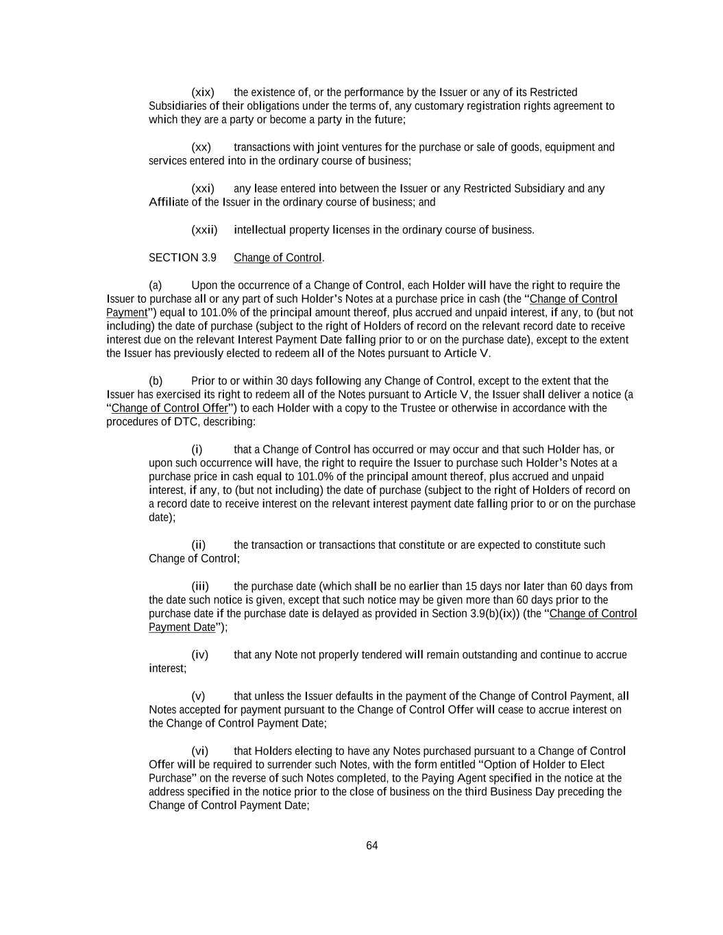 64 (xix) the existence of, or the performance by the Issuer or any of its Restricted Subsidiaries of their obligations under the terms of, any customary registration rights agreement to which they are a party or become a party in the future; (xx) transactions with joint ventures for the purchase or sale of goods, equipment and services entered into in the ordinary course of business; (xxi) any lease entered into between the Issuer or any Restricted Subsidiary and any Affiliate of the Issuer in the ordinary course of business; and (xxii) intellectual property licenses in the ordinary course of business. SECTION 3.9 Change of Control. (a) Upon the occurrence of a Change of Control, each Holder will have the right to require the Issuer to purchase all or any part of such Holder’s Notes at a purchase price in cash (the “Change of Control Payment”) equal to 101.0% of the principal amount thereof, plus accrued and unpaid interest, if any, to (but not including) the date of purchase (subject to the right of Holders of record on the relevant record date to receive interest due on the relevant Interest Payment Date falling prior to or on the purchase date), except to the extent the Issuer has previously elected to redeem all of the Notes pursuant to Article V. (b) Prior to or within 30 days following any Change of Control, except to the extent that the Issuer has exercised its right to redeem all of the Notes pursuant to Article V, the Issuer shall deliver a notice (a “Change of Control Offer”) to each Holder with a copy to the Trustee or otherwise in accordance with the procedures of DTC, describing: (i) that a Change of Control has occurred or may occur and that such Holder has, or upon such occurrence will have, the right to require the Issuer to purchase such Holder’s Notes at a purchase price in cash equal to 101.0% of the principal amount thereof, plus accrued and unpaid interest, if any, to (but not including) the date of purchase (subject to the right of Holders of record on a record date to receive interest on the relevant interest payment date falling prior to or on the purchase date); (ii) the transaction or transactions that constitute or are expected to constitute such Change of Control; (iii) the purchase date (which shall be no earlier than 15 days nor later than 60 days from the date such notice is given, except that such notice may be given more than 60 days prior to the purchase date if the purchase date is delayed as provided in Section 3.9(b)(ix)) (the “Change of Control Payment Date”); (iv) that any Note not properly tendered will remain outstanding and continue to accrue interest; (v) that unless the Issuer defaults in the payment of the Change of Control Payment, all Notes accepted for payment pursuant to the Change of Control Offer will cease to accrue interest on the Change of Control Payment Date; (vi) that Holders electing to have any Notes purchased pursuant to a Change of Control Offer will be required to surrender such Notes, with the form entitled “Option of Holder to Elect Purchase” on the reverse of such Notes completed, to the Paying Agent specified in the notice at the address specified in the notice prior to the close of business on the third Business Day preceding the Change of Control Payment Date;
