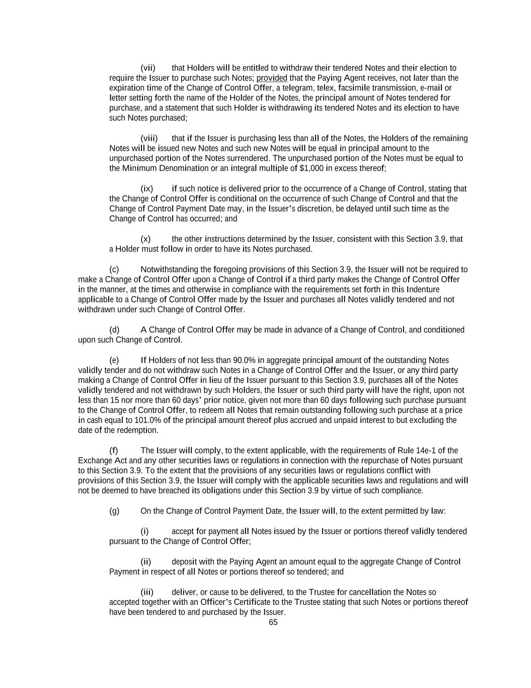 65 (vii) that Holders will be entitled to withdraw their tendered Notes and their election to require the Issuer to purchase such Notes; provided that the Paying Agent receives, not later than the expiration time of the Change of Control Offer, a telegram, telex, facsimile transmission, e-mail or letter setting forth the name of the Holder of the Notes, the principal amount of Notes tendered for purchase, and a statement that such Holder is withdrawing its tendered Notes and its election to have such Notes purchased; (viii) that if the Issuer is purchasing less than all of the Notes, the Holders of the remaining Notes will be issued new Notes and such new Notes will be equal in principal amount to the unpurchased portion of the Notes surrendered. The unpurchased portion of the Notes must be equal to the Minimum Denomination or an integral multiple of $1,000 in excess thereof; (ix) if such notice is delivered prior to the occurrence of a Change of Control, stating that the Change of Control Offer is conditional on the occurrence of such Change of Control and that the Change of Control Payment Date may, in the Issuer’s discretion, be delayed until such time as the Change of Control has occurred; and (x) the other instructions determined by the Issuer, consistent with this Section 3.9, that a Holder must follow in order to have its Notes purchased. (c) Notwithstanding the foregoing provisions of this Section 3.9, the Issuer will not be required to make a Change of Control Offer upon a Change of Control if a third party makes the Change of Control Offer in the manner, at the times and otherwise in compliance with the requirements set forth in this Indenture applicable to a Change of Control Offer made by the Issuer and purchases all Notes validly tendered and not withdrawn under such Change of Control Offer. (d) A Change of Control Offer may be made in advance of a Change of Control, and conditioned upon such Change of Control. (e) If Holders of not less than 90.0% in aggregate principal amount of the outstanding Notes validly tender and do not withdraw such Notes in a Change of Control Offer and the Issuer, or any third party making a Change of Control Offer in lieu of the Issuer pursuant to this Section 3.9, purchases all of the Notes validly tendered and not withdrawn by such Holders, the Issuer or such third party will have the right, upon not less than 15 nor more than 60 days’ prior notice, given not more than 60 days following such purchase pursuant to the Change of Control Offer, to redeem all Notes that remain outstanding following such purchase at a price in cash equal to 101.0% of the principal amount thereof plus accrued and unpaid interest to but excluding the date of the redemption. (f) The Issuer will comply, to the extent applicable, with the requirements of Rule 14e-1 of the Exchange Act and any other securities laws or regulations in connection with the repurchase of Notes pursuant to this Section 3.9. To the extent that the provisions of any securities laws or regulations conflict with provisions of this Section 3.9, the Issuer will comply with the applicable securities laws and regulations and will not be deemed to have breached its obligations under this Section 3.9 by virtue of such compliance. (g) On the Change of Control Payment Date, the Issuer will, to the extent permitted by law: (i) accept for payment all Notes issued by the Issuer or portions thereof validly tendered pursuant to the Change of Control Offer; (ii) deposit with the Paying Agent an amount equal to the aggregate Change of Control Payment in respect of all Notes or portions thereof so tendered; and (iii) deliver, or cause to be delivered, to the Trustee for cancellation the Notes so accepted together with an Officer’s Certificate to the Trustee stating that such Notes or portions thereof have been tendered to and purchased by the Issuer.