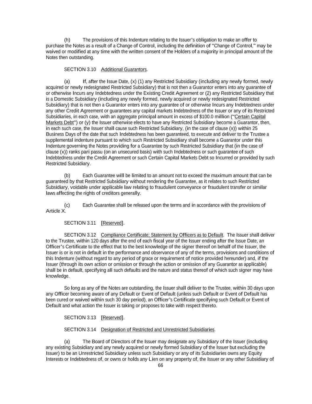 66 (h) The provisions of this Indenture relating to the Issuer’s obligation to make an offer to purchase the Notes as a result of a Change of Control, including the definition of “Change of Control,” may be waived or modified at any time with the written consent of the Holders of a majority in principal amount of the Notes then outstanding. SECTION 3.10 Additional Guarantors. (a) If, after the Issue Date, (x) (1) any Restricted Subsidiary (including any newly formed, newly acquired or newly redesignated Restricted Subsidiary) that is not then a Guarantor enters into any guarantee of or otherwise Incurs any Indebtedness under the Existing Credit Agreement or (2) any Restricted Subsidiary that is a Domestic Subsidiary (including any newly formed, newly acquired or newly redesignated Restricted Subsidiary) that is not then a Guarantor enters into any guarantee of or otherwise Incurs any Indebtedness under any other Credit Agreement or guarantees any capital markets Indebtedness of the Issuer or any of its Restricted Subsidiaries, in each case, with an aggregate principal amount in excess of $100.0 million (“Certain Capital Markets Debt”) or (y) the Issuer otherwise elects to have any Restricted Subsidiary become a Guarantor, then, in each such case, the Issuer shall cause such Restricted Subsidiary, (in the case of clause (x)) within 25 Business Days of the date that such Indebtedness has been guaranteed, to execute and deliver to the Trustee a supplemental indenture pursuant to which such Restricted Subsidiary shall become a Guarantor under this Indenture governing the Notes providing for a Guarantee by such Restricted Subsidiary that (in the case of clause (x)) ranks pari passu (on an unsecured basis) with such Indebtedness or such guarantee of such Indebtedness under the Credit Agreement or such Certain Capital Markets Debt so Incurred or provided by such Restricted Subsidiary. (b) Each Guarantee will be limited to an amount not to exceed the maximum amount that can be guaranteed by that Restricted Subsidiary without rendering the Guarantee, as it relates to such Restricted Subsidiary, voidable under applicable law relating to fraudulent conveyance or fraudulent transfer or similar laws affecting the rights of creditors generally. (c) Each Guarantee shall be released upon the terms and in accordance with the provisions of Article X. SECTION 3.11 [Reserved]. SECTION 3.12 Compliance Certificate; Statement by Officers as to Default. The Issuer shall deliver to the Trustee, within 120 days after the end of each fiscal year of the Issuer ending after the Issue Date, an Officer’s Certificate to the effect that to the best knowledge of the signer thereof on behalf of the Issuer, the Issuer is or is not in default in the performance and observance of any of the terms, provisions and conditions of this Indenture (without regard to any period of grace or requirement of notice provided hereunder) and, if the Issuer (through its own action or omission or through the action or omission of any Guarantor as applicable) shall be in default, specifying all such defaults and the nature and status thereof of which such signer may have knowledge. So long as any of the Notes are outstanding, the Issuer shall deliver to the Trustee, within 30 days upon any Officer becoming aware of any Default or Event of Default (unless such Default or Event of Default has been cured or waived within such 30 day period), an Officer’s Certificate specifying such Default or Event of Default and what action the Issuer is taking or proposes to take with respect thereto. SECTION 3.13 [Reserved]. SECTION 3.14 Designation of Restricted and Unrestricted Subsidiaries. (a) The Board of Directors of the Issuer may designate any Subsidiary of the Issuer (including any existing Subsidiary and any newly acquired or newly formed Subsidiary of the Issuer but excluding the Issuer) to be an Unrestricted Subsidiary unless such Subsidiary or any of its Subsidiaries owns any Equity Interests or Indebtedness of, or owns or holds any Lien on any property of, the Issuer or any other Subsidiary of