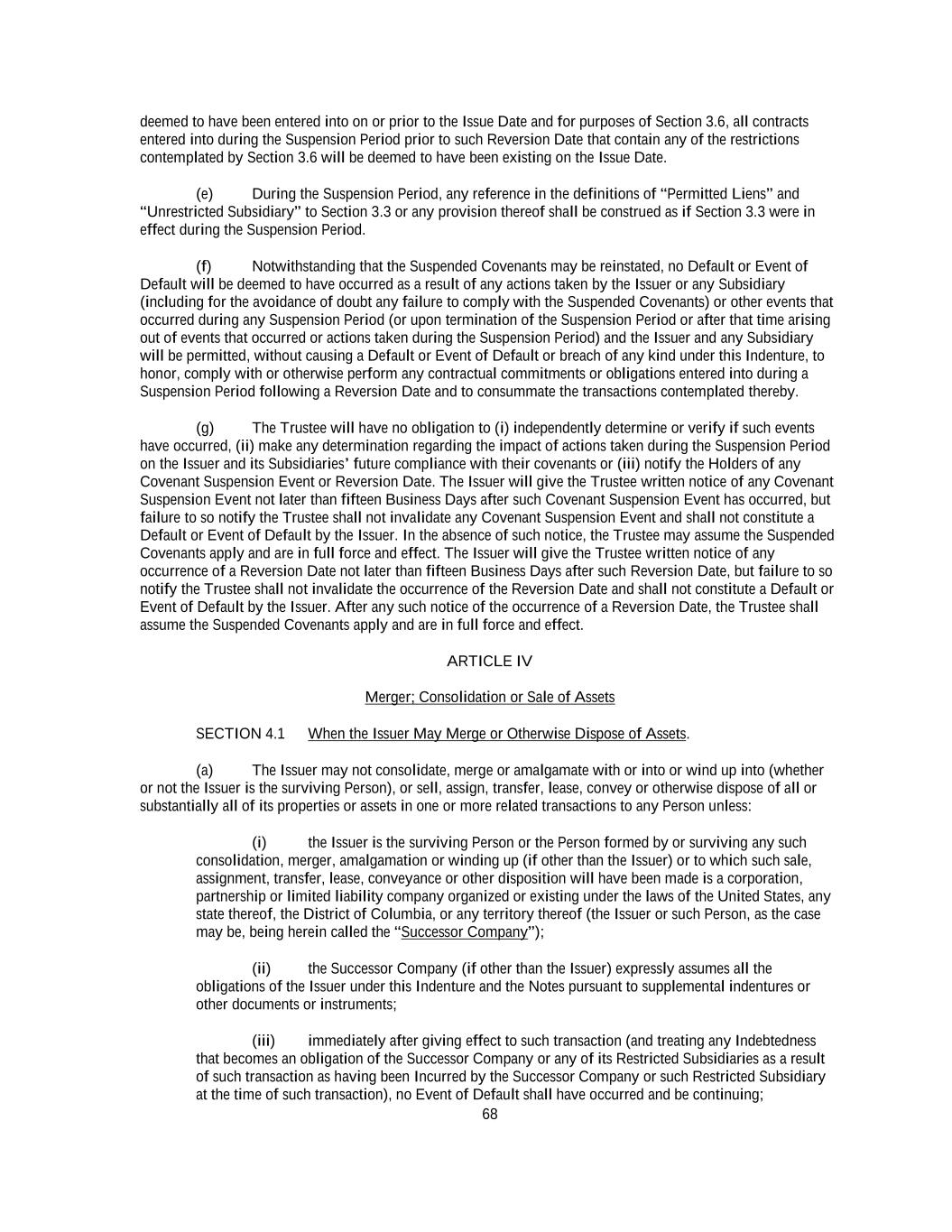 68 deemed to have been entered into on or prior to the Issue Date and for purposes of Section 3.6, all contracts entered into during the Suspension Period prior to such Reversion Date that contain any of the restrictions contemplated by Section 3.6 will be deemed to have been existing on the Issue Date. (e) During the Suspension Period, any reference in the definitions of “Permitted Liens” and “Unrestricted Subsidiary” to Section 3.3 or any provision thereof shall be construed as if Section 3.3 were in effect during the Suspension Period. (f) Notwithstanding that the Suspended Covenants may be reinstated, no Default or Event of Default will be deemed to have occurred as a result of any actions taken by the Issuer or any Subsidiary (including for the avoidance of doubt any failure to comply with the Suspended Covenants) or other events that occurred during any Suspension Period (or upon termination of the Suspension Period or after that time arising out of events that occurred or actions taken during the Suspension Period) and the Issuer and any Subsidiary will be permitted, without causing a Default or Event of Default or breach of any kind under this Indenture, to honor, comply with or otherwise perform any contractual commitments or obligations entered into during a Suspension Period following a Reversion Date and to consummate the transactions contemplated thereby. (g) The Trustee will have no obligation to (i) independently determine or verify if such events have occurred, (ii) make any determination regarding the impact of actions taken during the Suspension Period on the Issuer and its Subsidiaries’ future compliance with their covenants or (iii) notify the Holders of any Covenant Suspension Event or Reversion Date. The Issuer will give the Trustee written notice of any Covenant Suspension Event not later than fifteen Business Days after such Covenant Suspension Event has occurred, but failure to so notify the Trustee shall not invalidate any Covenant Suspension Event and shall not constitute a Default or Event of Default by the Issuer. In the absence of such notice, the Trustee may assume the Suspended Covenants apply and are in full force and effect. The Issuer will give the Trustee written notice of any occurrence of a Reversion Date not later than fifteen Business Days after such Reversion Date, but failure to so notify the Trustee shall not invalidate the occurrence of the Reversion Date and shall not constitute a Default or Event of Default by the Issuer. After any such notice of the occurrence of a Reversion Date, the Trustee shall assume the Suspended Covenants apply and are in full force and effect. ARTICLE IV Merger; Consolidation or Sale of Assets SECTION 4.1 When the Issuer May Merge or Otherwise Dispose of Assets. (a) The Issuer may not consolidate, merge or amalgamate with or into or wind up into (whether or not the Issuer is the surviving Person), or sell, assign, transfer, lease, convey or otherwise dispose of all or substantially all of its properties or assets in one or more related transactions to any Person unless: (i) the Issuer is the surviving Person or the Person formed by or surviving any such consolidation, merger, amalgamation or winding up (if other than the Issuer) or to which such sale, assignment, transfer, lease, conveyance or other disposition will have been made is a corporation, partnership or limited liability company organized or existing under the laws of the United States, any state thereof, the District of Columbia, or any territory thereof (the Issuer or such Person, as the case may be, being herein called the “Successor Company”); (ii) the Successor Company (if other than the Issuer) expressly assumes all the obligations of the Issuer under this Indenture and the Notes pursuant to supplemental indentures or other documents or instruments; (iii) immediately after giving effect to such transaction (and treating any Indebtedness that becomes an obligation of the Successor Company or any of its Restricted Subsidiaries as a result of such transaction as having been Incurred by the Successor Company or such Restricted Subsidiary at the time of such transaction), no Event of Default shall have occurred and be continuing;