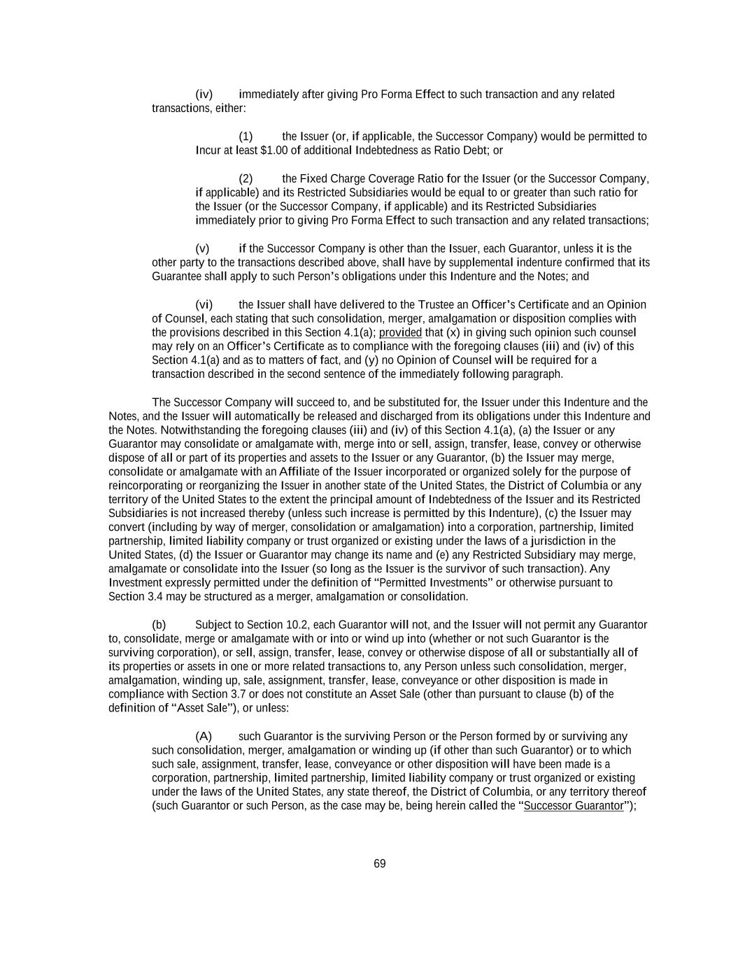69 (iv) immediately after giving Pro Forma Effect to such transaction and any related transactions, either: (1) the Issuer (or, if applicable, the Successor Company) would be permitted to Incur at least $1.00 of additional Indebtedness as Ratio Debt; or (2) the Fixed Charge Coverage Ratio for the Issuer (or the Successor Company, if applicable) and its Restricted Subsidiaries would be equal to or greater than such ratio for the Issuer (or the Successor Company, if applicable) and its Restricted Subsidiaries immediately prior to giving Pro Forma Effect to such transaction and any related transactions; (v) if the Successor Company is other than the Issuer, each Guarantor, unless it is the other party to the transactions described above, shall have by supplemental indenture confirmed that its Guarantee shall apply to such Person’s obligations under this Indenture and the Notes; and (vi) the Issuer shall have delivered to the Trustee an Officer’s Certificate and an Opinion of Counsel, each stating that such consolidation, merger, amalgamation or disposition complies with the provisions described in this Section 4.1(a); provided that (x) in giving such opinion such counsel may rely on an Officer’s Certificate as to compliance with the foregoing clauses (iii) and (iv) of this Section 4.1(a) and as to matters of fact, and (y) no Opinion of Counsel will be required for a transaction described in the second sentence of the immediately following paragraph. The Successor Company will succeed to, and be substituted for, the Issuer under this Indenture and the Notes, and the Issuer will automatically be released and discharged from its obligations under this Indenture and the Notes. Notwithstanding the foregoing clauses (iii) and (iv) of this Section 4.1(a), (a) the Issuer or any Guarantor may consolidate or amalgamate with, merge into or sell, assign, transfer, lease, convey or otherwise dispose of all or part of its properties and assets to the Issuer or any Guarantor, (b) the Issuer may merge, consolidate or amalgamate with an Affiliate of the Issuer incorporated or organized solely for the purpose of reincorporating or reorganizing the Issuer in another state of the United States, the District of Columbia or any territory of the United States to the extent the principal amount of Indebtedness of the Issuer and its Restricted Subsidiaries is not increased thereby (unless such increase is permitted by this Indenture), (c) the Issuer may convert (including by way of merger, consolidation or amalgamation) into a corporation, partnership, limited partnership, limited liability company or trust organized or existing under the laws of a jurisdiction in the United States, (d) the Issuer or Guarantor may change its name and (e) any Restricted Subsidiary may merge, amalgamate or consolidate into the Issuer (so long as the Issuer is the survivor of such transaction). Any Investment expressly permitted under the definition of “Permitted Investments” or otherwise pursuant to Section 3.4 may be structured as a merger, amalgamation or consolidation. (b) Subject to Section 10.2, each Guarantor will not, and the Issuer will not permit any Guarantor to, consolidate, merge or amalgamate with or into or wind up into (whether or not such Guarantor is the surviving corporation), or sell, assign, transfer, lease, convey or otherwise dispose of all or substantially all of its properties or assets in one or more related transactions to, any Person unless such consolidation, merger, amalgamation, winding up, sale, assignment, transfer, lease, conveyance or other disposition is made in compliance with Section 3.7 or does not constitute an Asset Sale (other than pursuant to clause (b) of the definition of “Asset Sale”), or unless: (A) such Guarantor is the surviving Person or the Person formed by or surviving any such consolidation, merger, amalgamation or winding up (if other than such Guarantor) or to which such sale, assignment, transfer, lease, conveyance or other disposition will have been made is a corporation, partnership, limited partnership, limited liability company or trust organized or existing under the laws of the United States, any state thereof, the District of Columbia, or any territory thereof (such Guarantor or such Person, as the case may be, being herein called the “Successor Guarantor”);