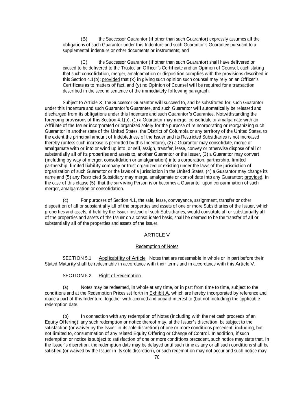 70 (B) the Successor Guarantor (if other than such Guarantor) expressly assumes all the obligations of such Guarantor under this Indenture and such Guarantor’s Guarantee pursuant to a supplemental indenture or other documents or instruments; and (C) the Successor Guarantor (if other than such Guarantor) shall have delivered or caused to be delivered to the Trustee an Officer’s Certificate and an Opinion of Counsel, each stating that such consolidation, merger, amalgamation or disposition complies with the provisions described in this Section 4.1(b); provided that (x) in giving such opinion such counsel may rely on an Officer’s Certificate as to matters of fact, and (y) no Opinion of Counsel will be required for a transaction described in the second sentence of the immediately following paragraph. Subject to Article X, the Successor Guarantor will succeed to, and be substituted for, such Guarantor under this Indenture and such Guarantor’s Guarantee, and such Guarantor will automatically be released and discharged from its obligations under this Indenture and such Guarantor’s Guarantee. Notwithstanding the foregoing provisions of this Section 4.1(b), (1) a Guarantor may merge, consolidate or amalgamate with an Affiliate of the Issuer incorporated or organized solely for the purpose of reincorporating or reorganizing such Guarantor in another state of the United States, the District of Columbia or any territory of the United States, to the extent the principal amount of Indebtedness of the Issuer and its Restricted Subsidiaries is not increased thereby (unless such increase is permitted by this Indenture), (2) a Guarantor may consolidate, merge or amalgamate with or into or wind up into, or sell, assign, transfer, lease, convey or otherwise dispose of all or substantially all of its properties and assets to, another Guarantor or the Issuer, (3) a Guarantor may convert (including by way of merger, consolidation or amalgamation) into a corporation, partnership, limited partnership, limited liability company or trust organized or existing under the laws of the jurisdiction of organization of such Guarantor or the laws of a jurisdiction in the United States, (4) a Guarantor may change its name and (5) any Restricted Subsidiary may merge, amalgamate or consolidate into any Guarantor; provided, in the case of this clause (5), that the surviving Person is or becomes a Guarantor upon consummation of such merger, amalgamation or consolidation. (c) For purposes of Section 4.1, the sale, lease, conveyance, assignment, transfer or other disposition of all or substantially all of the properties and assets of one or more Subsidiaries of the Issuer, which properties and assets, if held by the Issuer instead of such Subsidiaries, would constitute all or substantially all of the properties and assets of the Issuer on a consolidated basis, shall be deemed to be the transfer of all or substantially all of the properties and assets of the Issuer. ARTICLE V Redemption of Notes SECTION 5.1 Applicability of Article. Notes that are redeemable in whole or in part before their Stated Maturity shall be redeemable in accordance with their terms and in accordance with this Article V. SECTION 5.2 Right of Redemption. (a) Notes may be redeemed, in whole at any time, or in part from time to time, subject to the conditions and at the Redemption Prices set forth in Exhibit A, which are hereby incorporated by reference and made a part of this Indenture, together with accrued and unpaid interest to (but not including) the applicable redemption date. (b) In connection with any redemption of Notes (including with the net cash proceeds of an Equity Offering), any such redemption or notice thereof may, at the Issuer’s discretion, be subject to the satisfaction (or waiver by the Issuer in its sole discretion) of one or more conditions precedent, including, but not limited to, consummation of any related Equity Offering or Change of Control. In addition, if such redemption or notice is subject to satisfaction of one or more conditions precedent, such notice may state that, in the Issuer’s discretion, the redemption date may be delayed until such time as any or all such conditions shall be satisfied (or waived by the Issuer in its sole discretion), or such redemption may not occur and such notice may