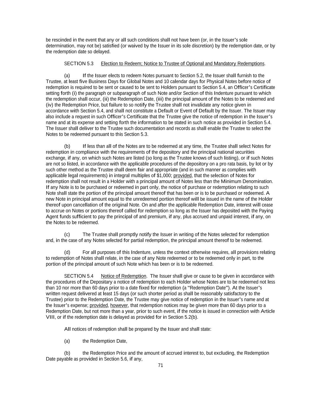 71 be rescinded in the event that any or all such conditions shall not have been (or, in the Issuer’s sole determination, may not be) satisfied (or waived by the Issuer in its sole discretion) by the redemption date, or by the redemption date so delayed. SECTION 5.3 Election to Redeem; Notice to Trustee of Optional and Mandatory Redemptions. (a) If the Issuer elects to redeem Notes pursuant to Section 5.2, the Issuer shall furnish to the Trustee, at least five Business Days for Global Notes and 10 calendar days for Physical Notes before notice of redemption is required to be sent or caused to be sent to Holders pursuant to Section 5.4, an Officer’s Certificate setting forth (i) the paragraph or subparagraph of such Note and/or Section of this Indenture pursuant to which the redemption shall occur, (ii) the Redemption Date, (iii) the principal amount of the Notes to be redeemed and (iv) the Redemption Price, but failure to so notify the Trustee shall not invalidate any notice given in accordance with Section 5.4, and shall not constitute a Default or Event of Default by the Issuer. The Issuer may also include a request in such Officer’s Certificate that the Trustee give the notice of redemption in the Issuer’s name and at its expense and setting forth the information to be stated in such notice as provided in Section 5.4. The Issuer shall deliver to the Trustee such documentation and records as shall enable the Trustee to select the Notes to be redeemed pursuant to this Section 5.3. (b) If less than all of the Notes are to be redeemed at any time, the Trustee shall select Notes for redemption in compliance with the requirements of the depository and the principal national securities exchange, if any, on which such Notes are listed (so long as the Trustee knows of such listing), or if such Notes are not so listed, in accordance with the applicable procedures of the depository on a pro rata basis, by lot or by such other method as the Trustee shall deem fair and appropriate (and in such manner as complies with applicable legal requirements) in integral multiples of $1,000; provided, that the selection of Notes for redemption shall not result in a Holder with a principal amount of Notes less than the Minimum Denomination. If any Note is to be purchased or redeemed in part only, the notice of purchase or redemption relating to such Note shall state the portion of the principal amount thereof that has been or is to be purchased or redeemed. A new Note in principal amount equal to the unredeemed portion thereof will be issued in the name of the Holder thereof upon cancellation of the original Note. On and after the applicable Redemption Date, interest will cease to accrue on Notes or portions thereof called for redemption so long as the Issuer has deposited with the Paying Agent funds sufficient to pay the principal of and premium, if any, plus accrued and unpaid interest, if any, on the Notes to be redeemed. (c) The Trustee shall promptly notify the Issuer in writing of the Notes selected for redemption and, in the case of any Notes selected for partial redemption, the principal amount thereof to be redeemed. (d) For all purposes of this Indenture, unless the context otherwise requires, all provisions relating to redemption of Notes shall relate, in the case of any Note redeemed or to be redeemed only in part, to the portion of the principal amount of such Note which has been or is to be redeemed. SECTION 5.4 Notice of Redemption. The Issuer shall give or cause to be given in accordance with the procedures of the Depositary a notice of redemption to each Holder whose Notes are to be redeemed not less than 10 nor more than 60 days prior to a date fixed for redemption (a “Redemption Date”). At the Issuer’s written request delivered at least 15 days (or such shorter period as shall be reasonably satisfactory to the Trustee) prior to the Redemption Date, the Trustee may give notice of redemption in the Issuer’s name and at the Issuer’s expense; provided, however, that redemption notices may be given more than 60 days prior to a Redemption Date, but not more than a year, prior to such event, if the notice is issued in connection with Article VIII, or if the redemption date is delayed as provided for in Section 5.2(b). All notices of redemption shall be prepared by the Issuer and shall state: (a) the Redemption Date, (b) the Redemption Price and the amount of accrued interest to, but excluding, the Redemption Date payable as provided in Section 5.6, if any,