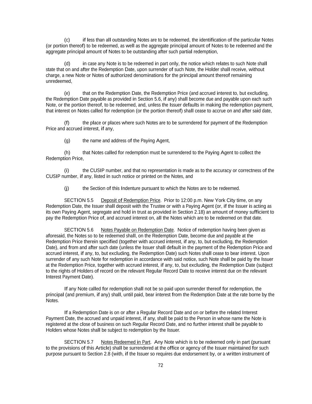 72 (c) if less than all outstanding Notes are to be redeemed, the identification of the particular Notes (or portion thereof) to be redeemed, as well as the aggregate principal amount of Notes to be redeemed and the aggregate principal amount of Notes to be outstanding after such partial redemption, (d) in case any Note is to be redeemed in part only, the notice which relates to such Note shall state that on and after the Redemption Date, upon surrender of such Note, the Holder shall receive, without charge, a new Note or Notes of authorized denominations for the principal amount thereof remaining unredeemed, (e) that on the Redemption Date, the Redemption Price (and accrued interest to, but excluding, the Redemption Date payable as provided in Section 5.6, if any) shall become due and payable upon each such Note, or the portion thereof, to be redeemed, and, unless the Issuer defaults in making the redemption payment, that interest on Notes called for redemption (or the portion thereof) shall cease to accrue on and after said date, (f) the place or places where such Notes are to be surrendered for payment of the Redemption Price and accrued interest, if any, (g) the name and address of the Paying Agent, (h) that Notes called for redemption must be surrendered to the Paying Agent to collect the Redemption Price, (i) the CUSIP number, and that no representation is made as to the accuracy or correctness of the CUSIP number, if any, listed in such notice or printed on the Notes, and (j) the Section of this Indenture pursuant to which the Notes are to be redeemed. SECTION 5.5 Deposit of Redemption Price. Prior to 12:00 p.m. New York City time, on any Redemption Date, the Issuer shall deposit with the Trustee or with a Paying Agent (or, if the Issuer is acting as its own Paying Agent, segregate and hold in trust as provided in Section 2.18) an amount of money sufficient to pay the Redemption Price of, and accrued interest on, all the Notes which are to be redeemed on that date. SECTION 5.6 Notes Payable on Redemption Date. Notice of redemption having been given as aforesaid, the Notes so to be redeemed shall, on the Redemption Date, become due and payable at the Redemption Price therein specified (together with accrued interest, if any, to, but excluding, the Redemption Date), and from and after such date (unless the Issuer shall default in the payment of the Redemption Price and accrued interest, if any, to, but excluding, the Redemption Date) such Notes shall cease to bear interest. Upon surrender of any such Note for redemption in accordance with said notice, such Note shall be paid by the Issuer at the Redemption Price, together with accrued interest, if any, to, but excluding, the Redemption Date (subject to the rights of Holders of record on the relevant Regular Record Date to receive interest due on the relevant Interest Payment Date). If any Note called for redemption shall not be so paid upon surrender thereof for redemption, the principal (and premium, if any) shall, until paid, bear interest from the Redemption Date at the rate borne by the Notes. If a Redemption Date is on or after a Regular Record Date and on or before the related Interest Payment Date, the accrued and unpaid interest, if any, shall be paid to the Person in whose name the Note is registered at the close of business on such Regular Record Date, and no further interest shall be payable to Holders whose Notes shall be subject to redemption by the Issuer. SECTION 5.7 Notes Redeemed in Part. Any Note which is to be redeemed only in part (pursuant to the provisions of this Article) shall be surrendered at the office or agency of the Issuer maintained for such purpose pursuant to Section 2.8 (with, if the Issuer so requires due endorsement by, or a written instrument of