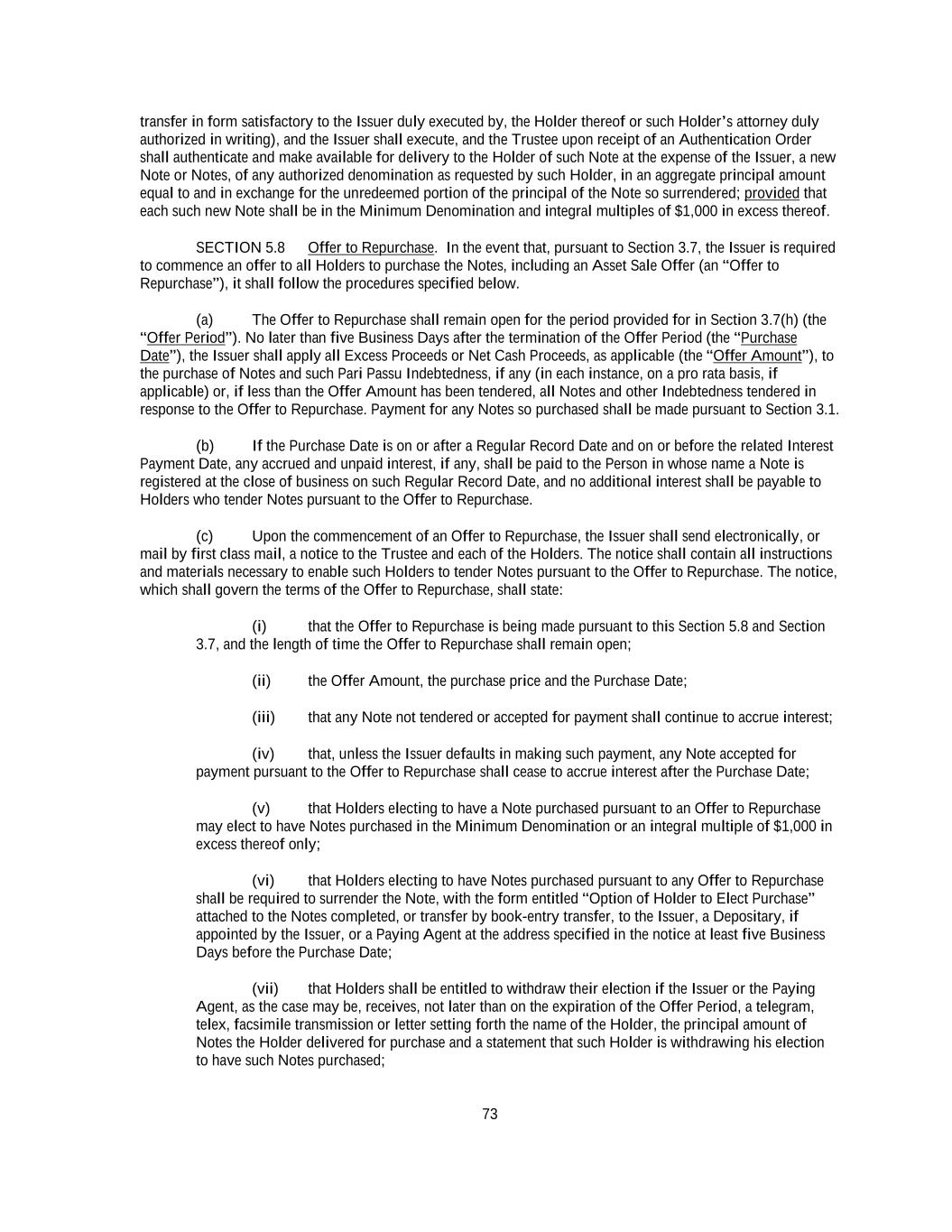 73 transfer in form satisfactory to the Issuer duly executed by, the Holder thereof or such Holder’s attorney duly authorized in writing), and the Issuer shall execute, and the Trustee upon receipt of an Authentication Order shall authenticate and make available for delivery to the Holder of such Note at the expense of the Issuer, a new Note or Notes, of any authorized denomination as requested by such Holder, in an aggregate principal amount equal to and in exchange for the unredeemed portion of the principal of the Note so surrendered; provided that each such new Note shall be in the Minimum Denomination and integral multiples of $1,000 in excess thereof. SECTION 5.8 Offer to Repurchase. In the event that, pursuant to Section 3.7, the Issuer is required to commence an offer to all Holders to purchase the Notes, including an Asset Sale Offer (an “Offer to Repurchase”), it shall follow the procedures specified below. (a) The Offer to Repurchase shall remain open for the period provided for in Section 3.7(h) (the “Offer Period”). No later than five Business Days after the termination of the Offer Period (the “Purchase Date”), the Issuer shall apply all Excess Proceeds or Net Cash Proceeds, as applicable (the “Offer Amount”), to the purchase of Notes and such Pari Passu Indebtedness, if any (in each instance, on a pro rata basis, if applicable) or, if less than the Offer Amount has been tendered, all Notes and other Indebtedness tendered in response to the Offer to Repurchase. Payment for any Notes so purchased shall be made pursuant to Section 3.1. (b) If the Purchase Date is on or after a Regular Record Date and on or before the related Interest Payment Date, any accrued and unpaid interest, if any, shall be paid to the Person in whose name a Note is registered at the close of business on such Regular Record Date, and no additional interest shall be payable to Holders who tender Notes pursuant to the Offer to Repurchase. (c) Upon the commencement of an Offer to Repurchase, the Issuer shall send electronically, or mail by first class mail, a notice to the Trustee and each of the Holders. The notice shall contain all instructions and materials necessary to enable such Holders to tender Notes pursuant to the Offer to Repurchase. The notice, which shall govern the terms of the Offer to Repurchase, shall state: (i) that the Offer to Repurchase is being made pursuant to this Section 5.8 and Section 3.7, and the length of time the Offer to Repurchase shall remain open; (ii) the Offer Amount, the purchase price and the Purchase Date; (iii) that any Note not tendered or accepted for payment shall continue to accrue interest; (iv) that, unless the Issuer defaults in making such payment, any Note accepted for payment pursuant to the Offer to Repurchase shall cease to accrue interest after the Purchase Date; (v) that Holders electing to have a Note purchased pursuant to an Offer to Repurchase may elect to have Notes purchased in the Minimum Denomination or an integral multiple of $1,000 in excess thereof only; (vi) that Holders electing to have Notes purchased pursuant to any Offer to Repurchase shall be required to surrender the Note, with the form entitled “Option of Holder to Elect Purchase” attached to the Notes completed, or transfer by book-entry transfer, to the Issuer, a Depositary, if appointed by the Issuer, or a Paying Agent at the address specified in the notice at least five Business Days before the Purchase Date; (vii) that Holders shall be entitled to withdraw their election if the Issuer or the Paying Agent, as the case may be, receives, not later than on the expiration of the Offer Period, a telegram, telex, facsimile transmission or letter setting forth the name of the Holder, the principal amount of Notes the Holder delivered for purchase and a statement that such Holder is withdrawing his election to have such Notes purchased;