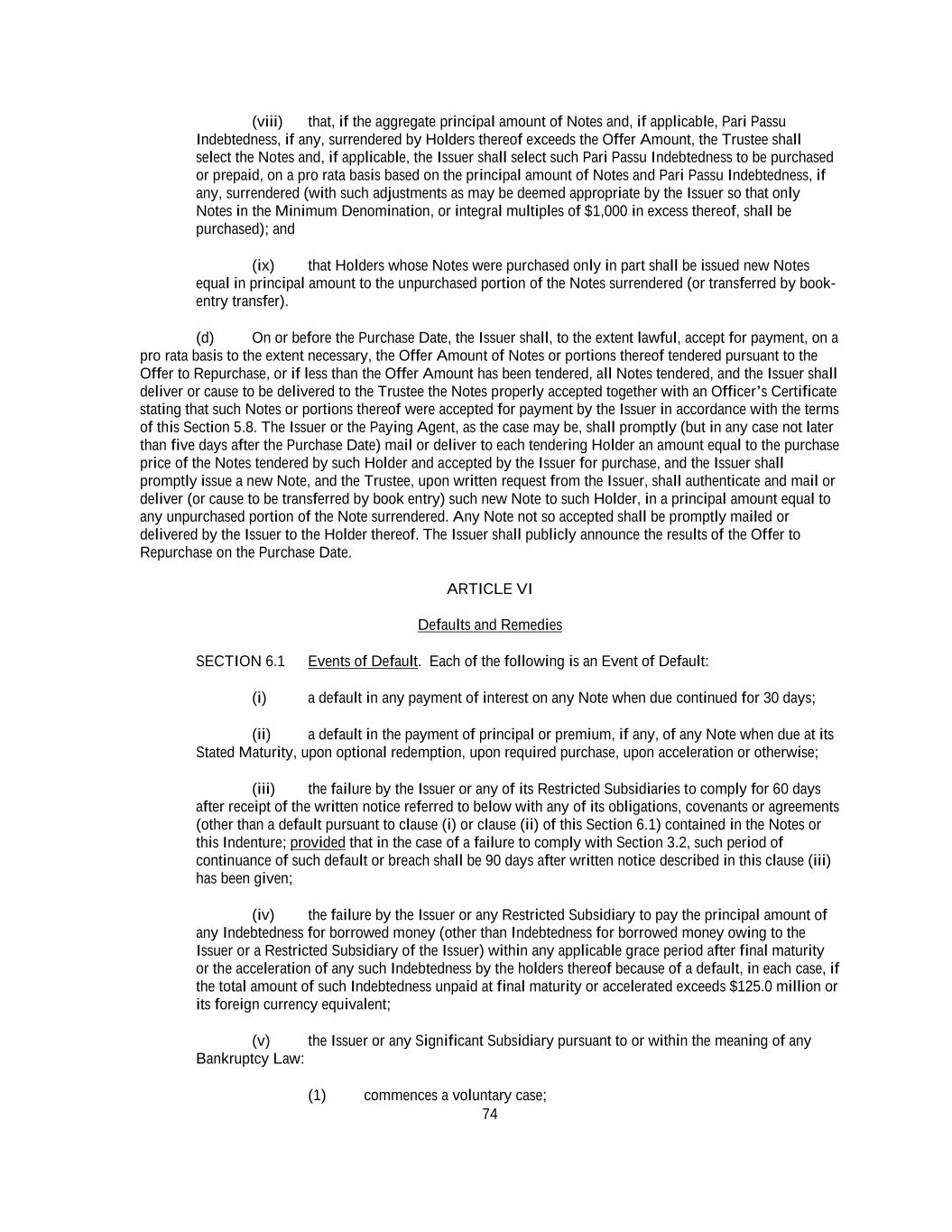 74 (viii) that, if the aggregate principal amount of Notes and, if applicable, Pari Passu Indebtedness, if any, surrendered by Holders thereof exceeds the Offer Amount, the Trustee shall select the Notes and, if applicable, the Issuer shall select such Pari Passu Indebtedness to be purchased or prepaid, on a pro rata basis based on the principal amount of Notes and Pari Passu Indebtedness, if any, surrendered (with such adjustments as may be deemed appropriate by the Issuer so that only Notes in the Minimum Denomination, or integral multiples of $1,000 in excess thereof, shall be purchased); and (ix) that Holders whose Notes were purchased only in part shall be issued new Notes equal in principal amount to the unpurchased portion of the Notes surrendered (or transferred by book- entry transfer). (d) On or before the Purchase Date, the Issuer shall, to the extent lawful, accept for payment, on a pro rata basis to the extent necessary, the Offer Amount of Notes or portions thereof tendered pursuant to the Offer to Repurchase, or if less than the Offer Amount has been tendered, all Notes tendered, and the Issuer shall deliver or cause to be delivered to the Trustee the Notes properly accepted together with an Officer’s Certificate stating that such Notes or portions thereof were accepted for payment by the Issuer in accordance with the terms of this Section 5.8. The Issuer or the Paying Agent, as the case may be, shall promptly (but in any case not later than five days after the Purchase Date) mail or deliver to each tendering Holder an amount equal to the purchase price of the Notes tendered by such Holder and accepted by the Issuer for purchase, and the Issuer shall promptly issue a new Note, and the Trustee, upon written request from the Issuer, shall authenticate and mail or deliver (or cause to be transferred by book entry) such new Note to such Holder, in a principal amount equal to any unpurchased portion of the Note surrendered. Any Note not so accepted shall be promptly mailed or delivered by the Issuer to the Holder thereof. The Issuer shall publicly announce the results of the Offer to Repurchase on the Purchase Date. ARTICLE VI Defaults and Remedies SECTION 6.1 Events of Default. Each of the following is an Event of Default: (i) a default in any payment of interest on any Note when due continued for 30 days; (ii) a default in the payment of principal or premium, if any, of any Note when due at its Stated Maturity, upon optional redemption, upon required purchase, upon acceleration or otherwise; (iii) the failure by the Issuer or any of its Restricted Subsidiaries to comply for 60 days after receipt of the written notice referred to below with any of its obligations, covenants or agreements (other than a default pursuant to clause (i) or clause (ii) of this Section 6.1) contained in the Notes or this Indenture; provided that in the case of a failure to comply with Section 3.2, such period of continuance of such default or breach shall be 90 days after written notice described in this clause (iii) has been given; (iv) the failure by the Issuer or any Restricted Subsidiary to pay the principal amount of any Indebtedness for borrowed money (other than Indebtedness for borrowed money owing to the Issuer or a Restricted Subsidiary of the Issuer) within any applicable grace period after final maturity or the acceleration of any such Indebtedness by the holders thereof because of a default, in each case, if the total amount of such Indebtedness unpaid at final maturity or accelerated exceeds $125.0 million or its foreign currency equivalent; (v) the Issuer or any Significant Subsidiary pursuant to or within the meaning of any Bankruptcy Law: (1) commences a voluntary case;