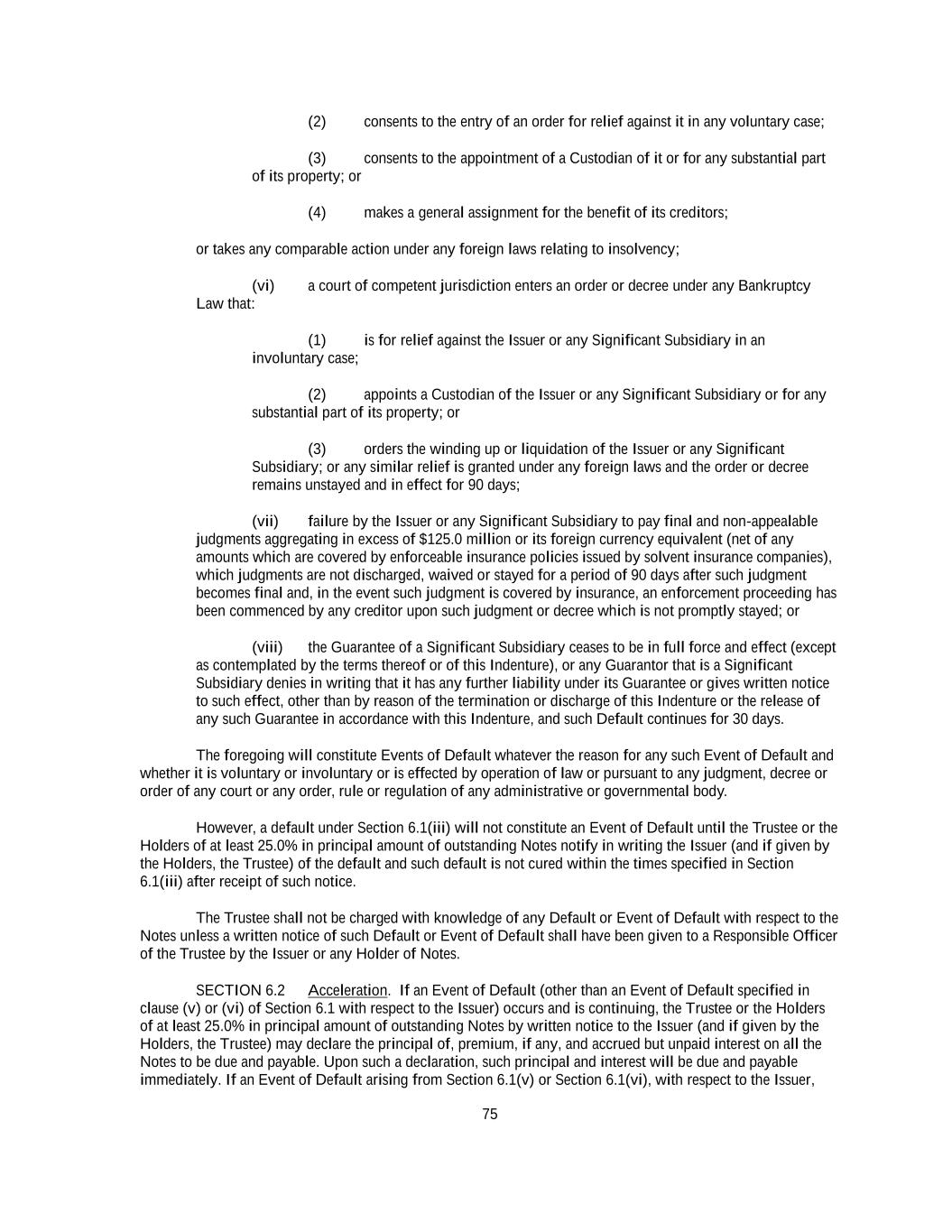 75 (2) consents to the entry of an order for relief against it in any voluntary case; (3) consents to the appointment of a Custodian of it or for any substantial part of its property; or (4) makes a general assignment for the benefit of its creditors; or takes any comparable action under any foreign laws relating to insolvency; (vi) a court of competent jurisdiction enters an order or decree under any Bankruptcy Law that: (1) is for relief against the Issuer or any Significant Subsidiary in an involuntary case; (2) appoints a Custodian of the Issuer or any Significant Subsidiary or for any substantial part of its property; or (3) orders the winding up or liquidation of the Issuer or any Significant Subsidiary; or any similar relief is granted under any foreign laws and the order or decree remains unstayed and in effect for 90 days; (vii) failure by the Issuer or any Significant Subsidiary to pay final and non-appealable judgments aggregating in excess of $125.0 million or its foreign currency equivalent (net of any amounts which are covered by enforceable insurance policies issued by solvent insurance companies), which judgments are not discharged, waived or stayed for a period of 90 days after such judgment becomes final and, in the event such judgment is covered by insurance, an enforcement proceeding has been commenced by any creditor upon such judgment or decree which is not promptly stayed; or (viii) the Guarantee of a Significant Subsidiary ceases to be in full force and effect (except as contemplated by the terms thereof or of this Indenture), or any Guarantor that is a Significant Subsidiary denies in writing that it has any further liability under its Guarantee or gives written notice to such effect, other than by reason of the termination or discharge of this Indenture or the release of any such Guarantee in accordance with this Indenture, and such Default continues for 30 days. The foregoing will constitute Events of Default whatever the reason for any such Event of Default and whether it is voluntary or involuntary or is effected by operation of law or pursuant to any judgment, decree or order of any court or any order, rule or regulation of any administrative or governmental body. However, a default under Section 6.1(iii) will not constitute an Event of Default until the Trustee or the Holders of at least 25.0% in principal amount of outstanding Notes notify in writing the Issuer (and if given by the Holders, the Trustee) of the default and such default is not cured within the times specified in Section 6.1(iii) after receipt of such notice. The Trustee shall not be charged with knowledge of any Default or Event of Default with respect to the Notes unless a written notice of such Default or Event of Default shall have been given to a Responsible Officer of the Trustee by the Issuer or any Holder of Notes. SECTION 6.2 Acceleration. If an Event of Default (other than an Event of Default specified in clause (v) or (vi) of Section 6.1 with respect to the Issuer) occurs and is continuing, the Trustee or the Holders of at least 25.0% in principal amount of outstanding Notes by written notice to the Issuer (and if given by the Holders, the Trustee) may declare the principal of, premium, if any, and accrued but unpaid interest on all the Notes to be due and payable. Upon such a declaration, such principal and interest will be due and payable immediately. If an Event of Default arising from Section 6.1(v) or Section 6.1(vi), with respect to the Issuer,