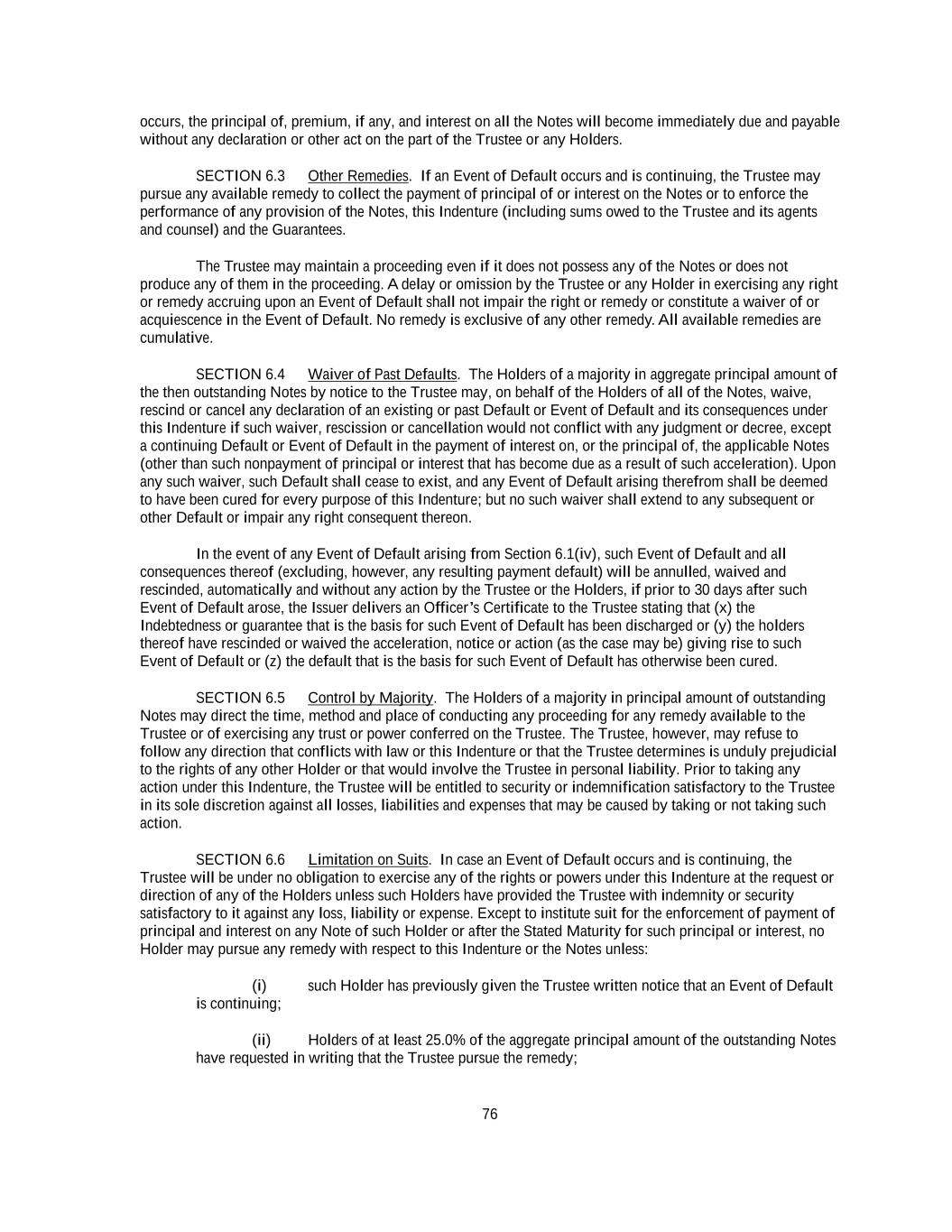 76 occurs, the principal of, premium, if any, and interest on all the Notes will become immediately due and payable without any declaration or other act on the part of the Trustee or any Holders. SECTION 6.3 Other Remedies. If an Event of Default occurs and is continuing, the Trustee may pursue any available remedy to collect the payment of principal of or interest on the Notes or to enforce the performance of any provision of the Notes, this Indenture (including sums owed to the Trustee and its agents and counsel) and the Guarantees. The Trustee may maintain a proceeding even if it does not possess any of the Notes or does not produce any of them in the proceeding. A delay or omission by the Trustee or any Holder in exercising any right or remedy accruing upon an Event of Default shall not impair the right or remedy or constitute a waiver of or acquiescence in the Event of Default. No remedy is exclusive of any other remedy. All available remedies are cumulative. SECTION 6.4 Waiver of Past Defaults. The Holders of a majority in aggregate principal amount of the then outstanding Notes by notice to the Trustee may, on behalf of the Holders of all of the Notes, waive, rescind or cancel any declaration of an existing or past Default or Event of Default and its consequences under this Indenture if such waiver, rescission or cancellation would not conflict with any judgment or decree, except a continuing Default or Event of Default in the payment of interest on, or the principal of, the applicable Notes (other than such nonpayment of principal or interest that has become due as a result of such acceleration). Upon any such waiver, such Default shall cease to exist, and any Event of Default arising therefrom shall be deemed to have been cured for every purpose of this Indenture; but no such waiver shall extend to any subsequent or other Default or impair any right consequent thereon. In the event of any Event of Default arising from Section 6.1(iv), such Event of Default and all consequences thereof (excluding, however, any resulting payment default) will be annulled, waived and rescinded, automatically and without any action by the Trustee or the Holders, if prior to 30 days after such Event of Default arose, the Issuer delivers an Officer’s Certificate to the Trustee stating that (x) the Indebtedness or guarantee that is the basis for such Event of Default has been discharged or (y) the holders thereof have rescinded or waived the acceleration, notice or action (as the case may be) giving rise to such Event of Default or (z) the default that is the basis for such Event of Default has otherwise been cured. SECTION 6.5 Control by Majority. The Holders of a majority in principal amount of outstanding Notes may direct the time, method and place of conducting any proceeding for any remedy available to the Trustee or of exercising any trust or power conferred on the Trustee. The Trustee, however, may refuse to follow any direction that conflicts with law or this Indenture or that the Trustee determines is unduly prejudicial to the rights of any other Holder or that would involve the Trustee in personal liability. Prior to taking any action under this Indenture, the Trustee will be entitled to security or indemnification satisfactory to the Trustee in its sole discretion against all losses, liabilities and expenses that may be caused by taking or not taking such action. SECTION 6.6 Limitation on Suits. In case an Event of Default occurs and is continuing, the Trustee will be under no obligation to exercise any of the rights or powers under this Indenture at the request or direction of any of the Holders unless such Holders have provided the Trustee with indemnity or security satisfactory to it against any loss, liability or expense. Except to institute suit for the enforcement of payment of principal and interest on any Note of such Holder or after the Stated Maturity for such principal or interest, no Holder may pursue any remedy with respect to this Indenture or the Notes unless: (i) such Holder has previously given the Trustee written notice that an Event of Default is continuing; (ii) Holders of at least 25.0% of the aggregate principal amount of the outstanding Notes have requested in writing that the Trustee pursue the remedy;