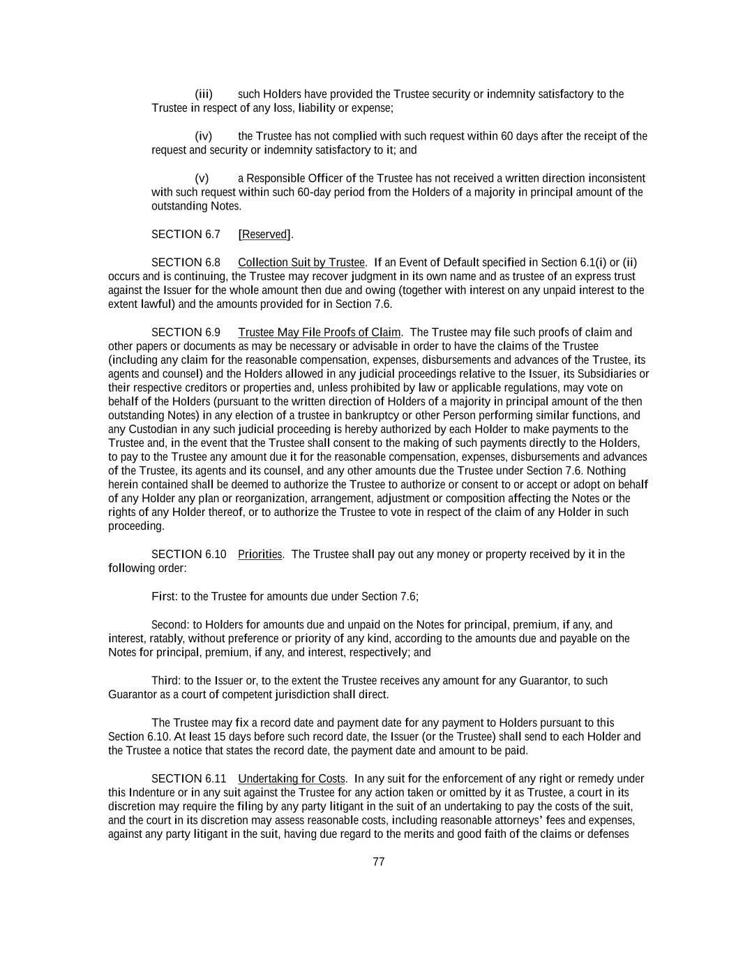 77 (iii) such Holders have provided the Trustee security or indemnity satisfactory to the Trustee in respect of any loss, liability or expense; (iv) the Trustee has not complied with such request within 60 days after the receipt of the request and security or indemnity satisfactory to it; and (v) a Responsible Officer of the Trustee has not received a written direction inconsistent with such request within such 60-day period from the Holders of a majority in principal amount of the outstanding Notes. SECTION 6.7 [Reserved]. SECTION 6.8 Collection Suit by Trustee. If an Event of Default specified in Section 6.1(i) or (ii) occurs and is continuing, the Trustee may recover judgment in its own name and as trustee of an express trust against the Issuer for the whole amount then due and owing (together with interest on any unpaid interest to the extent lawful) and the amounts provided for in Section 7.6. SECTION 6.9 Trustee May File Proofs of Claim. The Trustee may file such proofs of claim and other papers or documents as may be necessary or advisable in order to have the claims of the Trustee (including any claim for the reasonable compensation, expenses, disbursements and advances of the Trustee, its agents and counsel) and the Holders allowed in any judicial proceedings relative to the Issuer, its Subsidiaries or their respective creditors or properties and, unless prohibited by law or applicable regulations, may vote on behalf of the Holders (pursuant to the written direction of Holders of a majority in principal amount of the then outstanding Notes) in any election of a trustee in bankruptcy or other Person performing similar functions, and any Custodian in any such judicial proceeding is hereby authorized by each Holder to make payments to the Trustee and, in the event that the Trustee shall consent to the making of such payments directly to the Holders, to pay to the Trustee any amount due it for the reasonable compensation, expenses, disbursements and advances of the Trustee, its agents and its counsel, and any other amounts due the Trustee under Section 7.6. Nothing herein contained shall be deemed to authorize the Trustee to authorize or consent to or accept or adopt on behalf of any Holder any plan or reorganization, arrangement, adjustment or composition affecting the Notes or the rights of any Holder thereof, or to authorize the Trustee to vote in respect of the claim of any Holder in such proceeding. SECTION 6.10 Priorities. The Trustee shall pay out any money or property received by it in the following order: First: to the Trustee for amounts due under Section 7.6; Second: to Holders for amounts due and unpaid on the Notes for principal, premium, if any, and interest, ratably, without preference or priority of any kind, according to the amounts due and payable on the Notes for principal, premium, if any, and interest, respectively; and Third: to the Issuer or, to the extent the Trustee receives any amount for any Guarantor, to such Guarantor as a court of competent jurisdiction shall direct. The Trustee may fix a record date and payment date for any payment to Holders pursuant to this Section 6.10. At least 15 days before such record date, the Issuer (or the Trustee) shall send to each Holder and the Trustee a notice that states the record date, the payment date and amount to be paid. SECTION 6.11 Undertaking for Costs. In any suit for the enforcement of any right or remedy under this Indenture or in any suit against the Trustee for any action taken or omitted by it as Trustee, a court in its discretion may require the filing by any party litigant in the suit of an undertaking to pay the costs of the suit, and the court in its discretion may assess reasonable costs, including reasonable attorneys’ fees and expenses, against any party litigant in the suit, having due regard to the merits and good faith of the claims or defenses