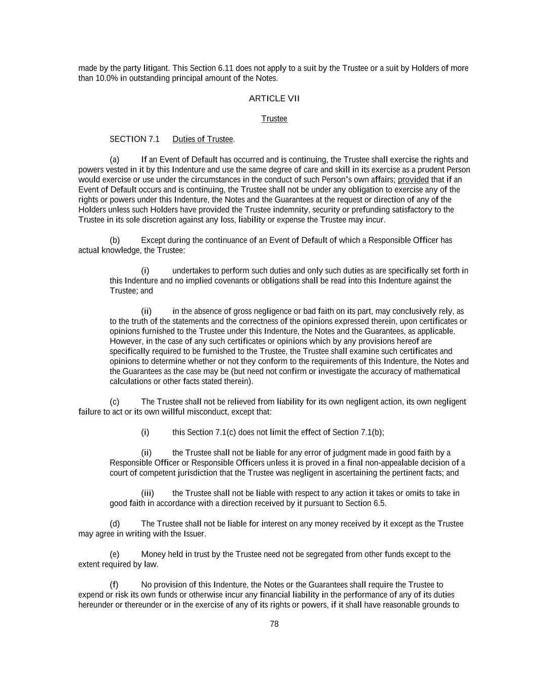 78 made by the party litigant. This Section 6.11 does not apply to a suit by the Trustee or a suit by Holders of more than 10.0% in outstanding principal amount of the Notes. ARTICLE VII Trustee SECTION 7.1 Duties of Trustee. (a) If an Event of Default has occurred and is continuing, the Trustee shall exercise the rights and powers vested in it by this Indenture and use the same degree of care and skill in its exercise as a prudent Person would exercise or use under the circumstances in the conduct of such Person’s own affairs; provided that if an Event of Default occurs and is continuing, the Trustee shall not be under any obligation to exercise any of the rights or powers under this Indenture, the Notes and the Guarantees at the request or direction of any of the Holders unless such Holders have provided the Trustee indemnity, security or prefunding satisfactory to the Trustee in its sole discretion against any loss, liability or expense the Trustee may incur. (b) Except during the continuance of an Event of Default of which a Responsible Officer has actual knowledge, the Trustee: (i) undertakes to perform such duties and only such duties as are specifically set forth in this Indenture and no implied covenants or obligations shall be read into this Indenture against the Trustee; and (ii) in the absence of gross negligence or bad faith on its part, may conclusively rely, as to the truth of the statements and the correctness of the opinions expressed therein, upon certificates or opinions furnished to the Trustee under this Indenture, the Notes and the Guarantees, as applicable. However, in the case of any such certificates or opinions which by any provisions hereof are specifically required to be furnished to the Trustee, the Trustee shall examine such certificates and opinions to determine whether or not they conform to the requirements of this Indenture, the Notes and the Guarantees as the case may be (but need not confirm or investigate the accuracy of mathematical calculations or other facts stated therein). (c) The Trustee shall not be relieved from liability for its own negligent action, its own negligent failure to act or its own willful misconduct, except that: (i) this Section 7.1(c) does not limit the effect of Section 7.1(b); (ii) the Trustee shall not be liable for any error of judgment made in good faith by a Responsible Officer or Responsible Officers unless it is proved in a final non-appealable decision of a court of competent jurisdiction that the Trustee was negligent in ascertaining the pertinent facts; and (iii) the Trustee shall not be liable with respect to any action it takes or omits to take in good faith in accordance with a direction received by it pursuant to Section 6.5. (d) The Trustee shall not be liable for interest on any money received by it except as the Trustee may agree in writing with the Issuer. (e) Money held in trust by the Trustee need not be segregated from other funds except to the extent required by law. (f) No provision of this Indenture, the Notes or the Guarantees shall require the Trustee to expend or risk its own funds or otherwise incur any financial liability in the performance of any of its duties hereunder or thereunder or in the exercise of any of its rights or powers, if it shall have reasonable grounds to
