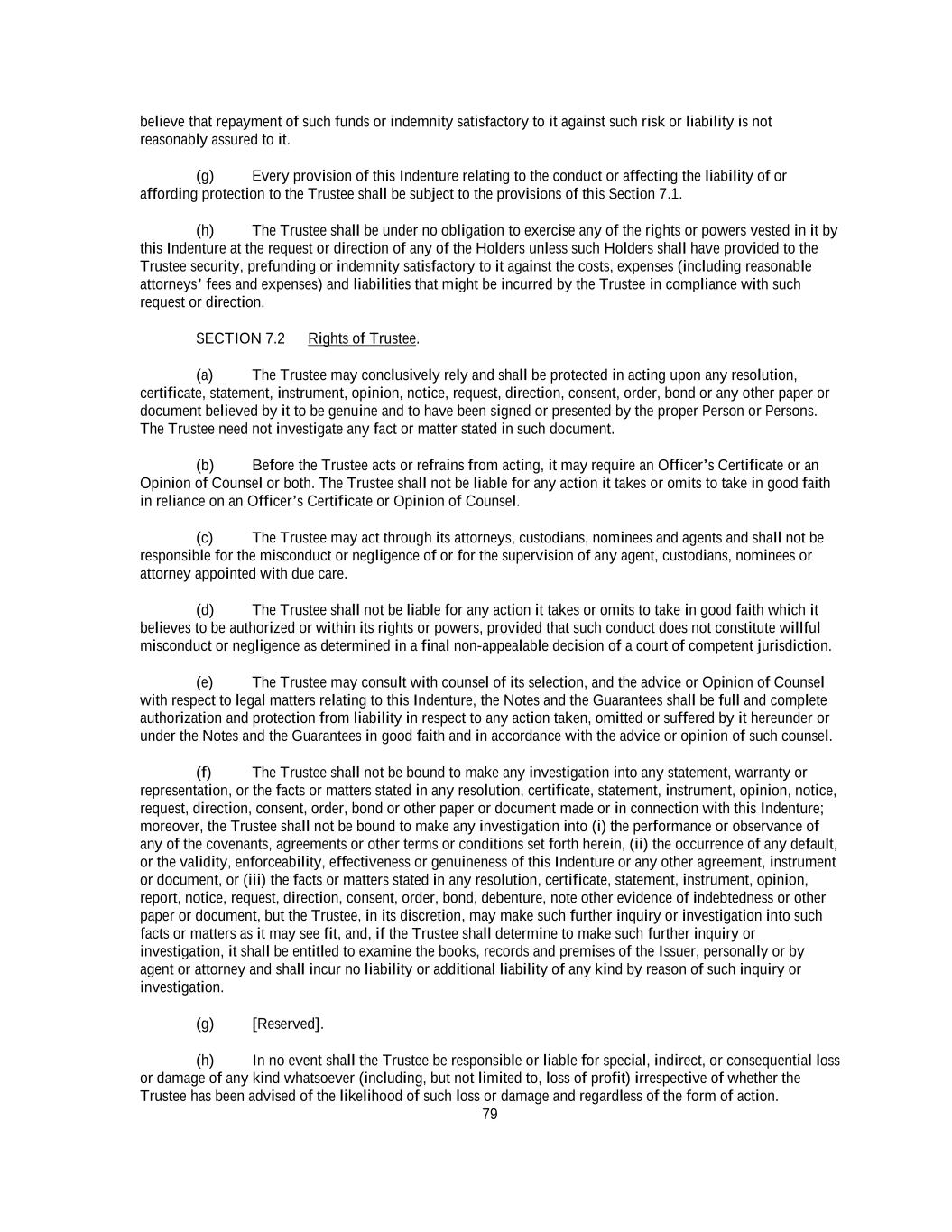 79 believe that repayment of such funds or indemnity satisfactory to it against such risk or liability is not reasonably assured to it. (g) Every provision of this Indenture relating to the conduct or affecting the liability of or affording protection to the Trustee shall be subject to the provisions of this Section 7.1. (h) The Trustee shall be under no obligation to exercise any of the rights or powers vested in it by this Indenture at the request or direction of any of the Holders unless such Holders shall have provided to the Trustee security, prefunding or indemnity satisfactory to it against the costs, expenses (including reasonable attorneys’ fees and expenses) and liabilities that might be incurred by the Trustee in compliance with such request or direction. SECTION 7.2 Rights of Trustee. (a) The Trustee may conclusively rely and shall be protected in acting upon any resolution, certificate, statement, instrument, opinion, notice, request, direction, consent, order, bond or any other paper or document believed by it to be genuine and to have been signed or presented by the proper Person or Persons. The Trustee need not investigate any fact or matter stated in such document. (b) Before the Trustee acts or refrains from acting, it may require an Officer’s Certificate or an Opinion of Counsel or both. The Trustee shall not be liable for any action it takes or omits to take in good faith in reliance on an Officer’s Certificate or Opinion of Counsel. (c) The Trustee may act through its attorneys, custodians, nominees and agents and shall not be responsible for the misconduct or negligence of or for the supervision of any agent, custodians, nominees or attorney appointed with due care. (d) The Trustee shall not be liable for any action it takes or omits to take in good faith which it believes to be authorized or within its rights or powers, provided that such conduct does not constitute willful misconduct or negligence as determined in a final non-appealable decision of a court of competent jurisdiction. (e) The Trustee may consult with counsel of its selection, and the advice or Opinion of Counsel with respect to legal matters relating to this Indenture, the Notes and the Guarantees shall be full and complete authorization and protection from liability in respect to any action taken, omitted or suffered by it hereunder or under the Notes and the Guarantees in good faith and in accordance with the advice or opinion of such counsel. (f) The Trustee shall not be bound to make any investigation into any statement, warranty or representation, or the facts or matters stated in any resolution, certificate, statement, instrument, opinion, notice, request, direction, consent, order, bond or other paper or document made or in connection with this Indenture; moreover, the Trustee shall not be bound to make any investigation into (i) the performance or observance of any of the covenants, agreements or other terms or conditions set forth herein, (ii) the occurrence of any default, or the validity, enforceability, effectiveness or genuineness of this Indenture or any other agreement, instrument or document, or (iii) the facts or matters stated in any resolution, certificate, statement, instrument, opinion, report, notice, request, direction, consent, order, bond, debenture, note other evidence of indebtedness or other paper or document, but the Trustee, in its discretion, may make such further inquiry or investigation into such facts or matters as it may see fit, and, if the Trustee shall determine to make such further inquiry or investigation, it shall be entitled to examine the books, records and premises of the Issuer, personally or by agent or attorney and shall incur no liability or additional liability of any kind by reason of such inquiry or investigation. (g) [Reserved]. (h) In no event shall the Trustee be responsible or liable for special, indirect, or consequential loss or damage of any kind whatsoever (including, but not limited to, loss of profit) irrespective of whether the Trustee has been advised of the likelihood of such loss or damage and regardless of the form of action.