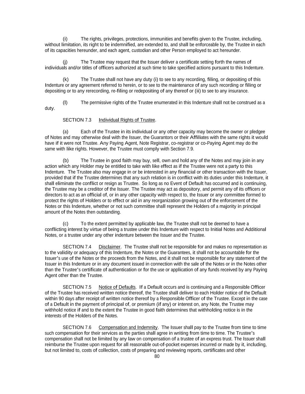 80 (i) The rights, privileges, protections, immunities and benefits given to the Trustee, including, without limitation, its right to be indemnified, are extended to, and shall be enforceable by, the Trustee in each of its capacities hereunder, and each agent, custodian and other Person employed to act hereunder. (j) The Trustee may request that the Issuer deliver a certificate setting forth the names of individuals and/or titles of officers authorized at such time to take specified actions pursuant to this Indenture. (k) The Trustee shall not have any duty (i) to see to any recording, filing, or depositing of this Indenture or any agreement referred to herein, or to see to the maintenance of any such recording or filing or depositing or to any rerecording, re-filing or redepositing of any thereof or (ii) to see to any insurance. (l) The permissive rights of the Trustee enumerated in this Indenture shall not be construed as a duty. SECTION 7.3 Individual Rights of Trustee. (a) Each of the Trustee in its individual or any other capacity may become the owner or pledgee of Notes and may otherwise deal with the Issuer, the Guarantors or their Affiliates with the same rights it would have if it were not Trustee. Any Paying Agent, Note Registrar, co-registrar or co-Paying Agent may do the same with like rights. However, the Trustee must comply with Section 7.9. (b) The Trustee in good faith may buy, sell, own and hold any of the Notes and may join in any action which any Holder may be entitled to take with like effect as if the Trustee were not a party to this Indenture. The Trustee also may engage in or be interested in any financial or other transaction with the Issuer, provided that if the Trustee determines that any such relation is in conflict with its duties under this Indenture, it shall eliminate the conflict or resign as Trustee. So long as no Event of Default has occurred and is continuing, the Trustee may be a creditor of the Issuer. The Trustee may act as depository, and permit any of its officers or directors to act as an official of, or in any other capacity with respect to, the Issuer or any committee formed to protect the rights of Holders or to effect or aid in any reorganization growing out of the enforcement of the Notes or this Indenture, whether or not such committee shall represent the Holders of a majority in principal amount of the Notes then outstanding. (c) To the extent permitted by applicable law, the Trustee shall not be deemed to have a conflicting interest by virtue of being a trustee under this Indenture with respect to Initial Notes and Additional Notes, or a trustee under any other indenture between the Issuer and the Trustee. SECTION 7.4 Disclaimer. The Trustee shall not be responsible for and makes no representation as to the validity or adequacy of this Indenture, the Notes or the Guarantees, it shall not be accountable for the Issuer’s use of the Notes or the proceeds from the Notes, and it shall not be responsible for any statement of the Issuer in this Indenture or in any document issued in connection with the sale of the Notes or in the Notes other than the Trustee’s certificate of authentication or for the use or application of any funds received by any Paying Agent other than the Trustee. SECTION 7.5 Notice of Defaults. If a Default occurs and is continuing and a Responsible Officer of the Trustee has received written notice thereof, the Trustee shall deliver to each Holder notice of the Default within 90 days after receipt of written notice thereof by a Responsible Officer of the Trustee. Except in the case of a Default in the payment of principal of, or premium (if any) or interest on, any Note, the Trustee may withhold notice if and to the extent the Trustee in good faith determines that withholding notice is in the interests of the Holders of the Notes. SECTION 7.6 Compensation and Indemnity. The Issuer shall pay to the Trustee from time to time such compensation for their services as the parties shall agree in writing from time to time. The Trustee’s compensation shall not be limited by any law on compensation of a trustee of an express trust. The Issuer shall reimburse the Trustee upon request for all reasonable out-of-pocket expenses incurred or made by it, including, but not limited to, costs of collection, costs of preparing and reviewing reports, certificates and other