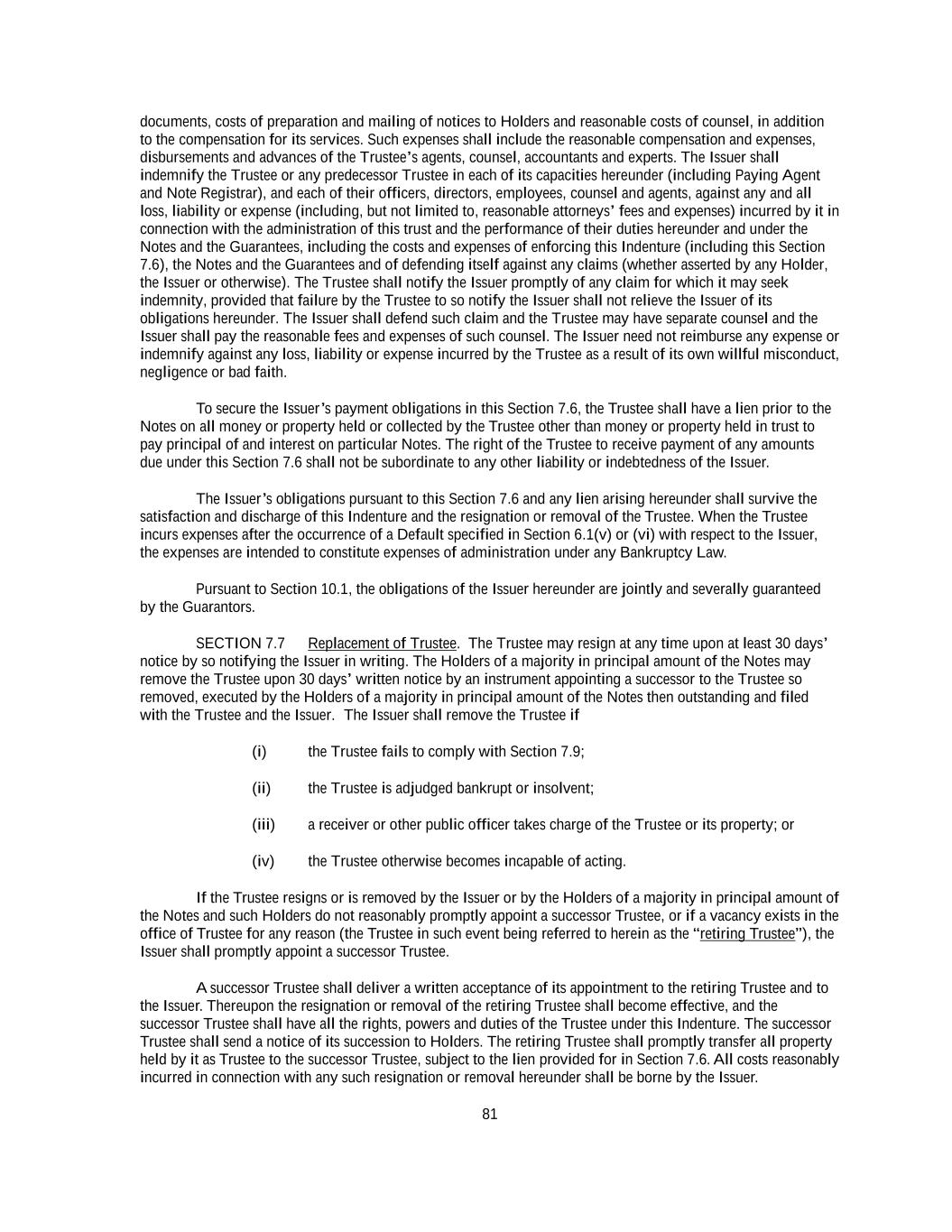 81 documents, costs of preparation and mailing of notices to Holders and reasonable costs of counsel, in addition to the compensation for its services. Such expenses shall include the reasonable compensation and expenses, disbursements and advances of the Trustee’s agents, counsel, accountants and experts. The Issuer shall indemnify the Trustee or any predecessor Trustee in each of its capacities hereunder (including Paying Agent and Note Registrar), and each of their officers, directors, employees, counsel and agents, against any and all loss, liability or expense (including, but not limited to, reasonable attorneys’ fees and expenses) incurred by it in connection with the administration of this trust and the performance of their duties hereunder and under the Notes and the Guarantees, including the costs and expenses of enforcing this Indenture (including this Section 7.6), the Notes and the Guarantees and of defending itself against any claims (whether asserted by any Holder, the Issuer or otherwise). The Trustee shall notify the Issuer promptly of any claim for which it may seek indemnity, provided that failure by the Trustee to so notify the Issuer shall not relieve the Issuer of its obligations hereunder. The Issuer shall defend such claim and the Trustee may have separate counsel and the Issuer shall pay the reasonable fees and expenses of such counsel. The Issuer need not reimburse any expense or indemnify against any loss, liability or expense incurred by the Trustee as a result of its own willful misconduct, negligence or bad faith. To secure the Issuer’s payment obligations in this Section 7.6, the Trustee shall have a lien prior to the Notes on all money or property held or collected by the Trustee other than money or property held in trust to pay principal of and interest on particular Notes. The right of the Trustee to receive payment of any amounts due under this Section 7.6 shall not be subordinate to any other liability or indebtedness of the Issuer. The Issuer’s obligations pursuant to this Section 7.6 and any lien arising hereunder shall survive the satisfaction and discharge of this Indenture and the resignation or removal of the Trustee. When the Trustee incurs expenses after the occurrence of a Default specified in Section 6.1(v) or (vi) with respect to the Issuer, the expenses are intended to constitute expenses of administration under any Bankruptcy Law. Pursuant to Section 10.1, the obligations of the Issuer hereunder are jointly and severally guaranteed by the Guarantors. SECTION 7.7 Replacement of Trustee. The Trustee may resign at any time upon at least 30 days’ notice by so notifying the Issuer in writing. The Holders of a majority in principal amount of the Notes may remove the Trustee upon 30 days’ written notice by an instrument appointing a successor to the Trustee so removed, executed by the Holders of a majority in principal amount of the Notes then outstanding and filed with the Trustee and the Issuer. The Issuer shall remove the Trustee if (i) the Trustee fails to comply with Section 7.9; (ii) the Trustee is adjudged bankrupt or insolvent; (iii) a receiver or other public officer takes charge of the Trustee or its property; or (iv) the Trustee otherwise becomes incapable of acting. If the Trustee resigns or is removed by the Issuer or by the Holders of a majority in principal amount of the Notes and such Holders do not reasonably promptly appoint a successor Trustee, or if a vacancy exists in the office of Trustee for any reason (the Trustee in such event being referred to herein as the “retiring Trustee”), the Issuer shall promptly appoint a successor Trustee. A successor Trustee shall deliver a written acceptance of its appointment to the retiring Trustee and to the Issuer. Thereupon the resignation or removal of the retiring Trustee shall become effective, and the successor Trustee shall have all the rights, powers and duties of the Trustee under this Indenture. The successor Trustee shall send a notice of its succession to Holders. The retiring Trustee shall promptly transfer all property held by it as Trustee to the successor Trustee, subject to the lien provided for in Section 7.6. All costs reasonably incurred in connection with any such resignation or removal hereunder shall be borne by the Issuer.