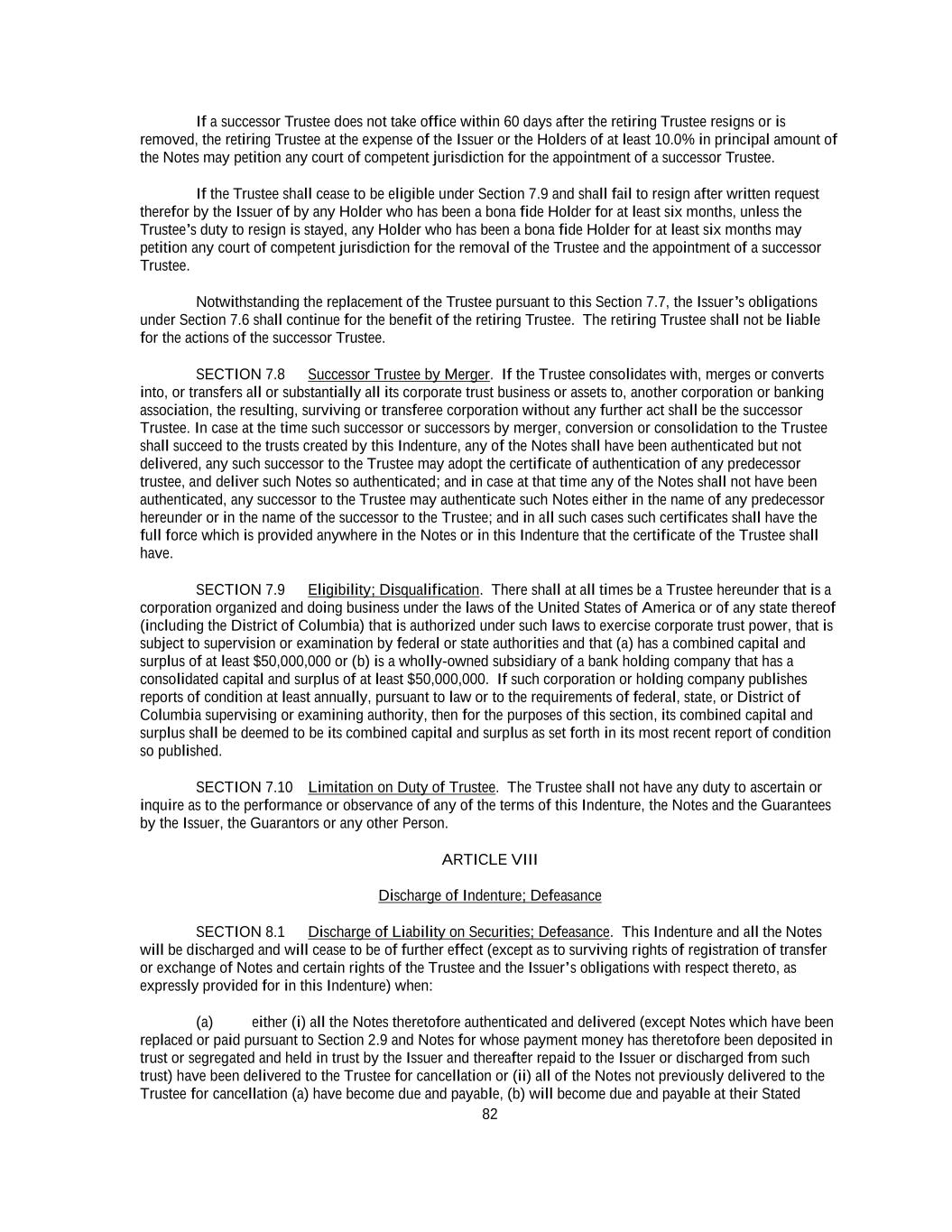 82 If a successor Trustee does not take office within 60 days after the retiring Trustee resigns or is removed, the retiring Trustee at the expense of the Issuer or the Holders of at least 10.0% in principal amount of the Notes may petition any court of competent jurisdiction for the appointment of a successor Trustee. If the Trustee shall cease to be eligible under Section 7.9 and shall fail to resign after written request therefor by the Issuer of by any Holder who has been a bona fide Holder for at least six months, unless the Trustee’s duty to resign is stayed, any Holder who has been a bona fide Holder for at least six months may petition any court of competent jurisdiction for the removal of the Trustee and the appointment of a successor Trustee. Notwithstanding the replacement of the Trustee pursuant to this Section 7.7, the Issuer’s obligations under Section 7.6 shall continue for the benefit of the retiring Trustee. The retiring Trustee shall not be liable for the actions of the successor Trustee. SECTION 7.8 Successor Trustee by Merger. If the Trustee consolidates with, merges or converts into, or transfers all or substantially all its corporate trust business or assets to, another corporation or banking association, the resulting, surviving or transferee corporation without any further act shall be the successor Trustee. In case at the time such successor or successors by merger, conversion or consolidation to the Trustee shall succeed to the trusts created by this Indenture, any of the Notes shall have been authenticated but not delivered, any such successor to the Trustee may adopt the certificate of authentication of any predecessor trustee, and deliver such Notes so authenticated; and in case at that time any of the Notes shall not have been authenticated, any successor to the Trustee may authenticate such Notes either in the name of any predecessor hereunder or in the name of the successor to the Trustee; and in all such cases such certificates shall have the full force which is provided anywhere in the Notes or in this Indenture that the certificate of the Trustee shall have. SECTION 7.9 Eligibility; Disqualification. There shall at all times be a Trustee hereunder that is a corporation organized and doing business under the laws of the United States of America or of any state thereof (including the District of Columbia) that is authorized under such laws to exercise corporate trust power, that is subject to supervision or examination by federal or state authorities and that (a) has a combined capital and surplus of at least $50,000,000 or (b) is a wholly-owned subsidiary of a bank holding company that has a consolidated capital and surplus of at least $50,000,000. If such corporation or holding company publishes reports of condition at least annually, pursuant to law or to the requirements of federal, state, or District of Columbia supervising or examining authority, then for the purposes of this section, its combined capital and surplus shall be deemed to be its combined capital and surplus as set forth in its most recent report of condition so published. SECTION 7.10 Limitation on Duty of Trustee. The Trustee shall not have any duty to ascertain or inquire as to the performance or observance of any of the terms of this Indenture, the Notes and the Guarantees by the Issuer, the Guarantors or any other Person. ARTICLE VIII Discharge of Indenture; Defeasance SECTION 8.1 Discharge of Liability on Securities; Defeasance. This Indenture and all the Notes will be discharged and will cease to be of further effect (except as to surviving rights of registration of transfer or exchange of Notes and certain rights of the Trustee and the Issuer’s obligations with respect thereto, as expressly provided for in this Indenture) when: (a) either (i) all the Notes theretofore authenticated and delivered (except Notes which have been replaced or paid pursuant to Section 2.9 and Notes for whose payment money has theretofore been deposited in trust or segregated and held in trust by the Issuer and thereafter repaid to the Issuer or discharged from such trust) have been delivered to the Trustee for cancellation or (ii) all of the Notes not previously delivered to the Trustee for cancellation (a) have become due and payable, (b) will become due and payable at their Stated