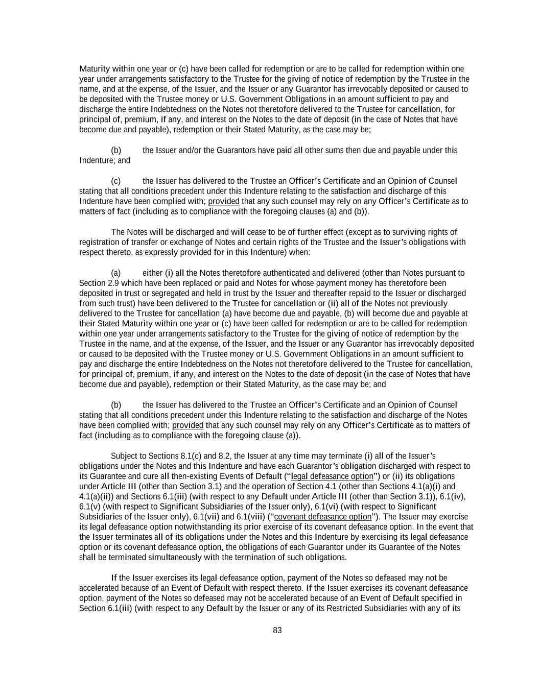 83 Maturity within one year or (c) have been called for redemption or are to be called for redemption within one year under arrangements satisfactory to the Trustee for the giving of notice of redemption by the Trustee in the name, and at the expense, of the Issuer, and the Issuer or any Guarantor has irrevocably deposited or caused to be deposited with the Trustee money or U.S. Government Obligations in an amount sufficient to pay and discharge the entire Indebtedness on the Notes not theretofore delivered to the Trustee for cancellation, for principal of, premium, if any, and interest on the Notes to the date of deposit (in the case of Notes that have become due and payable), redemption or their Stated Maturity, as the case may be; (b) the Issuer and/or the Guarantors have paid all other sums then due and payable under this Indenture; and (c) the Issuer has delivered to the Trustee an Officer’s Certificate and an Opinion of Counsel stating that all conditions precedent under this Indenture relating to the satisfaction and discharge of this Indenture have been complied with; provided that any such counsel may rely on any Officer’s Certificate as to matters of fact (including as to compliance with the foregoing clauses (a) and (b)). The Notes will be discharged and will cease to be of further effect (except as to surviving rights of registration of transfer or exchange of Notes and certain rights of the Trustee and the Issuer’s obligations with respect thereto, as expressly provided for in this Indenture) when: (a) either (i) all the Notes theretofore authenticated and delivered (other than Notes pursuant to Section 2.9 which have been replaced or paid and Notes for whose payment money has theretofore been deposited in trust or segregated and held in trust by the Issuer and thereafter repaid to the Issuer or discharged from such trust) have been delivered to the Trustee for cancellation or (ii) all of the Notes not previously delivered to the Trustee for cancellation (a) have become due and payable, (b) will become due and payable at their Stated Maturity within one year or (c) have been called for redemption or are to be called for redemption within one year under arrangements satisfactory to the Trustee for the giving of notice of redemption by the Trustee in the name, and at the expense, of the Issuer, and the Issuer or any Guarantor has irrevocably deposited or caused to be deposited with the Trustee money or U.S. Government Obligations in an amount sufficient to pay and discharge the entire Indebtedness on the Notes not theretofore delivered to the Trustee for cancellation, for principal of, premium, if any, and interest on the Notes to the date of deposit (in the case of Notes that have become due and payable), redemption or their Stated Maturity, as the case may be; and (b) the Issuer has delivered to the Trustee an Officer’s Certificate and an Opinion of Counsel stating that all conditions precedent under this Indenture relating to the satisfaction and discharge of the Notes have been complied with; provided that any such counsel may rely on any Officer’s Certificate as to matters of fact (including as to compliance with the foregoing clause (a)). Subject to Sections 8.1(c) and 8.2, the Issuer at any time may terminate (i) all of the Issuer’s obligations under the Notes and this Indenture and have each Guarantor’s obligation discharged with respect to its Guarantee and cure all then-existing Events of Default (“legal defeasance option”) or (ii) its obligations under Article III (other than Section 3.1) and the operation of Section 4.1 (other than Sections 4.1(a)(i) and 4.1(a)(ii)) and Sections 6.1(iii) (with respect to any Default under Article III (other than Section 3.1)), 6.1(iv), 6.1(v) (with respect to Significant Subsidiaries of the Issuer only), 6.1(vi) (with respect to Significant Subsidiaries of the Issuer only), 6.1(vii) and 6.1(viii) (“covenant defeasance option”). The Issuer may exercise its legal defeasance option notwithstanding its prior exercise of its covenant defeasance option. In the event that the Issuer terminates all of its obligations under the Notes and this Indenture by exercising its legal defeasance option or its covenant defeasance option, the obligations of each Guarantor under its Guarantee of the Notes shall be terminated simultaneously with the termination of such obligations. If the Issuer exercises its legal defeasance option, payment of the Notes so defeased may not be accelerated because of an Event of Default with respect thereto. If the Issuer exercises its covenant defeasance option, payment of the Notes so defeased may not be accelerated because of an Event of Default specified in Section 6.1(iii) (with respect to any Default by the Issuer or any of its Restricted Subsidiaries with any of its