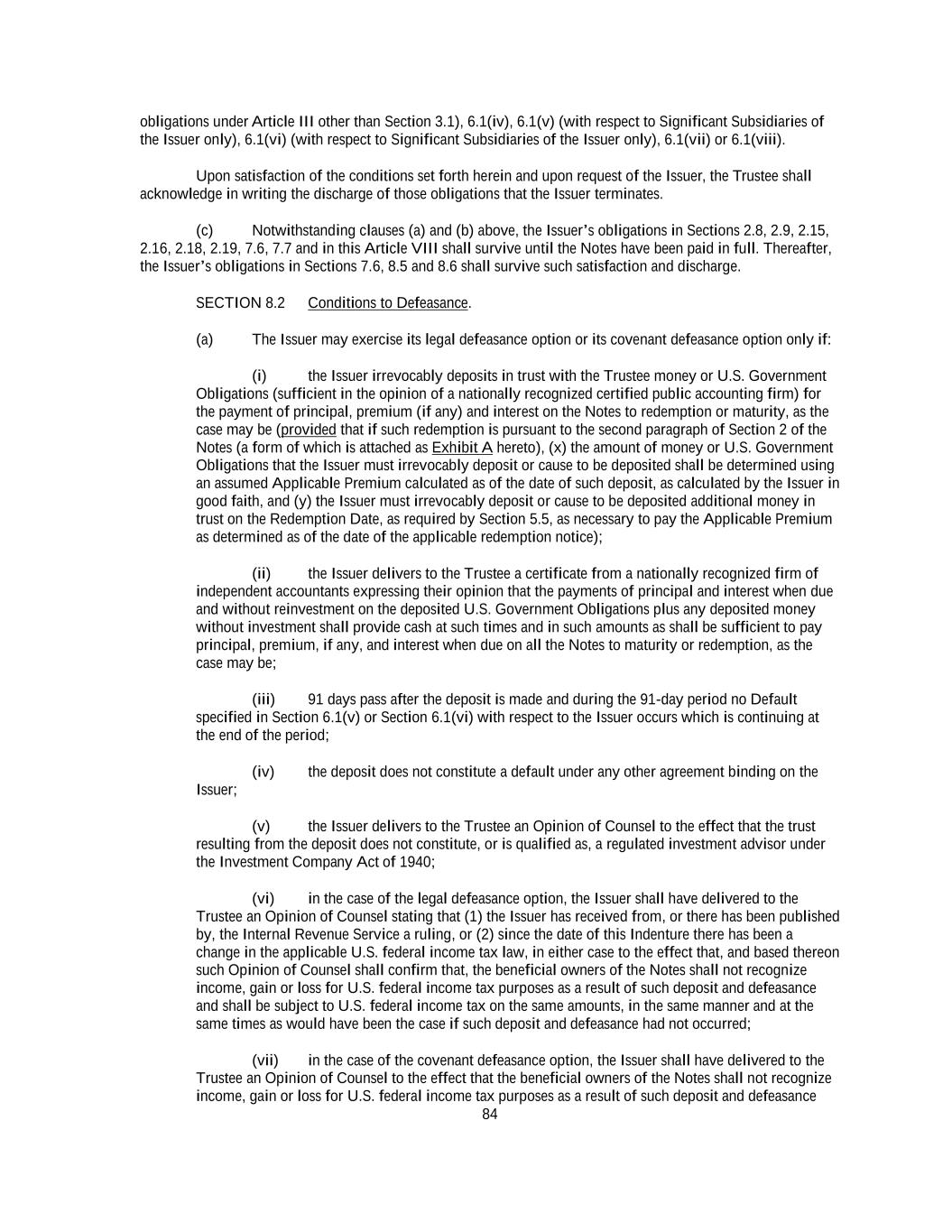 84 obligations under Article III other than Section 3.1), 6.1(iv), 6.1(v) (with respect to Significant Subsidiaries of the Issuer only), 6.1(vi) (with respect to Significant Subsidiaries of the Issuer only), 6.1(vii) or 6.1(viii). Upon satisfaction of the conditions set forth herein and upon request of the Issuer, the Trustee shall acknowledge in writing the discharge of those obligations that the Issuer terminates. (c) Notwithstanding clauses (a) and (b) above, the Issuer’s obligations in Sections 2.8, 2.9, 2.15, 2.16, 2.18, 2.19, 7.6, 7.7 and in this Article VIII shall survive until the Notes have been paid in full. Thereafter, the Issuer’s obligations in Sections 7.6, 8.5 and 8.6 shall survive such satisfaction and discharge. SECTION 8.2 Conditions to Defeasance. (a) The Issuer may exercise its legal defeasance option or its covenant defeasance option only if: (i) the Issuer irrevocably deposits in trust with the Trustee money or U.S. Government Obligations (sufficient in the opinion of a nationally recognized certified public accounting firm) for the payment of principal, premium (if any) and interest on the Notes to redemption or maturity, as the case may be (provided that if such redemption is pursuant to the second paragraph of Section 2 of the Notes (a form of which is attached as Exhibit A hereto), (x) the amount of money or U.S. Government Obligations that the Issuer must irrevocably deposit or cause to be deposited shall be determined using an assumed Applicable Premium calculated as of the date of such deposit, as calculated by the Issuer in good faith, and (y) the Issuer must irrevocably deposit or cause to be deposited additional money in trust on the Redemption Date, as required by Section 5.5, as necessary to pay the Applicable Premium as determined as of the date of the applicable redemption notice); (ii) the Issuer delivers to the Trustee a certificate from a nationally recognized firm of independent accountants expressing their opinion that the payments of principal and interest when due and without reinvestment on the deposited U.S. Government Obligations plus any deposited money without investment shall provide cash at such times and in such amounts as shall be sufficient to pay principal, premium, if any, and interest when due on all the Notes to maturity or redemption, as the case may be; (iii) 91 days pass after the deposit is made and during the 91-day period no Default specified in Section 6.1(v) or Section 6.1(vi) with respect to the Issuer occurs which is continuing at the end of the period; (iv) the deposit does not constitute a default under any other agreement binding on the Issuer; (v) the Issuer delivers to the Trustee an Opinion of Counsel to the effect that the trust resulting from the deposit does not constitute, or is qualified as, a regulated investment advisor under the Investment Company Act of 1940; (vi) in the case of the legal defeasance option, the Issuer shall have delivered to the Trustee an Opinion of Counsel stating that (1) the Issuer has received from, or there has been published by, the Internal Revenue Service a ruling, or (2) since the date of this Indenture there has been a change in the applicable U.S. federal income tax law, in either case to the effect that, and based thereon such Opinion of Counsel shall confirm that, the beneficial owners of the Notes shall not recognize income, gain or loss for U.S. federal income tax purposes as a result of such deposit and defeasance and shall be subject to U.S. federal income tax on the same amounts, in the same manner and at the same times as would have been the case if such deposit and defeasance had not occurred; (vii) in the case of the covenant defeasance option, the Issuer shall have delivered to the Trustee an Opinion of Counsel to the effect that the beneficial owners of the Notes shall not recognize income, gain or loss for U.S. federal income tax purposes as a result of such deposit and defeasance