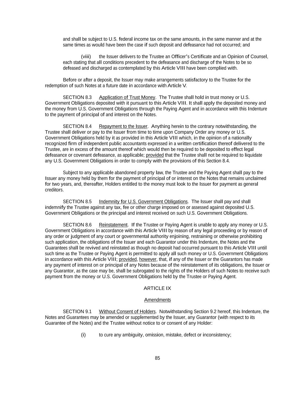 85 and shall be subject to U.S. federal income tax on the same amounts, in the same manner and at the same times as would have been the case if such deposit and defeasance had not occurred; and (viii) the Issuer delivers to the Trustee an Officer’s Certificate and an Opinion of Counsel, each stating that all conditions precedent to the defeasance and discharge of the Notes to be so defeased and discharged as contemplated by this Article VIII have been complied with. Before or after a deposit, the Issuer may make arrangements satisfactory to the Trustee for the redemption of such Notes at a future date in accordance with Article V. SECTION 8.3 Application of Trust Money. The Trustee shall hold in trust money or U.S. Government Obligations deposited with it pursuant to this Article VIII. It shall apply the deposited money and the money from U.S. Government Obligations through the Paying Agent and in accordance with this Indenture to the payment of principal of and interest on the Notes. SECTION 8.4 Repayment to the Issuer. Anything herein to the contrary notwithstanding, the Trustee shall deliver or pay to the Issuer from time to time upon Company Order any money or U.S. Government Obligations held by it as provided in this Article VIII which, in the opinion of a nationally recognized firm of independent public accountants expressed in a written certification thereof delivered to the Trustee, are in excess of the amount thereof which would then be required to be deposited to effect legal defeasance or covenant defeasance, as applicable; provided that the Trustee shall not be required to liquidate any U.S. Government Obligations in order to comply with the provisions of this Section 8.4. Subject to any applicable abandoned property law, the Trustee and the Paying Agent shall pay to the Issuer any money held by them for the payment of principal of or interest on the Notes that remains unclaimed for two years, and, thereafter, Holders entitled to the money must look to the Issuer for payment as general creditors. SECTION 8.5 Indemnity for U.S. Government Obligations. The Issuer shall pay and shall indemnify the Trustee against any tax, fee or other charge imposed on or assessed against deposited U.S. Government Obligations or the principal and interest received on such U.S. Government Obligations. SECTION 8.6 Reinstatement. If the Trustee or Paying Agent is unable to apply any money or U.S. Government Obligations in accordance with this Article VIII by reason of any legal proceeding or by reason of any order or judgment of any court or governmental authority enjoining, restraining or otherwise prohibiting such application, the obligations of the Issuer and each Guarantor under this Indenture, the Notes and the Guarantees shall be revived and reinstated as though no deposit had occurred pursuant to this Article VIII until such time as the Trustee or Paying Agent is permitted to apply all such money or U.S. Government Obligations in accordance with this Article VIII; provided, however, that, if any of the Issuer or the Guarantors has made any payment of interest on or principal of any Notes because of the reinstatement of its obligations, the Issuer or any Guarantor, as the case may be, shall be subrogated to the rights of the Holders of such Notes to receive such payment from the money or U.S. Government Obligations held by the Trustee or Paying Agent. ARTICLE IX Amendments SECTION 9.1 Without Consent of Holders. Notwithstanding Section 9.2 hereof, this Indenture, the Notes and Guarantees may be amended or supplemented by the Issuer, any Guarantor (with respect to its Guarantee of the Notes) and the Trustee without notice to or consent of any Holder: (i) to cure any ambiguity, omission, mistake, defect or inconsistency;