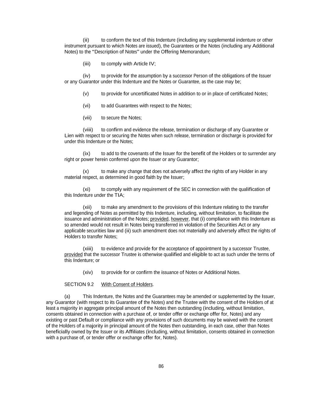 86 (ii) to conform the text of this Indenture (including any supplemental indenture or other instrument pursuant to which Notes are issued), the Guarantees or the Notes (including any Additional Notes) to the “Description of Notes” under the Offering Memorandum; (iii) to comply with Article IV; (iv) to provide for the assumption by a successor Person of the obligations of the Issuer or any Guarantor under this Indenture and the Notes or Guarantee, as the case may be; (v) to provide for uncertificated Notes in addition to or in place of certificated Notes; (vi) to add Guarantees with respect to the Notes; (vii) to secure the Notes; (viii) to confirm and evidence the release, termination or discharge of any Guarantee or Lien with respect to or securing the Notes when such release, termination or discharge is provided for under this Indenture or the Notes; (ix) to add to the covenants of the Issuer for the benefit of the Holders or to surrender any right or power herein conferred upon the Issuer or any Guarantor; (x) to make any change that does not adversely affect the rights of any Holder in any material respect, as determined in good faith by the Issuer; (xi) to comply with any requirement of the SEC in connection with the qualification of this Indenture under the TIA; (xii) to make any amendment to the provisions of this Indenture relating to the transfer and legending of Notes as permitted by this Indenture, including, without limitation, to facilitate the issuance and administration of the Notes; provided, however, that (i) compliance with this Indenture as so amended would not result in Notes being transferred in violation of the Securities Act or any applicable securities law and (ii) such amendment does not materially and adversely affect the rights of Holders to transfer Notes; (xiii) to evidence and provide for the acceptance of appointment by a successor Trustee, provided that the successor Trustee is otherwise qualified and eligible to act as such under the terms of this Indenture; or (xiv) to provide for or confirm the issuance of Notes or Additional Notes. SECTION 9.2 With Consent of Holders. (a) This Indenture, the Notes and the Guarantees may be amended or supplemented by the Issuer, any Guarantor (with respect to its Guarantee of the Notes) and the Trustee with the consent of the Holders of at least a majority in aggregate principal amount of the Notes then outstanding (including, without limitation, consents obtained in connection with a purchase of, or tender offer or exchange offer for, Notes) and any existing or past Default or compliance with any provisions of such documents may be waived with the consent of the Holders of a majority in principal amount of the Notes then outstanding, in each case, other than Notes beneficially owned by the Issuer or its Affiliates (including, without limitation, consents obtained in connection with a purchase of, or tender offer or exchange offer for, Notes).