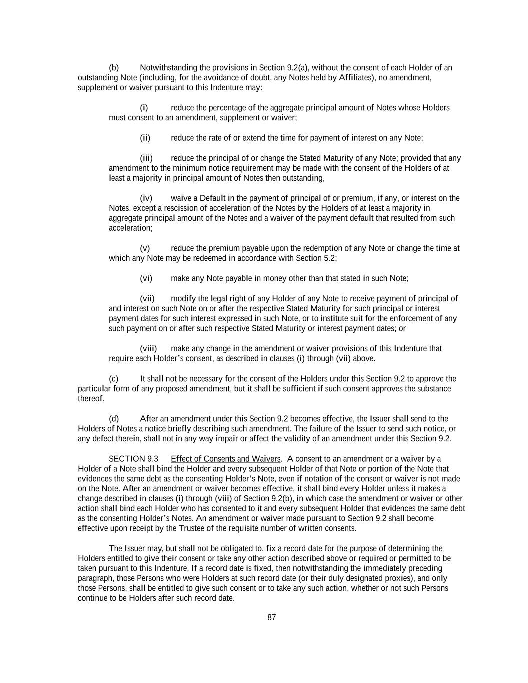 87 (b) Notwithstanding the provisions in Section 9.2(a), without the consent of each Holder of an outstanding Note (including, for the avoidance of doubt, any Notes held by Affiliates), no amendment, supplement or waiver pursuant to this Indenture may: (i) reduce the percentage of the aggregate principal amount of Notes whose Holders must consent to an amendment, supplement or waiver; (ii) reduce the rate of or extend the time for payment of interest on any Note; (iii) reduce the principal of or change the Stated Maturity of any Note; provided that any amendment to the minimum notice requirement may be made with the consent of the Holders of at least a majority in principal amount of Notes then outstanding, (iv) waive a Default in the payment of principal of or premium, if any, or interest on the Notes, except a rescission of acceleration of the Notes by the Holders of at least a majority in aggregate principal amount of the Notes and a waiver of the payment default that resulted from such acceleration; (v) reduce the premium payable upon the redemption of any Note or change the time at which any Note may be redeemed in accordance with Section 5.2; (vi) make any Note payable in money other than that stated in such Note; (vii) modify the legal right of any Holder of any Note to receive payment of principal of and interest on such Note on or after the respective Stated Maturity for such principal or interest payment dates for such interest expressed in such Note, or to institute suit for the enforcement of any such payment on or after such respective Stated Maturity or interest payment dates; or (viii) make any change in the amendment or waiver provisions of this Indenture that require each Holder’s consent, as described in clauses (i) through (vii) above. (c) It shall not be necessary for the consent of the Holders under this Section 9.2 to approve the particular form of any proposed amendment, but it shall be sufficient if such consent approves the substance thereof. (d) After an amendment under this Section 9.2 becomes effective, the Issuer shall send to the Holders of Notes a notice briefly describing such amendment. The failure of the Issuer to send such notice, or any defect therein, shall not in any way impair or affect the validity of an amendment under this Section 9.2. SECTION 9.3 Effect of Consents and Waivers. A consent to an amendment or a waiver by a Holder of a Note shall bind the Holder and every subsequent Holder of that Note or portion of the Note that evidences the same debt as the consenting Holder’s Note, even if notation of the consent or waiver is not made on the Note. After an amendment or waiver becomes effective, it shall bind every Holder unless it makes a change described in clauses (i) through (viii) of Section 9.2(b), in which case the amendment or waiver or other action shall bind each Holder who has consented to it and every subsequent Holder that evidences the same debt as the consenting Holder’s Notes. An amendment or waiver made pursuant to Section 9.2 shall become effective upon receipt by the Trustee of the requisite number of written consents. The Issuer may, but shall not be obligated to, fix a record date for the purpose of determining the Holders entitled to give their consent or take any other action described above or required or permitted to be taken pursuant to this Indenture. If a record date is fixed, then notwithstanding the immediately preceding paragraph, those Persons who were Holders at such record date (or their duly designated proxies), and only those Persons, shall be entitled to give such consent or to take any such action, whether or not such Persons continue to be Holders after such record date.