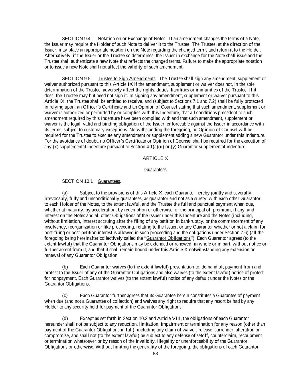 88 SECTION 9.4 Notation on or Exchange of Notes. If an amendment changes the terms of a Note, the Issuer may require the Holder of such Note to deliver it to the Trustee. The Trustee, at the direction of the Issuer, may place an appropriate notation on the Note regarding the changed terms and return it to the Holder. Alternatively, if the Issuer or the Trustee so determines, the Issuer in exchange for the Note shall issue and the Trustee shall authenticate a new Note that reflects the changed terms. Failure to make the appropriate notation or to issue a new Note shall not affect the validity of such amendment. SECTION 9.5 Trustee to Sign Amendments. The Trustee shall sign any amendment, supplement or waiver authorized pursuant to this Article IX if the amendment, supplement or waiver does not, in the sole determination of the Trustee, adversely affect the rights, duties, liabilities or immunities of the Trustee. If it does, the Trustee may but need not sign it. In signing any amendment, supplement or waiver pursuant to this Article IX, the Trustee shall be entitled to receive, and (subject to Sections 7.1 and 7.2) shall be fully protected in relying upon, an Officer’s Certificate and an Opinion of Counsel stating that such amendment, supplement or waiver is authorized or permitted by or complies with this Indenture, that all conditions precedent to such amendment required by this Indenture have been complied with and that such amendment, supplement or waiver is the legal, valid and binding obligation of the Issuer, enforceable against the Issuer in accordance with its terms, subject to customary exceptions. Notwithstanding the foregoing, no Opinion of Counsel will be required for the Trustee to execute any amendment or supplement adding a new Guarantor under this Indenture. For the avoidance of doubt, no Officer’s Certificate or Opinion of Counsel shall be required for the execution of any (x) supplemental indenture pursuant to Section 4.1(a)(ii) or (y) Guarantor supplemental indenture. ARTICLE X Guarantees SECTION 10.1 Guarantees. (a) Subject to the provisions of this Article X, each Guarantor hereby jointly and severally, irrevocably, fully and unconditionally guarantees, as guarantor and not as a surety, with each other Guarantor, to each Holder of the Notes, to the extent lawful, and the Trustee the full and punctual payment when due, whether at maturity, by acceleration, by redemption or otherwise, of the principal of, premium, if any, and interest on the Notes and all other Obligations of the Issuer under this Indenture and the Notes (including, without limitation, interest accruing after the filing of any petition in bankruptcy, or the commencement of any insolvency, reorganization or like proceeding, relating to the Issuer, or any Guarantor whether or not a claim for post-filing or post-petition interest is allowed in such proceeding and the obligations under Section 7.6) (all the foregoing being hereinafter collectively called the “Guarantor Obligations”). Each Guarantor agrees (to the extent lawful) that the Guarantor Obligations may be extended or renewed, in whole or in part, without notice or further assent from it, and that it shall remain bound under this Article X notwithstanding any extension or renewal of any Guarantor Obligation. (b) Each Guarantor waives (to the extent lawful) presentation to, demand of, payment from and protest to the Issuer of any of the Guarantor Obligations and also waives (to the extent lawful) notice of protest for nonpayment. Each Guarantor waives (to the extent lawful) notice of any default under the Notes or the Guarantor Obligations. (c) Each Guarantor further agrees that its Guarantee herein constitutes a Guarantee of payment when due (and not a Guarantee of collection) and waives any right to require that any resort be had by any Holder to any security held for payment of the Guarantor Obligations. (d) Except as set forth in Section 10.2 and Article VIII, the obligations of each Guarantor hereunder shall not be subject to any reduction, limitation, impairment or termination for any reason (other than payment of the Guarantor Obligations in full), including any claim of waiver, release, surrender, alteration or compromise, and shall not (to the extent lawful) be subject to any defense of setoff, counterclaim, recoupment or termination whatsoever or by reason of the invalidity, illegality or unenforceability of the Guarantor Obligations or otherwise. Without limiting the generality of the foregoing, the obligations of each Guarantor