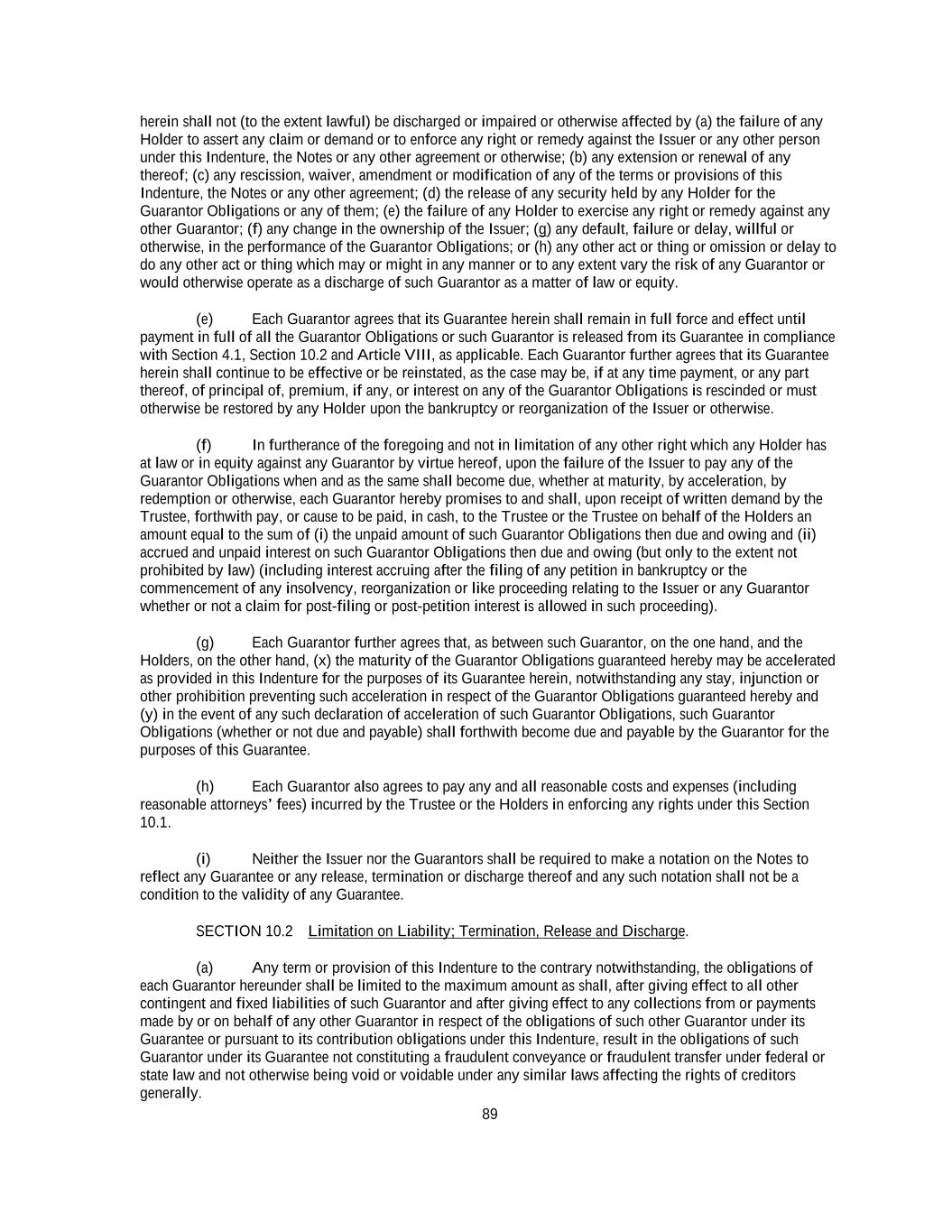 89 herein shall not (to the extent lawful) be discharged or impaired or otherwise affected by (a) the failure of any Holder to assert any claim or demand or to enforce any right or remedy against the Issuer or any other person under this Indenture, the Notes or any other agreement or otherwise; (b) any extension or renewal of any thereof; (c) any rescission, waiver, amendment or modification of any of the terms or provisions of this Indenture, the Notes or any other agreement; (d) the release of any security held by any Holder for the Guarantor Obligations or any of them; (e) the failure of any Holder to exercise any right or remedy against any other Guarantor; (f) any change in the ownership of the Issuer; (g) any default, failure or delay, willful or otherwise, in the performance of the Guarantor Obligations; or (h) any other act or thing or omission or delay to do any other act or thing which may or might in any manner or to any extent vary the risk of any Guarantor or would otherwise operate as a discharge of such Guarantor as a matter of law or equity. (e) Each Guarantor agrees that its Guarantee herein shall remain in full force and effect until payment in full of all the Guarantor Obligations or such Guarantor is released from its Guarantee in compliance with Section 4.1, Section 10.2 and Article VIII, as applicable. Each Guarantor further agrees that its Guarantee herein shall continue to be effective or be reinstated, as the case may be, if at any time payment, or any part thereof, of principal of, premium, if any, or interest on any of the Guarantor Obligations is rescinded or must otherwise be restored by any Holder upon the bankruptcy or reorganization of the Issuer or otherwise. (f) In furtherance of the foregoing and not in limitation of any other right which any Holder has at law or in equity against any Guarantor by virtue hereof, upon the failure of the Issuer to pay any of the Guarantor Obligations when and as the same shall become due, whether at maturity, by acceleration, by redemption or otherwise, each Guarantor hereby promises to and shall, upon receipt of written demand by the Trustee, forthwith pay, or cause to be paid, in cash, to the Trustee or the Trustee on behalf of the Holders an amount equal to the sum of (i) the unpaid amount of such Guarantor Obligations then due and owing and (ii) accrued and unpaid interest on such Guarantor Obligations then due and owing (but only to the extent not prohibited by law) (including interest accruing after the filing of any petition in bankruptcy or the commencement of any insolvency, reorganization or like proceeding relating to the Issuer or any Guarantor whether or not a claim for post-filing or post-petition interest is allowed in such proceeding). (g) Each Guarantor further agrees that, as between such Guarantor, on the one hand, and the Holders, on the other hand, (x) the maturity of the Guarantor Obligations guaranteed hereby may be accelerated as provided in this Indenture for the purposes of its Guarantee herein, notwithstanding any stay, injunction or other prohibition preventing such acceleration in respect of the Guarantor Obligations guaranteed hereby and (y) in the event of any such declaration of acceleration of such Guarantor Obligations, such Guarantor Obligations (whether or not due and payable) shall forthwith become due and payable by the Guarantor for the purposes of this Guarantee. (h) Each Guarantor also agrees to pay any and all reasonable costs and expenses (including reasonable attorneys’ fees) incurred by the Trustee or the Holders in enforcing any rights under this Section 10.1. (i) Neither the Issuer nor the Guarantors shall be required to make a notation on the Notes to reflect any Guarantee or any release, termination or discharge thereof and any such notation shall not be a condition to the validity of any Guarantee. SECTION 10.2 Limitation on Liability; Termination, Release and Discharge. (a) Any term or provision of this Indenture to the contrary notwithstanding, the obligations of each Guarantor hereunder shall be limited to the maximum amount as shall, after giving effect to all other contingent and fixed liabilities of such Guarantor and after giving effect to any collections from or payments made by or on behalf of any other Guarantor in respect of the obligations of such other Guarantor under its Guarantee or pursuant to its contribution obligations under this Indenture, result in the obligations of such Guarantor under its Guarantee not constituting a fraudulent conveyance or fraudulent transfer under federal or state law and not otherwise being void or voidable under any similar laws affecting the rights of creditors generally.