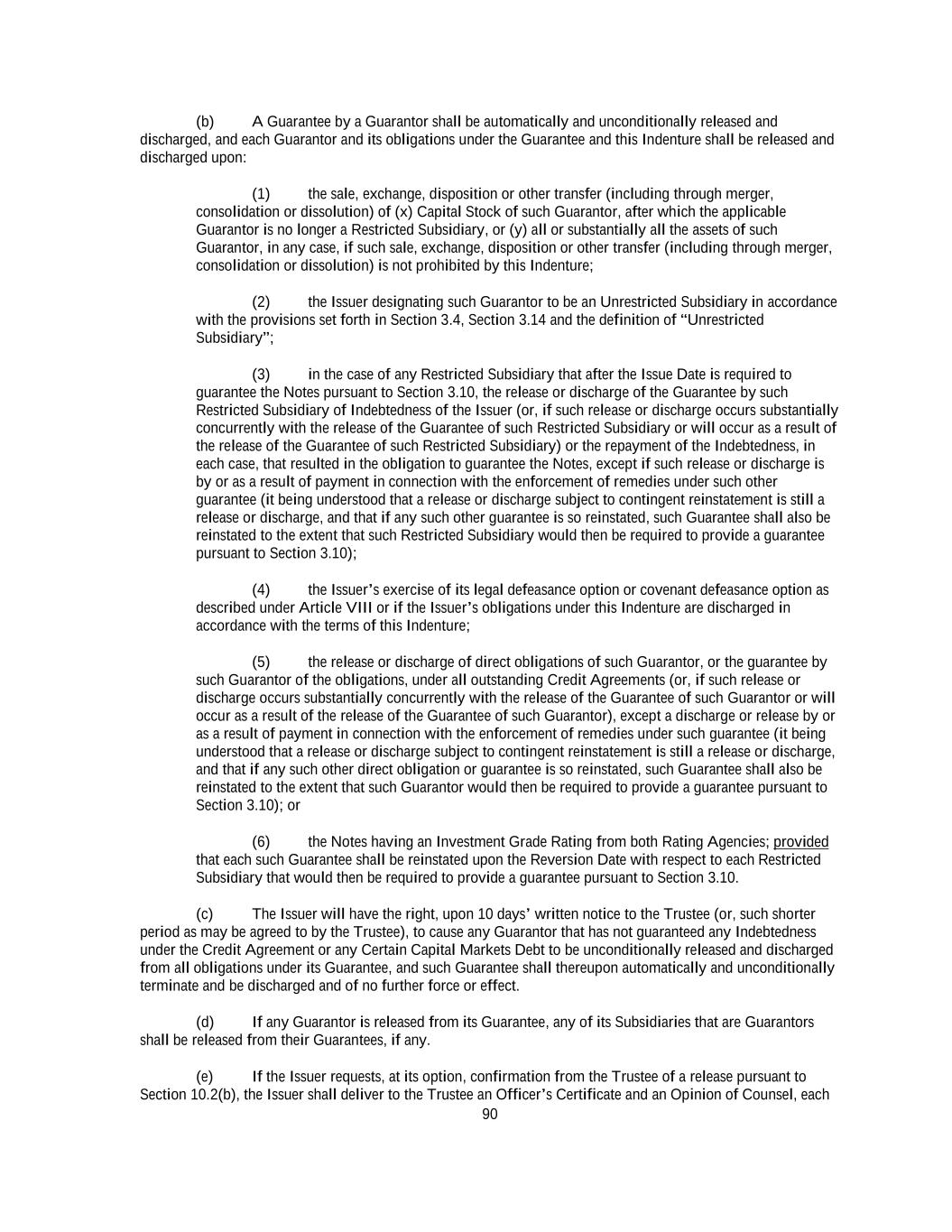 90 (b) A Guarantee by a Guarantor shall be automatically and unconditionally released and discharged, and each Guarantor and its obligations under the Guarantee and this Indenture shall be released and discharged upon: (1) the sale, exchange, disposition or other transfer (including through merger, consolidation or dissolution) of (x) Capital Stock of such Guarantor, after which the applicable Guarantor is no longer a Restricted Subsidiary, or (y) all or substantially all the assets of such Guarantor, in any case, if such sale, exchange, disposition or other transfer (including through merger, consolidation or dissolution) is not prohibited by this Indenture; (2) the Issuer designating such Guarantor to be an Unrestricted Subsidiary in accordance with the provisions set forth in Section 3.4, Section 3.14 and the definition of “Unrestricted Subsidiary”; (3) in the case of any Restricted Subsidiary that after the Issue Date is required to guarantee the Notes pursuant to Section 3.10, the release or discharge of the Guarantee by such Restricted Subsidiary of Indebtedness of the Issuer (or, if such release or discharge occurs substantially concurrently with the release of the Guarantee of such Restricted Subsidiary or will occur as a result of the release of the Guarantee of such Restricted Subsidiary) or the repayment of the Indebtedness, in each case, that resulted in the obligation to guarantee the Notes, except if such release or discharge is by or as a result of payment in connection with the enforcement of remedies under such other guarantee (it being understood that a release or discharge subject to contingent reinstatement is still a release or discharge, and that if any such other guarantee is so reinstated, such Guarantee shall also be reinstated to the extent that such Restricted Subsidiary would then be required to provide a guarantee pursuant to Section 3.10); (4) the Issuer’s exercise of its legal defeasance option or covenant defeasance option as described under Article VIII or if the Issuer’s obligations under this Indenture are discharged in accordance with the terms of this Indenture; (5) the release or discharge of direct obligations of such Guarantor, or the guarantee by such Guarantor of the obligations, under all outstanding Credit Agreements (or, if such release or discharge occurs substantially concurrently with the release of the Guarantee of such Guarantor or will occur as a result of the release of the Guarantee of such Guarantor), except a discharge or release by or as a result of payment in connection with the enforcement of remedies under such guarantee (it being understood that a release or discharge subject to contingent reinstatement is still a release or discharge, and that if any such other direct obligation or guarantee is so reinstated, such Guarantee shall also be reinstated to the extent that such Guarantor would then be required to provide a guarantee pursuant to Section 3.10); or (6) the Notes having an Investment Grade Rating from both Rating Agencies; provided that each such Guarantee shall be reinstated upon the Reversion Date with respect to each Restricted Subsidiary that would then be required to provide a guarantee pursuant to Section 3.10. (c) The Issuer will have the right, upon 10 days’ written notice to the Trustee (or, such shorter period as may be agreed to by the Trustee), to cause any Guarantor that has not guaranteed any Indebtedness under the Credit Agreement or any Certain Capital Markets Debt to be unconditionally released and discharged from all obligations under its Guarantee, and such Guarantee shall thereupon automatically and unconditionally terminate and be discharged and of no further force or effect. (d) If any Guarantor is released from its Guarantee, any of its Subsidiaries that are Guarantors shall be released from their Guarantees, if any. (e) If the Issuer requests, at its option, confirmation from the Trustee of a release pursuant to Section 10.2(b), the Issuer shall deliver to the Trustee an Officer’s Certificate and an Opinion of Counsel, each
