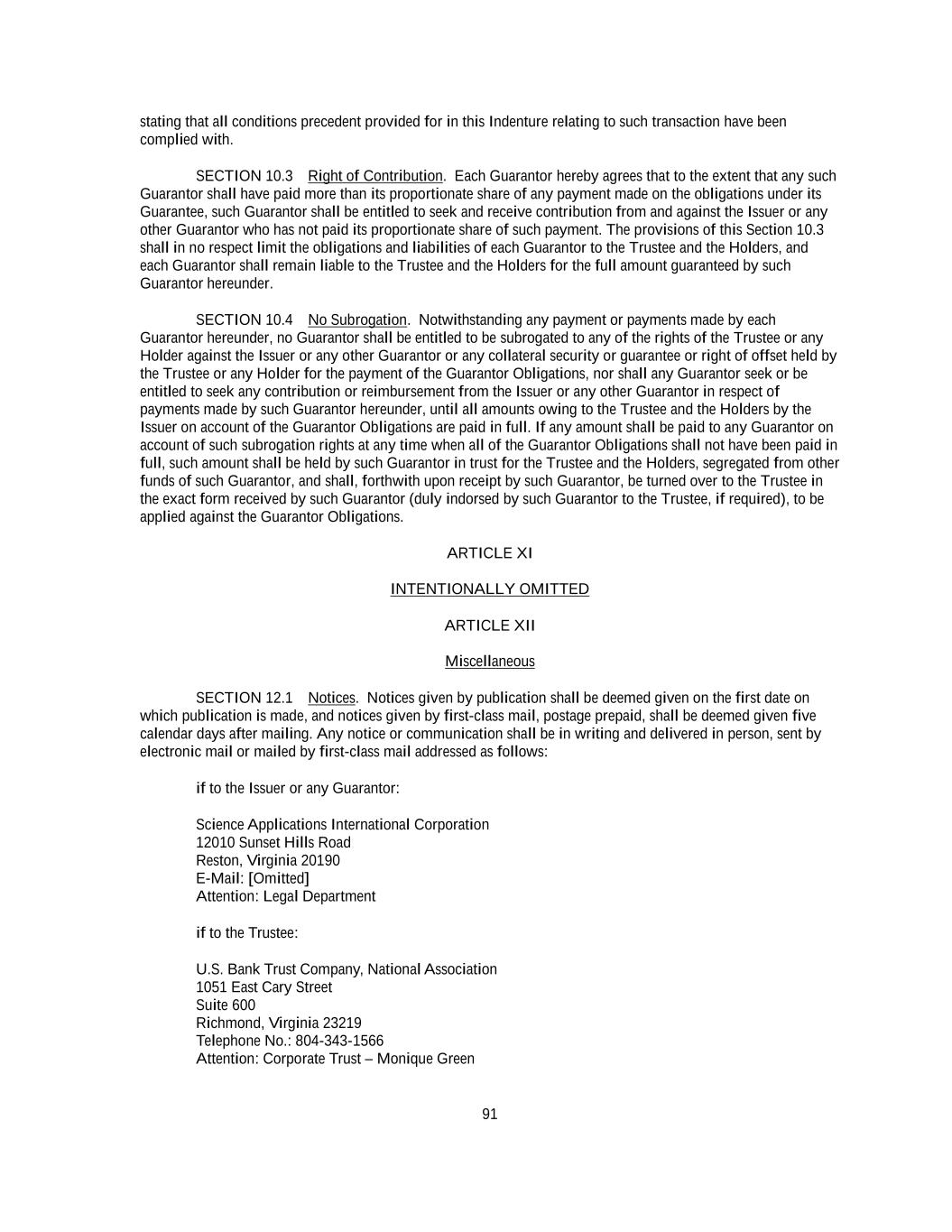 91 stating that all conditions precedent provided for in this Indenture relating to such transaction have been complied with. SECTION 10.3 Right of Contribution. Each Guarantor hereby agrees that to the extent that any such Guarantor shall have paid more than its proportionate share of any payment made on the obligations under its Guarantee, such Guarantor shall be entitled to seek and receive contribution from and against the Issuer or any other Guarantor who has not paid its proportionate share of such payment. The provisions of this Section 10.3 shall in no respect limit the obligations and liabilities of each Guarantor to the Trustee and the Holders, and each Guarantor shall remain liable to the Trustee and the Holders for the full amount guaranteed by such Guarantor hereunder. SECTION 10.4 No Subrogation. Notwithstanding any payment or payments made by each Guarantor hereunder, no Guarantor shall be entitled to be subrogated to any of the rights of the Trustee or any Holder against the Issuer or any other Guarantor or any collateral security or guarantee or right of offset held by the Trustee or any Holder for the payment of the Guarantor Obligations, nor shall any Guarantor seek or be entitled to seek any contribution or reimbursement from the Issuer or any other Guarantor in respect of payments made by such Guarantor hereunder, until all amounts owing to the Trustee and the Holders by the Issuer on account of the Guarantor Obligations are paid in full. If any amount shall be paid to any Guarantor on account of such subrogation rights at any time when all of the Guarantor Obligations shall not have been paid in full, such amount shall be held by such Guarantor in trust for the Trustee and the Holders, segregated from other funds of such Guarantor, and shall, forthwith upon receipt by such Guarantor, be turned over to the Trustee in the exact form received by such Guarantor (duly indorsed by such Guarantor to the Trustee, if required), to be applied against the Guarantor Obligations. ARTICLE XI INTENTIONALLY OMITTED ARTICLE XII Miscellaneous SECTION 12.1 Notices. Notices given by publication shall be deemed given on the first date on which publication is made, and notices given by first-class mail, postage prepaid, shall be deemed given five calendar days after mailing. Any notice or communication shall be in writing and delivered in person, sent by electronic mail or mailed by first-class mail addressed as follows: if to the Issuer or any Guarantor: Science Applications International Corporation 12010 Sunset Hills Road Reston, Virginia 20190 E-Mail: [Omitted] Attention: Legal Department if to the Trustee: U.S. Bank Trust Company, National Association 1051 East Cary Street Suite 600 Richmond, Virginia 23219 Telephone No.: 804-343-1566 Attention: Corporate Trust – Monique Green