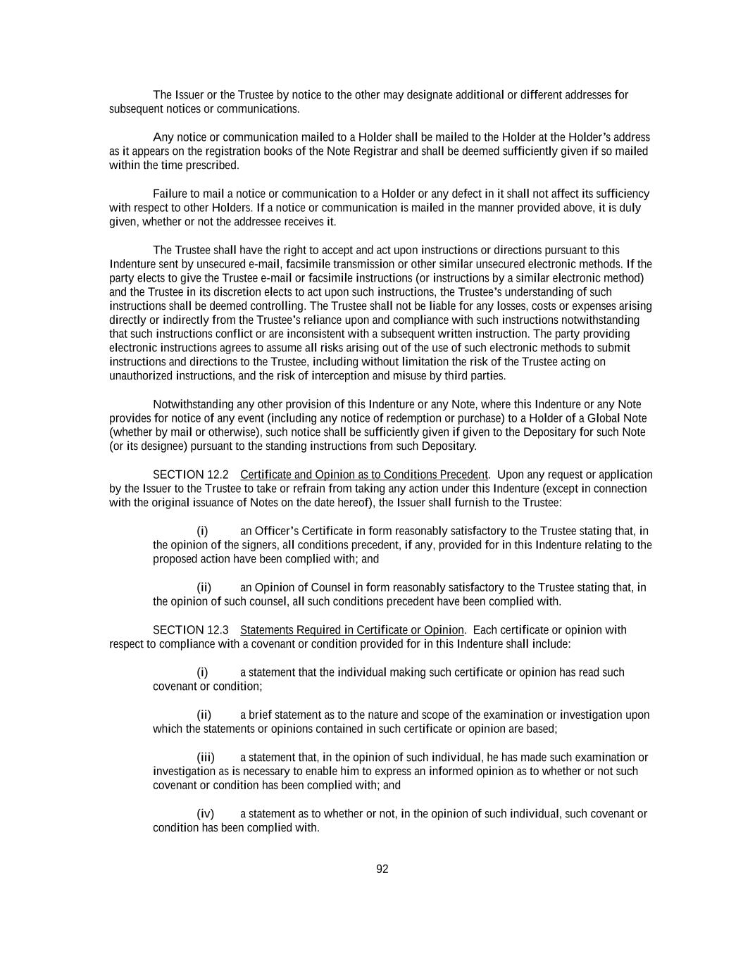 92 The Issuer or the Trustee by notice to the other may designate additional or different addresses for subsequent notices or communications. Any notice or communication mailed to a Holder shall be mailed to the Holder at the Holder’s address as it appears on the registration books of the Note Registrar and shall be deemed sufficiently given if so mailed within the time prescribed. Failure to mail a notice or communication to a Holder or any defect in it shall not affect its sufficiency with respect to other Holders. If a notice or communication is mailed in the manner provided above, it is duly given, whether or not the addressee receives it. The Trustee shall have the right to accept and act upon instructions or directions pursuant to this Indenture sent by unsecured e-mail, facsimile transmission or other similar unsecured electronic methods. If the party elects to give the Trustee e-mail or facsimile instructions (or instructions by a similar electronic method) and the Trustee in its discretion elects to act upon such instructions, the Trustee’s understanding of such instructions shall be deemed controlling. The Trustee shall not be liable for any losses, costs or expenses arising directly or indirectly from the Trustee’s reliance upon and compliance with such instructions notwithstanding that such instructions conflict or are inconsistent with a subsequent written instruction. The party providing electronic instructions agrees to assume all risks arising out of the use of such electronic methods to submit instructions and directions to the Trustee, including without limitation the risk of the Trustee acting on unauthorized instructions, and the risk of interception and misuse by third parties. Notwithstanding any other provision of this Indenture or any Note, where this Indenture or any Note provides for notice of any event (including any notice of redemption or purchase) to a Holder of a Global Note (whether by mail or otherwise), such notice shall be sufficiently given if given to the Depositary for such Note (or its designee) pursuant to the standing instructions from such Depositary. SECTION 12.2 Certificate and Opinion as to Conditions Precedent. Upon any request or application by the Issuer to the Trustee to take or refrain from taking any action under this Indenture (except in connection with the original issuance of Notes on the date hereof), the Issuer shall furnish to the Trustee: (i) an Officer’s Certificate in form reasonably satisfactory to the Trustee stating that, in the opinion of the signers, all conditions precedent, if any, provided for in this Indenture relating to the proposed action have been complied with; and (ii) an Opinion of Counsel in form reasonably satisfactory to the Trustee stating that, in the opinion of such counsel, all such conditions precedent have been complied with. SECTION 12.3 Statements Required in Certificate or Opinion. Each certificate or opinion with respect to compliance with a covenant or condition provided for in this Indenture shall include: (i) a statement that the individual making such certificate or opinion has read such covenant or condition; (ii) a brief statement as to the nature and scope of the examination or investigation upon which the statements or opinions contained in such certificate or opinion are based; (iii) a statement that, in the opinion of such individual, he has made such examination or investigation as is necessary to enable him to express an informed opinion as to whether or not such covenant or condition has been complied with; and (iv) a statement as to whether or not, in the opinion of such individual, such covenant or condition has been complied with.