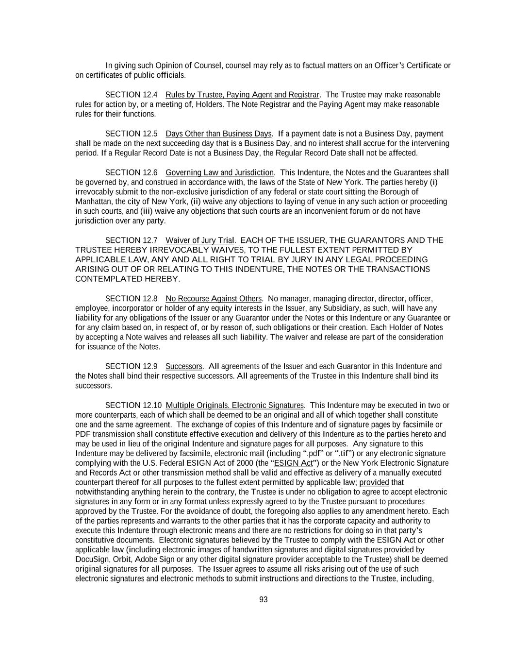 93 In giving such Opinion of Counsel, counsel may rely as to factual matters on an Officer’s Certificate or on certificates of public officials. SECTION 12.4 Rules by Trustee, Paying Agent and Registrar. The Trustee may make reasonable rules for action by, or a meeting of, Holders. The Note Registrar and the Paying Agent may make reasonable rules for their functions. SECTION 12.5 Days Other than Business Days. If a payment date is not a Business Day, payment shall be made on the next succeeding day that is a Business Day, and no interest shall accrue for the intervening period. If a Regular Record Date is not a Business Day, the Regular Record Date shall not be affected. SECTION 12.6 Governing Law and Jurisdiction. This Indenture, the Notes and the Guarantees shall be governed by, and construed in accordance with, the laws of the State of New York. The parties hereby (i) irrevocably submit to the non-exclusive jurisdiction of any federal or state court sitting the Borough of Manhattan, the city of New York, (ii) waive any objections to laying of venue in any such action or proceeding in such courts, and (iii) waive any objections that such courts are an inconvenient forum or do not have jurisdiction over any party. SECTION 12.7 Waiver of Jury Trial. EACH OF THE ISSUER, THE GUARANTORS AND THE TRUSTEE HEREBY IRREVOCABLY WAIVES, TO THE FULLEST EXTENT PERMITTED BY APPLICABLE LAW, ANY AND ALL RIGHT TO TRIAL BY JURY IN ANY LEGAL PROCEEDING ARISING OUT OF OR RELATING TO THIS INDENTURE, THE NOTES OR THE TRANSACTIONS CONTEMPLATED HEREBY. SECTION 12.8 No Recourse Against Others. No manager, managing director, director, officer, employee, incorporator or holder of any equity interests in the Issuer, any Subsidiary, as such, will have any liability for any obligations of the Issuer or any Guarantor under the Notes or this Indenture or any Guarantee or for any claim based on, in respect of, or by reason of, such obligations or their creation. Each Holder of Notes by accepting a Note waives and releases all such liability. The waiver and release are part of the consideration for issuance of the Notes. SECTION 12.9 Successors. All agreements of the Issuer and each Guarantor in this Indenture and the Notes shall bind their respective successors. All agreements of the Trustee in this Indenture shall bind its successors. SECTION 12.10 Multiple Originals. Electronic Signatures. This Indenture may be executed in two or more counterparts, each of which shall be deemed to be an original and all of which together shall constitute one and the same agreement. The exchange of copies of this Indenture and of signature pages by facsimile or PDF transmission shall constitute effective execution and delivery of this Indenture as to the parties hereto and may be used in lieu of the original Indenture and signature pages for all purposes. Any signature to this Indenture may be delivered by facsimile, electronic mail (including “.pdf” or “.tif”) or any electronic signature complying with the U.S. Federal ESIGN Act of 2000 (the “ESIGN Act”) or the New York Electronic Signature and Records Act or other transmission method shall be valid and effective as delivery of a manually executed counterpart thereof for all purposes to the fullest extent permitted by applicable law; provided that notwithstanding anything herein to the contrary, the Trustee is under no obligation to agree to accept electronic signatures in any form or in any format unless expressly agreed to by the Trustee pursuant to procedures approved by the Trustee. For the avoidance of doubt, the foregoing also applies to any amendment hereto. Each of the parties represents and warrants to the other parties that it has the corporate capacity and authority to execute this Indenture through electronic means and there are no restrictions for doing so in that party’s constitutive documents. Electronic signatures believed by the Trustee to comply with the ESIGN Act or other applicable law (including electronic images of handwritten signatures and digital signatures provided by DocuSign, Orbit, Adobe Sign or any other digital signature provider acceptable to the Trustee) shall be deemed original signatures for all purposes. The Issuer agrees to assume all risks arising out of the use of such electronic signatures and electronic methods to submit instructions and directions to the Trustee, including,