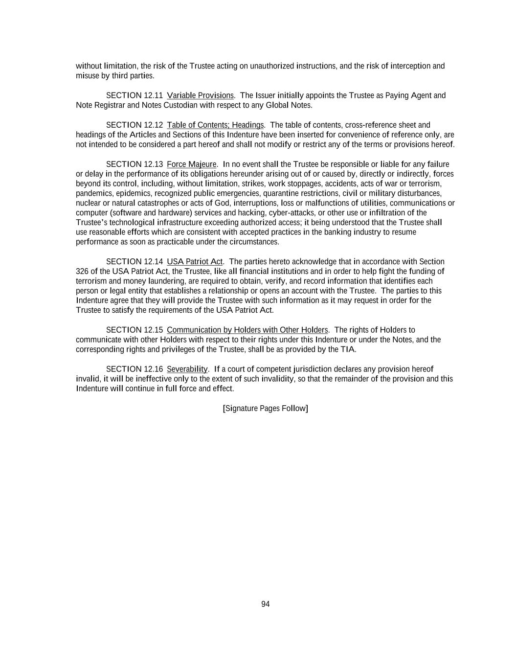 94 without limitation, the risk of the Trustee acting on unauthorized instructions, and the risk of interception and misuse by third parties. SECTION 12.11 Variable Provisions. The Issuer initially appoints the Trustee as Paying Agent and Note Registrar and Notes Custodian with respect to any Global Notes. SECTION 12.12 Table of Contents; Headings. The table of contents, cross-reference sheet and headings of the Articles and Sections of this Indenture have been inserted for convenience of reference only, are not intended to be considered a part hereof and shall not modify or restrict any of the terms or provisions hereof. SECTION 12.13 Force Majeure. In no event shall the Trustee be responsible or liable for any failure or delay in the performance of its obligations hereunder arising out of or caused by, directly or indirectly, forces beyond its control, including, without limitation, strikes, work stoppages, accidents, acts of war or terrorism, pandemics, epidemics, recognized public emergencies, quarantine restrictions, civil or military disturbances, nuclear or natural catastrophes or acts of God, interruptions, loss or malfunctions of utilities, communications or computer (software and hardware) services and hacking, cyber-attacks, or other use or infiltration of the Trustee’s technological infrastructure exceeding authorized access; it being understood that the Trustee shall use reasonable efforts which are consistent with accepted practices in the banking industry to resume performance as soon as practicable under the circumstances. SECTION 12.14 USA Patriot Act. The parties hereto acknowledge that in accordance with Section 326 of the USA Patriot Act, the Trustee, like all financial institutions and in order to help fight the funding of terrorism and money laundering, are required to obtain, verify, and record information that identifies each person or legal entity that establishes a relationship or opens an account with the Trustee. The parties to this Indenture agree that they will provide the Trustee with such information as it may request in order for the Trustee to satisfy the requirements of the USA Patriot Act. SECTION 12.15 Communication by Holders with Other Holders. The rights of Holders to communicate with other Holders with respect to their rights under this Indenture or under the Notes, and the corresponding rights and privileges of the Trustee, shall be as provided by the TIA. SECTION 12.16 Severability. If a court of competent jurisdiction declares any provision hereof invalid, it will be ineffective only to the extent of such invalidity, so that the remainder of the provision and this Indenture will continue in full force and effect. [Signature Pages Follow]