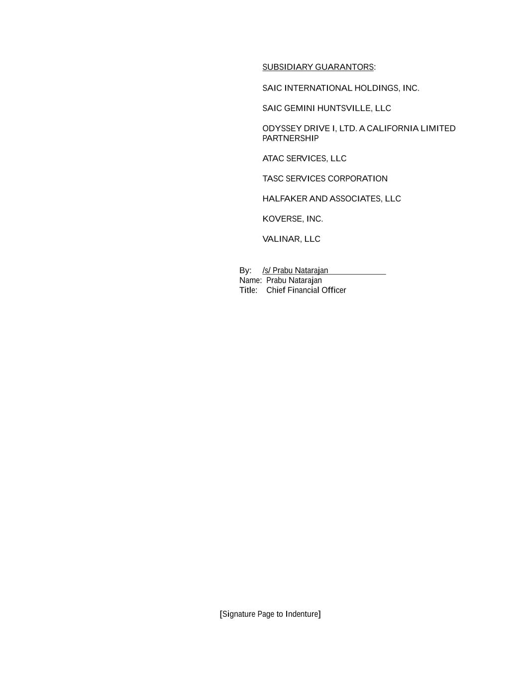 [Signature Page to Indenture] SUBSIDIARY GUARANTORS: SAIC INTERNATIONAL HOLDINGS, INC. SAIC GEMINI HUNTSVILLE, LLC ODYSSEY DRIVE I, LTD. A CALIFORNIA LIMITED PARTNERSHIP ATAC SERVICES, LLC TASC SERVICES CORPORATION HALFAKER AND ASSOCIATES, LLC KOVERSE, INC. VALINAR, LLC By: /s/ Prabu Natarajan Name: Prabu Natarajan Title: Chief Financial Officer