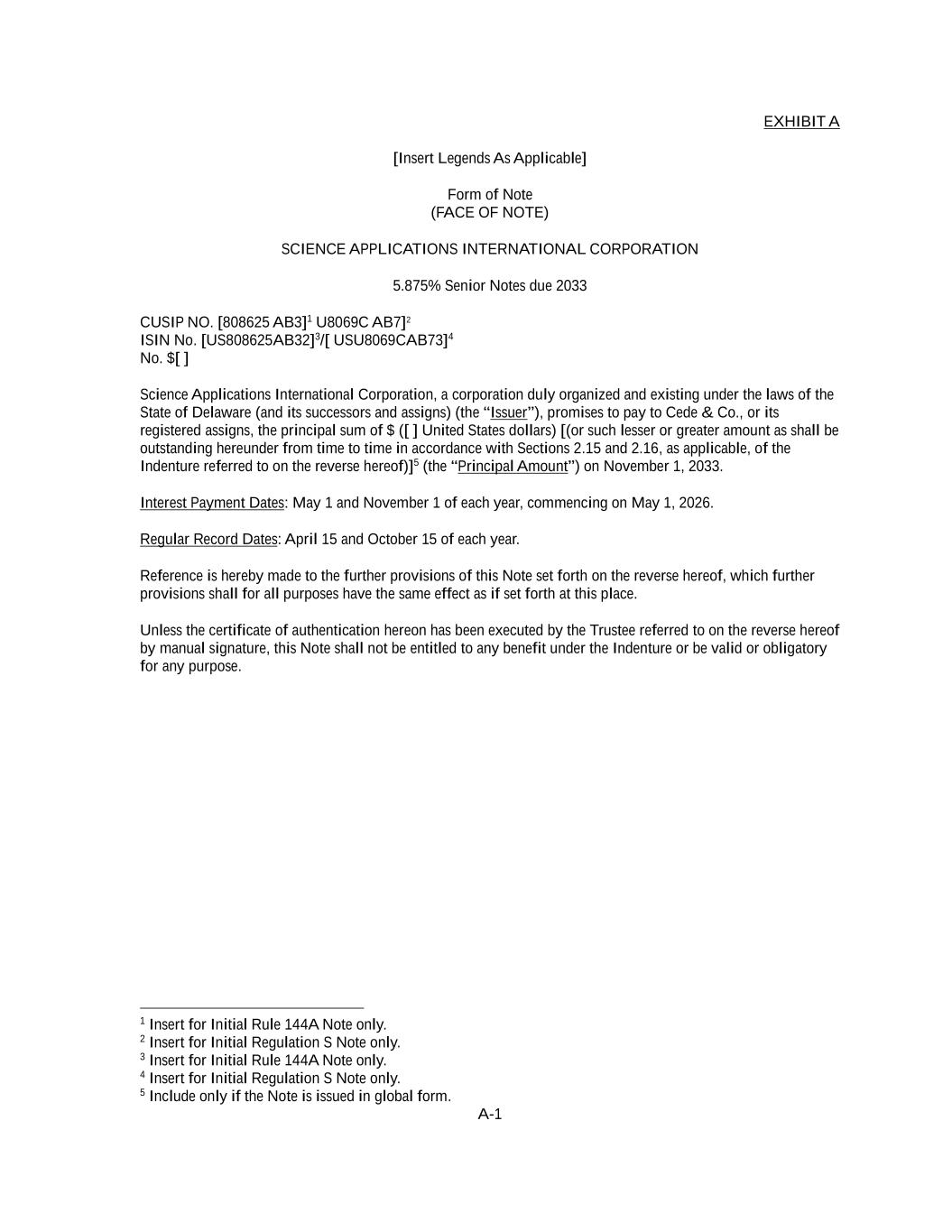A-1 EXHIBIT A [Insert Legends As Applicable] Form of Note (FACE OF NOTE) SCIENCE APPLICATIONS INTERNATIONAL CORPORATION 5.875% Senior Notes due 2033 CUSIP NO. [808625 AB3]1 U8069C AB7]2 ISIN No. [US808625AB32]3/[ USU8069CAB73]4 No. $[ ] Science Applications International Corporation, a corporation duly organized and existing under the laws of the State of Delaware (and its successors and assigns) (the “Issuer”), promises to pay to Cede & Co., or its registered assigns, the principal sum of $ ([ ] United States dollars) [(or such lesser or greater amount as shall be outstanding hereunder from time to time in accordance with Sections 2.15 and 2.16, as applicable, of the Indenture referred to on the reverse hereof)]5 (the “Principal Amount”) on November 1, 2033. Interest Payment Dates: May 1 and November 1 of each year, commencing on May 1, 2026. Regular Record Dates: April 15 and October 15 of each year. Reference is hereby made to the further provisions of this Note set forth on the reverse hereof, which further provisions shall for all purposes have the same effect as if set forth at this place. Unless the certificate of authentication hereon has been executed by the Trustee referred to on the reverse hereof by manual signature, this Note shall not be entitled to any benefit under the Indenture or be valid or obligatory for any purpose. 1 Insert for Initial Rule 144A Note only. 2 Insert for Initial Regulation S Note only. 3 Insert for Initial Rule 144A Note only. 4 Insert for Initial Regulation S Note only. 5 Include only if the Note is issued in global form.