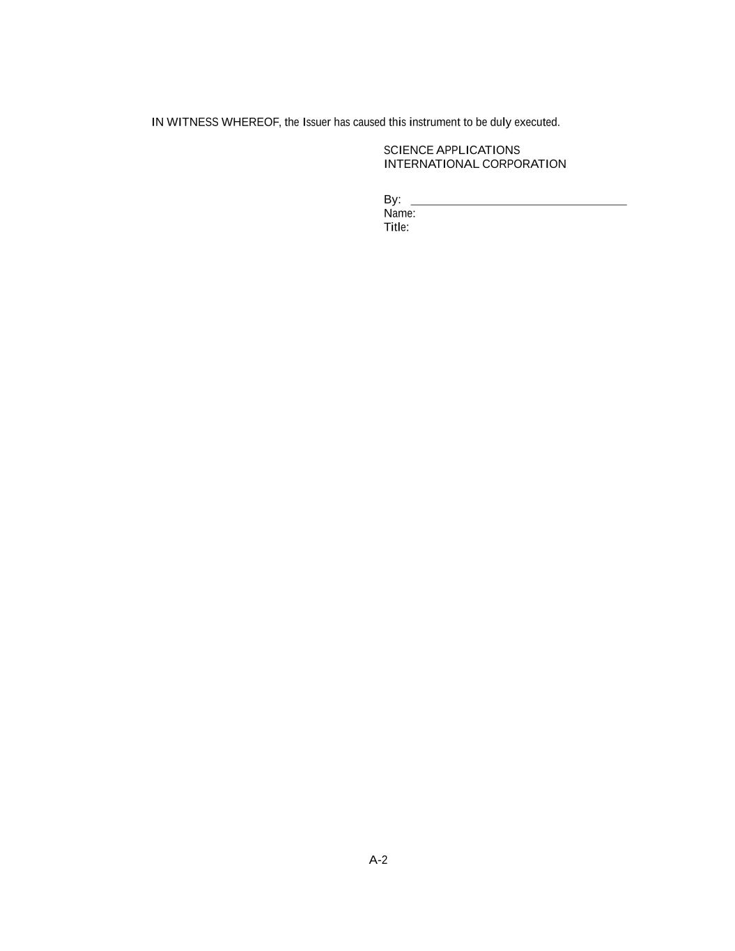 A-2 IN WITNESS WHEREOF, the Issuer has caused this instrument to be duly executed. SCIENCE APPLICATIONS INTERNATIONAL CORPORATION By: Name: Title:
