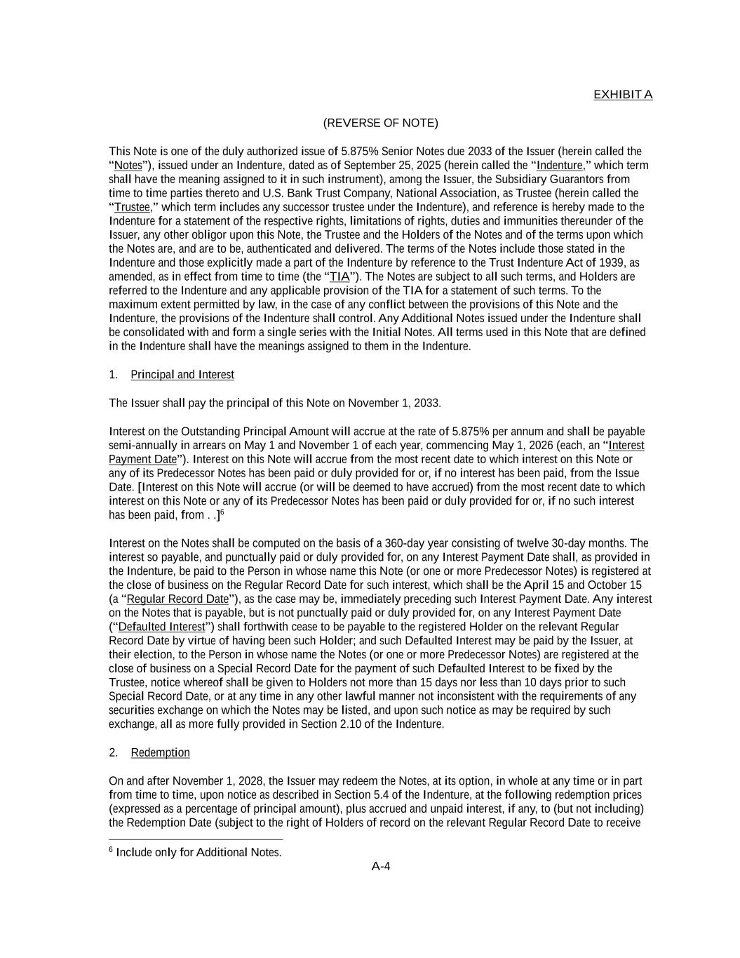 A-4 EXHIBIT A (REVERSE OF NOTE) This Note is one of the duly authorized issue of 5.875% Senior Notes due 2033 of the Issuer (herein called the “Notes”), issued under an Indenture, dated as of September 25, 2025 (herein called the “Indenture,” which term shall have the meaning assigned to it in such instrument), among the Issuer, the Subsidiary Guarantors from time to time parties thereto and U.S. Bank Trust Company, National Association, as Trustee (herein called the “Trustee,” which term includes any successor trustee under the Indenture), and reference is hereby made to the Indenture for a statement of the respective rights, limitations of rights, duties and immunities thereunder of the Issuer, any other obligor upon this Note, the Trustee and the Holders of the Notes and of the terms upon which the Notes are, and are to be, authenticated and delivered. The terms of the Notes include those stated in the Indenture and those explicitly made a part of the Indenture by reference to the Trust Indenture Act of 1939, as amended, as in effect from time to time (the “TIA”). The Notes are subject to all such terms, and Holders are referred to the Indenture and any applicable provision of the TIA for a statement of such terms. To the maximum extent permitted by law, in the case of any conflict between the provisions of this Note and the Indenture, the provisions of the Indenture shall control. Any Additional Notes issued under the Indenture shall be consolidated with and form a single series with the Initial Notes. All terms used in this Note that are defined in the Indenture shall have the meanings assigned to them in the Indenture. 1. Principal and Interest The Issuer shall pay the principal of this Note on November 1, 2033. Interest on the Outstanding Principal Amount will accrue at the rate of 5.875% per annum and shall be payable semi-annually in arrears on May 1 and November 1 of each year, commencing May 1, 2026 (each, an “Interest Payment Date”). Interest on this Note will accrue from the most recent date to which interest on this Note or any of its Predecessor Notes has been paid or duly provided for or, if no interest has been paid, from the Issue Date. [Interest on this Note will accrue (or will be deemed to have accrued) from the most recent date to which interest on this Note or any of its Predecessor Notes has been paid or duly provided for or, if no such interest has been paid, from . .]6 Interest on the Notes shall be computed on the basis of a 360-day year consisting of twelve 30-day months. The interest so payable, and punctually paid or duly provided for, on any Interest Payment Date shall, as provided in the Indenture, be paid to the Person in whose name this Note (or one or more Predecessor Notes) is registered at the close of business on the Regular Record Date for such interest, which shall be the April 15 and October 15 (a “Regular Record Date”), as the case may be, immediately preceding such Interest Payment Date. Any interest on the Notes that is payable, but is not punctually paid or duly provided for, on any Interest Payment Date (“Defaulted Interest”) shall forthwith cease to be payable to the registered Holder on the relevant Regular Record Date by virtue of having been such Holder; and such Defaulted Interest may be paid by the Issuer, at their election, to the Person in whose name the Notes (or one or more Predecessor Notes) are registered at the close of business on a Special Record Date for the payment of such Defaulted Interest to be fixed by the Trustee, notice whereof shall be given to Holders not more than 15 days nor less than 10 days prior to such Special Record Date, or at any time in any other lawful manner not inconsistent with the requirements of any securities exchange on which the Notes may be listed, and upon such notice as may be required by such exchange, all as more fully provided in Section 2.10 of the Indenture. 2. Redemption On and after November 1, 2028, the Issuer may redeem the Notes, at its option, in whole at any time or in part from time to time, upon notice as described in Section 5.4 of the Indenture, at the following redemption prices (expressed as a percentage of principal amount), plus accrued and unpaid interest, if any, to (but not including) the Redemption Date (subject to the right of Holders of record on the relevant Regular Record Date to receive 6 Include only for Additional Notes.
