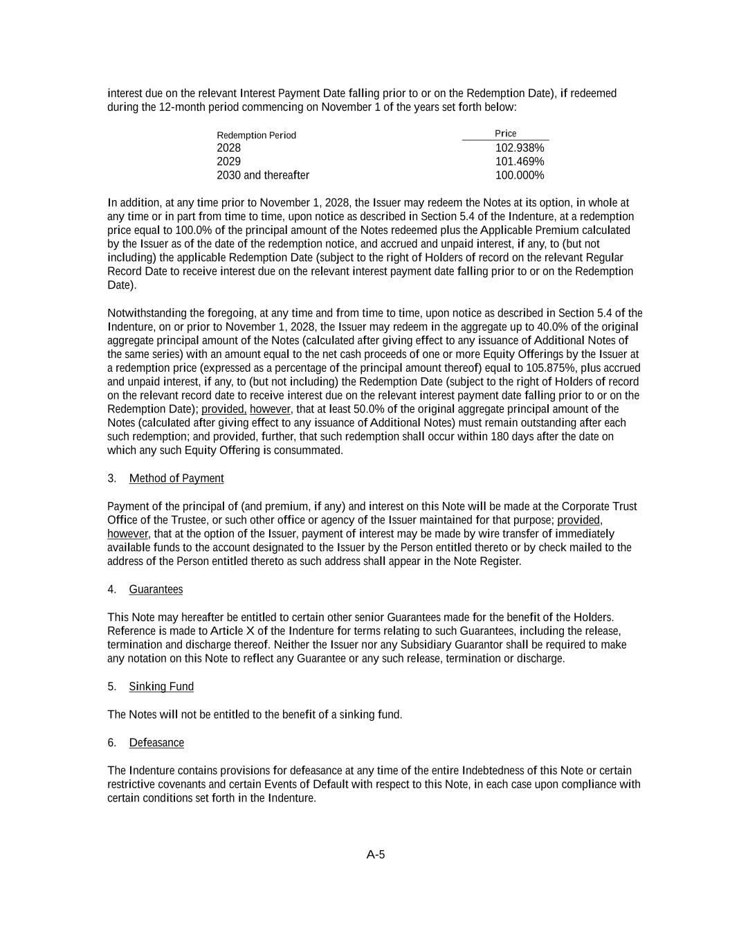 A-5 interest due on the relevant Interest Payment Date falling prior to or on the Redemption Date), if redeemed during the 12-month period commencing on November 1 of the years set forth below: Redemption Period Price 2028 102.938% 2029 101.469% 2030 and thereafter 100.000% In addition, at any time prior to November 1, 2028, the Issuer may redeem the Notes at its option, in whole at any time or in part from time to time, upon notice as described in Section 5.4 of the Indenture, at a redemption price equal to 100.0% of the principal amount of the Notes redeemed plus the Applicable Premium calculated by the Issuer as of the date of the redemption notice, and accrued and unpaid interest, if any, to (but not including) the applicable Redemption Date (subject to the right of Holders of record on the relevant Regular Record Date to receive interest due on the relevant interest payment date falling prior to or on the Redemption Date). Notwithstanding the foregoing, at any time and from time to time, upon notice as described in Section 5.4 of the Indenture, on or prior to November 1, 2028, the Issuer may redeem in the aggregate up to 40.0% of the original aggregate principal amount of the Notes (calculated after giving effect to any issuance of Additional Notes of the same series) with an amount equal to the net cash proceeds of one or more Equity Offerings by the Issuer at a redemption price (expressed as a percentage of the principal amount thereof) equal to 105.875%, plus accrued and unpaid interest, if any, to (but not including) the Redemption Date (subject to the right of Holders of record on the relevant record date to receive interest due on the relevant interest payment date falling prior to or on the Redemption Date); provided, however, that at least 50.0% of the original aggregate principal amount of the Notes (calculated after giving effect to any issuance of Additional Notes) must remain outstanding after each such redemption; and provided, further, that such redemption shall occur within 180 days after the date on which any such Equity Offering is consummated. 3. Method of Payment Payment of the principal of (and premium, if any) and interest on this Note will be made at the Corporate Trust Office of the Trustee, or such other office or agency of the Issuer maintained for that purpose; provided, however, that at the option of the Issuer, payment of interest may be made by wire transfer of immediately available funds to the account designated to the Issuer by the Person entitled thereto or by check mailed to the address of the Person entitled thereto as such address shall appear in the Note Register. 4. Guarantees This Note may hereafter be entitled to certain other senior Guarantees made for the benefit of the Holders. Reference is made to Article X of the Indenture for terms relating to such Guarantees, including the release, termination and discharge thereof. Neither the Issuer nor any Subsidiary Guarantor shall be required to make any notation on this Note to reflect any Guarantee or any such release, termination or discharge. 5. Sinking Fund The Notes will not be entitled to the benefit of a sinking fund. 6. Defeasance The Indenture contains provisions for defeasance at any time of the entire Indebtedness of this Note or certain restrictive covenants and certain Events of Default with respect to this Note, in each case upon compliance with certain conditions set forth in the Indenture.