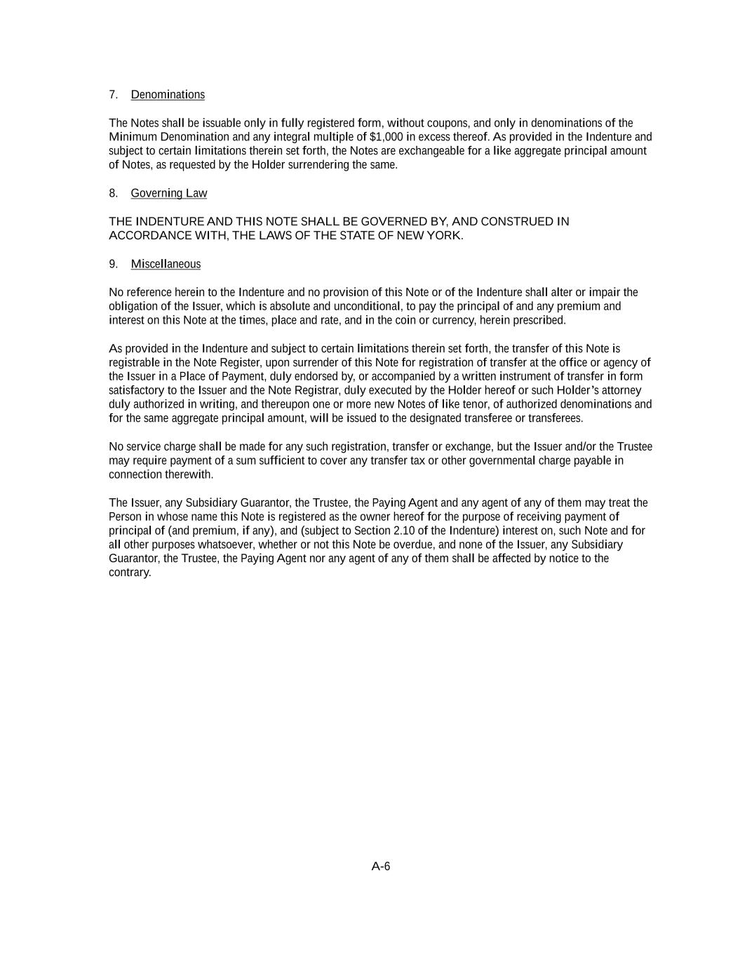 A-6 7. Denominations The Notes shall be issuable only in fully registered form, without coupons, and only in denominations of the Minimum Denomination and any integral multiple of $1,000 in excess thereof. As provided in the Indenture and subject to certain limitations therein set forth, the Notes are exchangeable for a like aggregate principal amount of Notes, as requested by the Holder surrendering the same. 8. Governing Law THE INDENTURE AND THIS NOTE SHALL BE GOVERNED BY, AND CONSTRUED IN ACCORDANCE WITH, THE LAWS OF THE STATE OF NEW YORK. 9. Miscellaneous No reference herein to the Indenture and no provision of this Note or of the Indenture shall alter or impair the obligation of the Issuer, which is absolute and unconditional, to pay the principal of and any premium and interest on this Note at the times, place and rate, and in the coin or currency, herein prescribed. As provided in the Indenture and subject to certain limitations therein set forth, the transfer of this Note is registrable in the Note Register, upon surrender of this Note for registration of transfer at the office or agency of the Issuer in a Place of Payment, duly endorsed by, or accompanied by a written instrument of transfer in form satisfactory to the Issuer and the Note Registrar, duly executed by the Holder hereof or such Holder’s attorney duly authorized in writing, and thereupon one or more new Notes of like tenor, of authorized denominations and for the same aggregate principal amount, will be issued to the designated transferee or transferees. No service charge shall be made for any such registration, transfer or exchange, but the Issuer and/or the Trustee may require payment of a sum sufficient to cover any transfer tax or other governmental charge payable in connection therewith. The Issuer, any Subsidiary Guarantor, the Trustee, the Paying Agent and any agent of any of them may treat the Person in whose name this Note is registered as the owner hereof for the purpose of receiving payment of principal of (and premium, if any), and (subject to Section 2.10 of the Indenture) interest on, such Note and for all other purposes whatsoever, whether or not this Note be overdue, and none of the Issuer, any Subsidiary Guarantor, the Trustee, the Paying Agent nor any agent of any of them shall be affected by notice to the contrary.