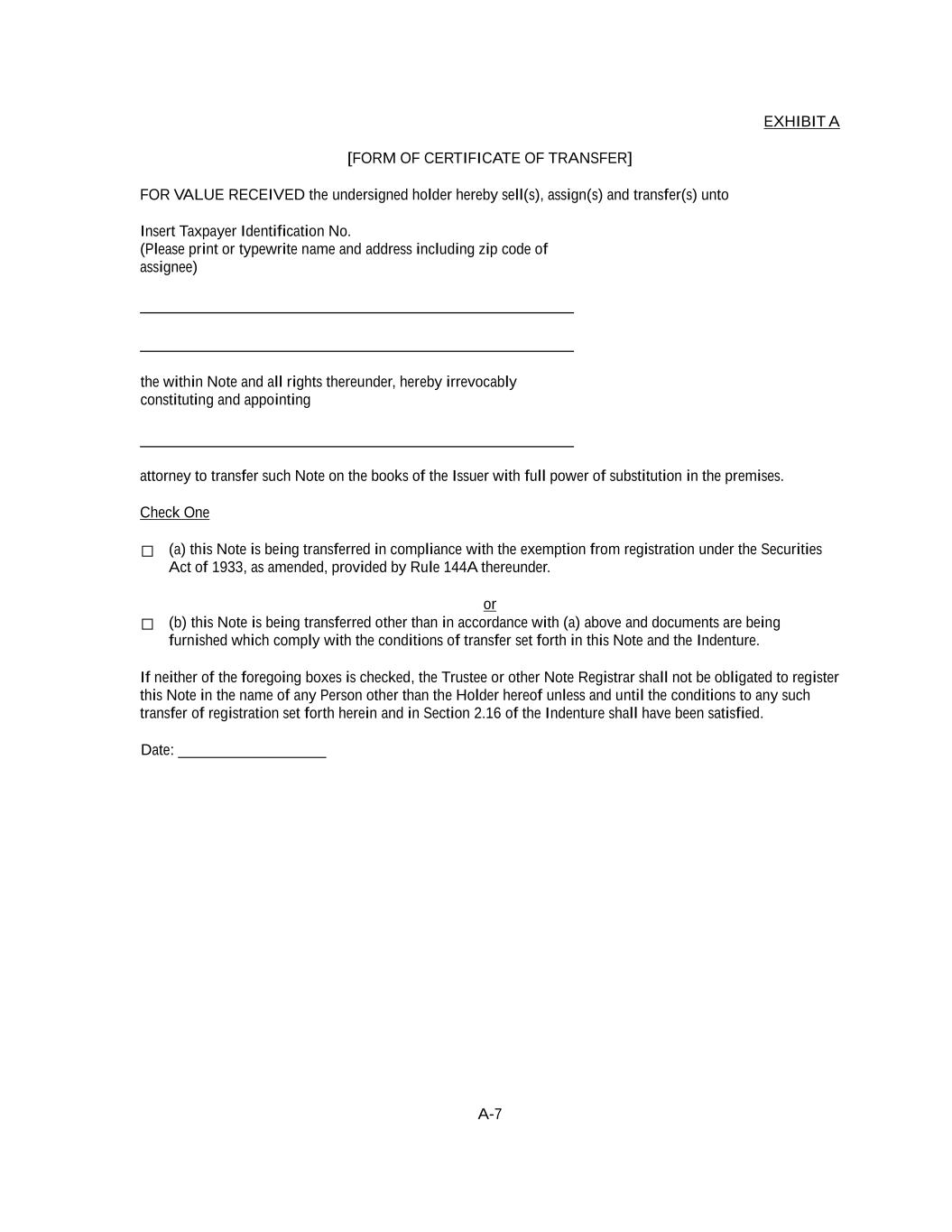 A-7 EXHIBIT A [FORM OF CERTIFICATE OF TRANSFER] FOR VALUE RECEIVED the undersigned holder hereby sell(s), assign(s) and transfer(s) unto Insert Taxpayer Identification No. (Please print or typewrite name and address including zip code of assignee) the within Note and all rights thereunder, hereby irrevocably constituting and appointing attorney to transfer such Note on the books of the Issuer with full power of substitution in the premises. Check One ☐ (a) this Note is being transferred in compliance with the exemption from registration under the Securities Act of 1933, as amended, provided by Rule 144A thereunder. or ☐ (b) this Note is being transferred other than in accordance with (a) above and documents are being furnished which comply with the conditions of transfer set forth in this Note and the Indenture. If neither of the foregoing boxes is checked, the Trustee or other Note Registrar shall not be obligated to register this Note in the name of any Person other than the Holder hereof unless and until the conditions to any such transfer of registration set forth herein and in Section 2.16 of the Indenture shall have been satisfied. Date: ___________________