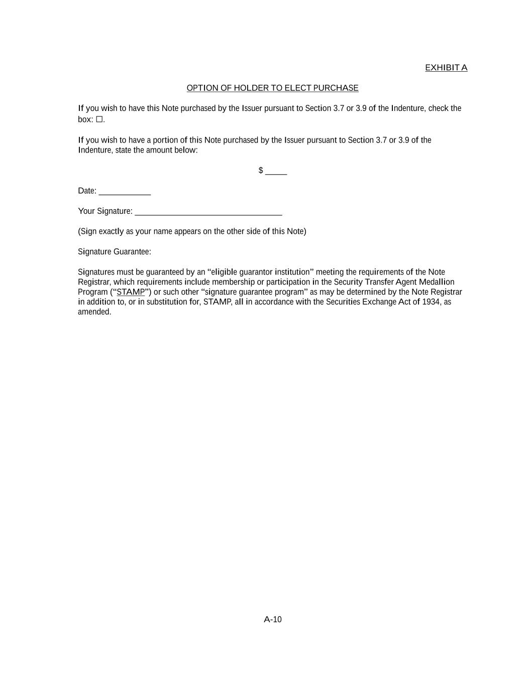 A-10 EXHIBIT A OPTION OF HOLDER TO ELECT PURCHASE If you wish to have this Note purchased by the Issuer pursuant to Section 3.7 or 3.9 of the Indenture, check the box: ☐. If you wish to have a portion of this Note purchased by the Issuer pursuant to Section 3.7 or 3.9 of the Indenture, state the amount below: $ _____ Date: ____________ Your Signature: __________________________________ (Sign exactly as your name appears on the other side of this Note) Signature Guarantee: Signatures must be guaranteed by an “eligible guarantor institution” meeting the requirements of the Note Registrar, which requirements include membership or participation in the Security Transfer Agent Medallion Program (“STAMP”) or such other “signature guarantee program” as may be determined by the Note Registrar in addition to, or in substitution for, STAMP, all in accordance with the Securities Exchange Act of 1934, as amended.