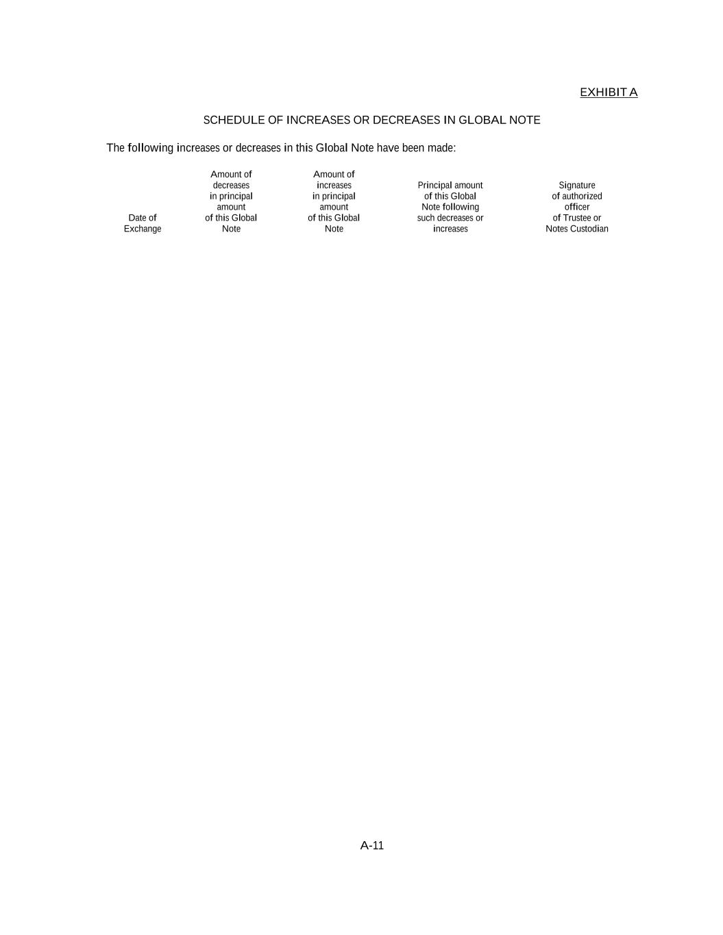 A-11 EXHIBIT A SCHEDULE OF INCREASES OR DECREASES IN GLOBAL NOTE The following increases or decreases in this Global Note have been made: Date of Exchange Amount of decreases in principal amount of this Global Note Amount of increases in principal amount of this Global Note Principal amount of this Global Note following such decreases or increases Signature of authorized officer of Trustee or Notes Custodian