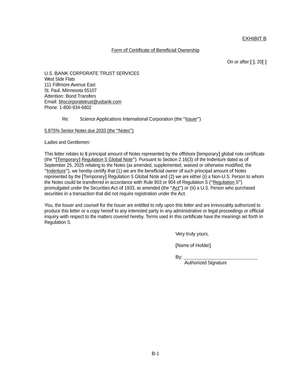 B-1 EXHIBIT B Form of Certificate of Beneficial Ownership On or after [ ], 20[ ] U.S. BANK CORPORATE TRUST SERVICES West Side Flats 111 Fillmore Avenue East St. Paul, Minnesota 55107 Attention: Bond Transfers Email: bhscorporatetrust@usbank.com Phone: 1-800-934-6802 Re: Science Applications International Corporation (the “Issuer”) 5.875% Senior Notes due 2033 (the “Notes”) Ladies and Gentlemen: This letter relates to $ principal amount of Notes represented by the offshore [temporary] global note certificate (the “[Temporary] Regulation S Global Note”). Pursuant to Section 2.16(3) of the Indenture dated as of September 25, 2025 relating to the Notes (as amended, supplemented, waived or otherwise modified, the “Indenture”), we hereby certify that (1) we are the beneficial owner of such principal amount of Notes represented by the [Temporary] Regulation S Global Note and (2) we are either (i) a Non-U.S. Person to whom the Notes could be transferred in accordance with Rule 903 or 904 of Regulation S (“Regulation S”) promulgated under the Securities Act of 1933, as amended (the “Act”) or (ii) a U.S. Person who purchased securities in a transaction that did not require registration under the Act. You, the Issuer and counsel for the Issuer are entitled to rely upon this letter and are irrevocably authorized to produce this letter or a copy hereof to any interested party in any administrative or legal proceedings or official inquiry with respect to the matters covered hereby. Terms used in this certificate have the meanings set forth in Regulation S. Very truly yours, [Name of Holder] By: Authorized Signature